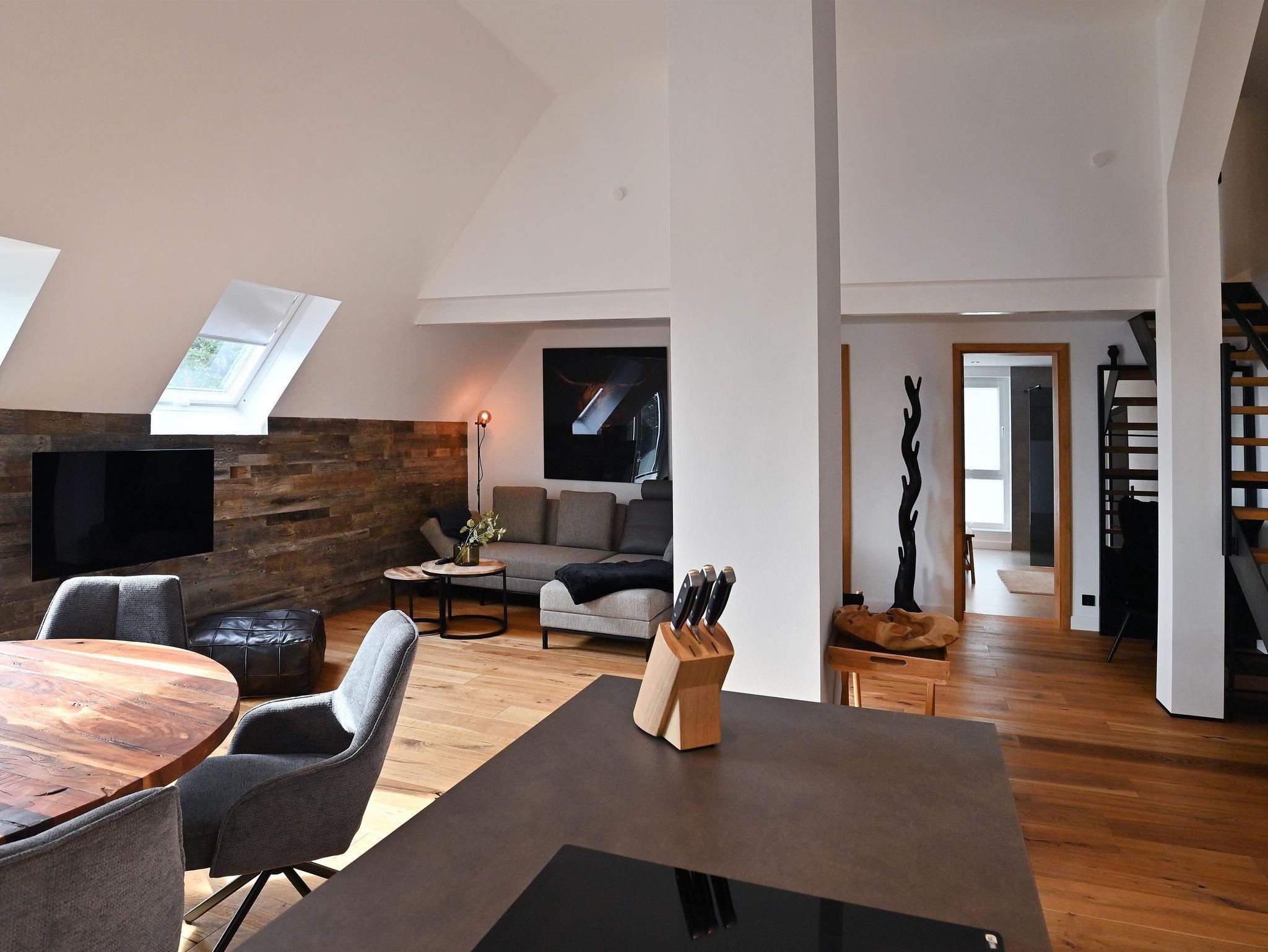 Die moderne Küche lädt zum ausgiebigen Kochen ein, der runde Esstisch bietet Platz für sechs Personen und ist ideal für gemeinsame Mahlzeiten. Echtholzböden und -türen verleihen der Wohnung eine warme Atmosphäre. Praktische Annehmlichkeiten wie Waschmaschine und Trockner sind ebenfalls vorhanden.