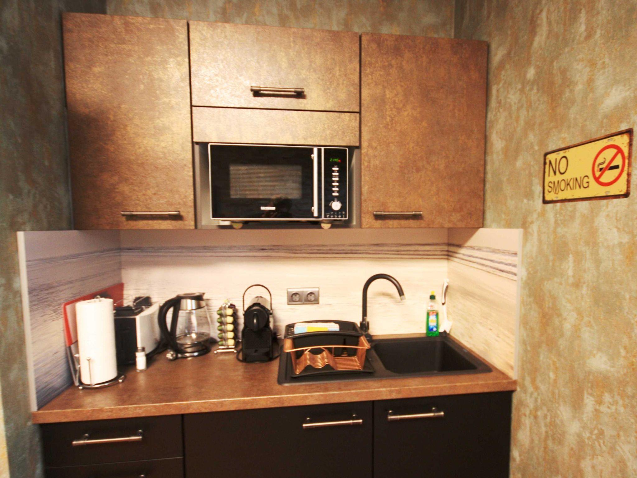 • Küchenzeile mit Kühlschrank mit Gefrierfach, Mikrowelle mit Grill- und Heißluftfunktion, Kaffeemaschine, Toaster, etc.