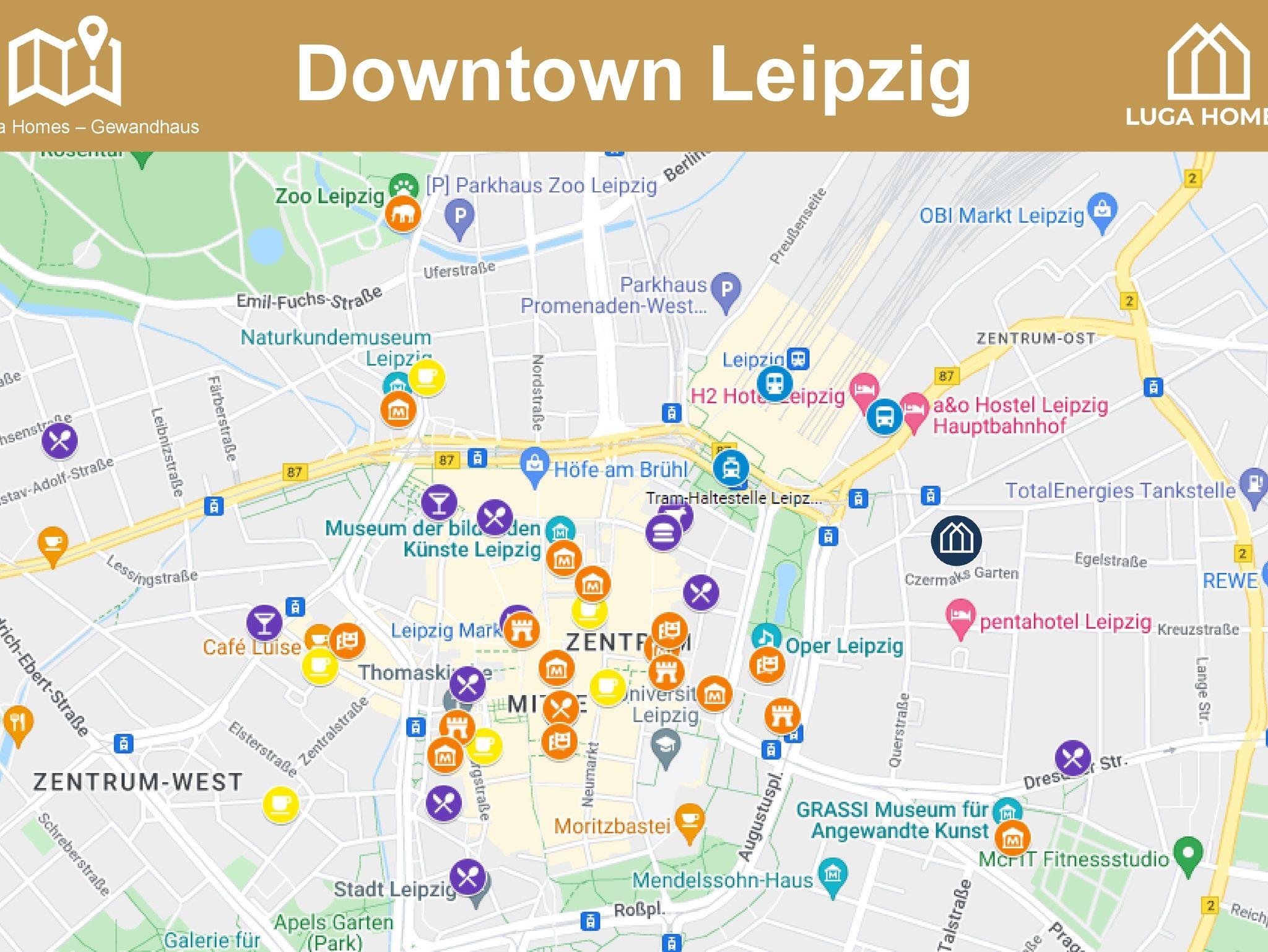 Also auf ins bunte Treiben! Keine 5 Gehminuten brauchst Du zu Leipzigs Kulturattraktionen wie dem Gewandhaus und der Oper am Augustusplatz. Nur ein paar Schritte mehr bringen Dich in die historische Altstadt mit vielen Sehenswürdigkeiten, kulinarischen Leckerbissen und Einkaufsmöglichkeiten.