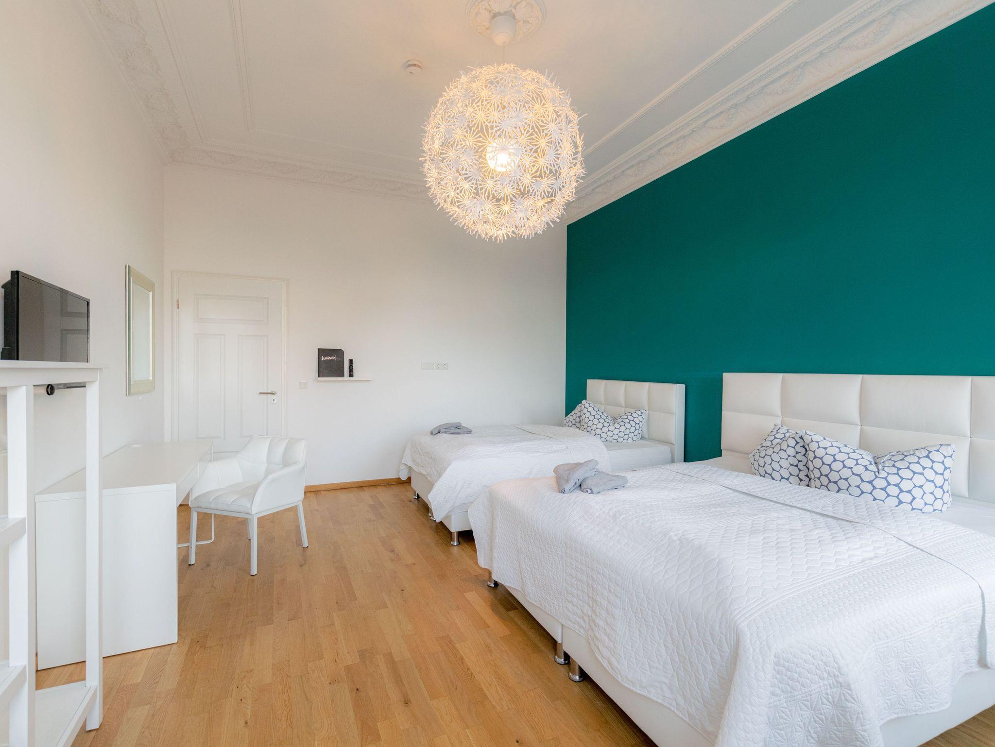 Du suchst nach einem Zimmer mit dem gewissen Etwas und hast mehr als vier Personen im Schlepptau? Keine Sorge, deine Suche hat ein Ende: Hier erwartet Dich nämlich eine geschmackvolle Unterkunft für sechs Personen. Für wenig Geld bekommst Du sogar Appartementflair! Im großen Zimmer finden vier Deiner Reisetruppe großzügig Platz und das kleinere Schlafzimmer nimmt es mit den restlichen Beiden locker auf. In strahlendem Weiß gehalten, überzeugen beide Räume durch die historisch hohen Decken und Fenster des Altbaus mit viel Licht. Mit zweckmäßiger, ruhevoller Einrichtung und einem Hauch spritzigem Türkis wird eine erholsame Atmosphäre geschaffen, die den Trubel der Großstadt draußen lässt. Im Badezimmer glänzen neue Ausstattung und elegantes Design um die Wette. Sechs auf einen Streich für einen klasse Preis mit Flair! Was will man mehr?
