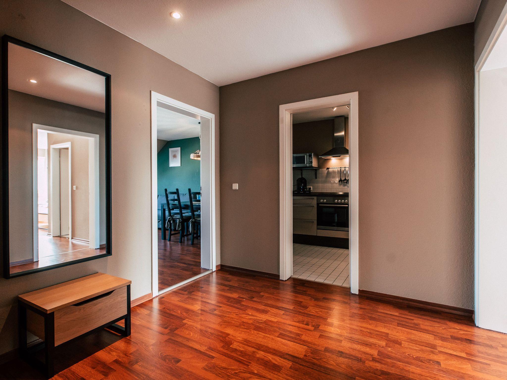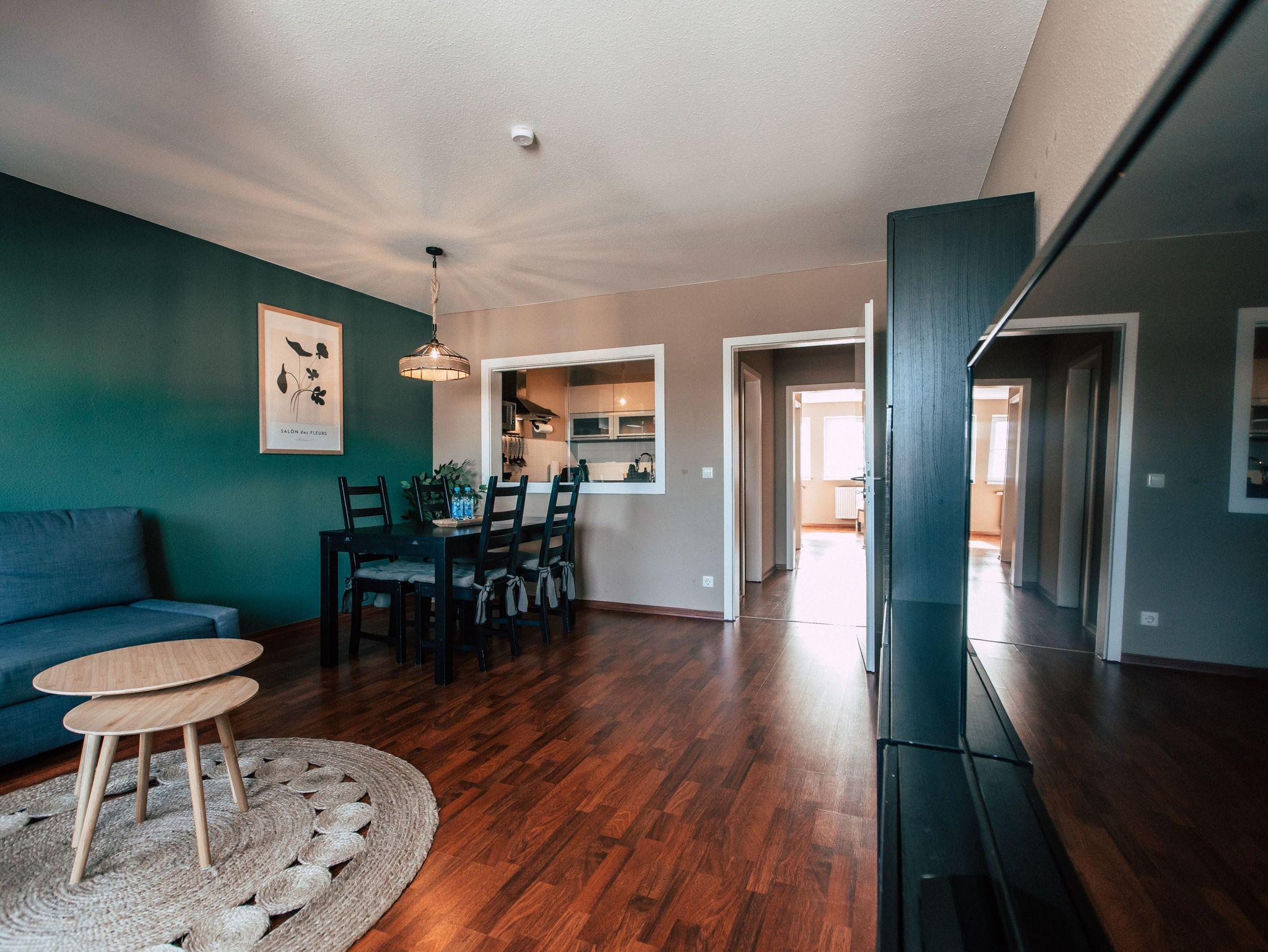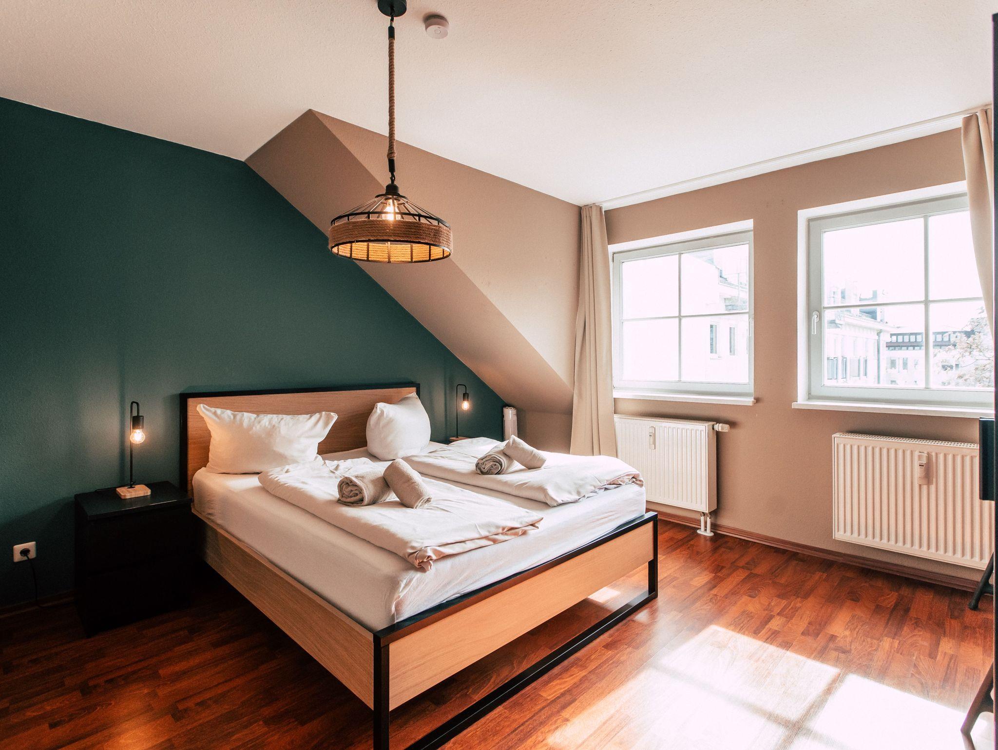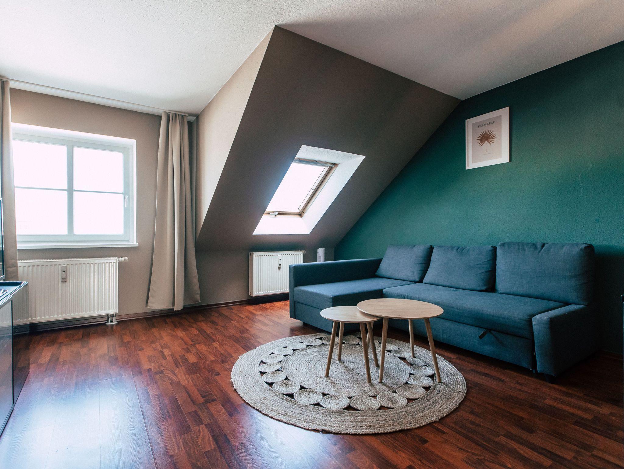 Ein Katzensprung vom Gewandhaus und der wunderschönen Altstadt, erwartet dich hier im Dachgeschoss eines charmanten Mehrfamilienhauses im Neugründerstil eine einladende Wohnung mit viel Platz. Der große Flur führt in das nach hinten gelegene, ruhige Schlafzimmer. Gegenüber bietet das stilvolle Wohnzimmer in dunklen Farben einen angenehmen Rückzugsort hoch oben. Die gemütliche Couch kann auch zum Schlafplatz für zwei weitere Gäste werden. Ein großer Esstisch lädt zum gemeinsamen Essen ein, in der separaten Küche mit praktischer Durchreiche findet man alles, was man braucht und kann sich super selbst versorgen. Das Badezimmer mit Duschwanne neben dem Schlafzimmer wird durch ein separates WC im Eingangsbereich ergänzt.