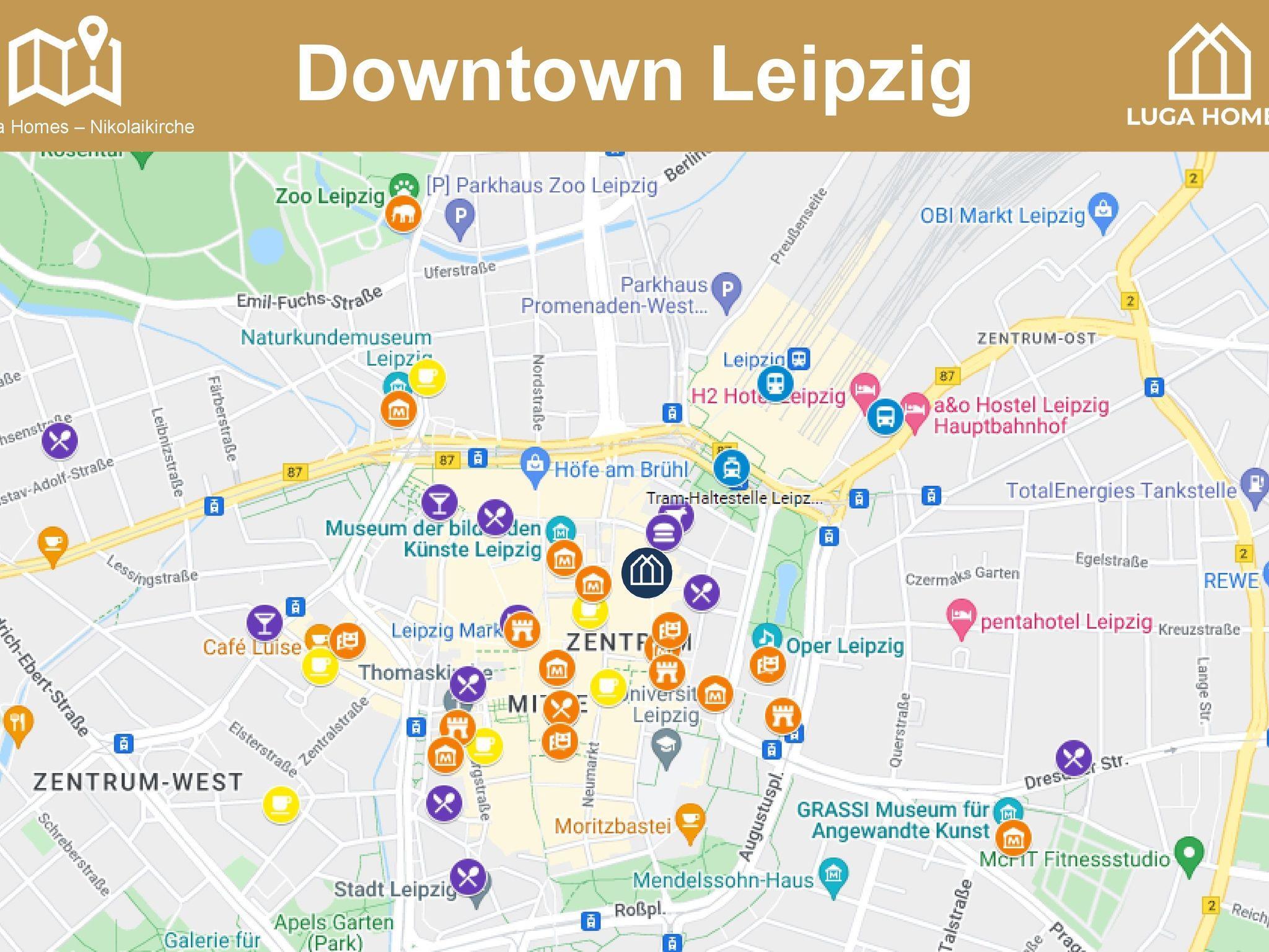 Die Appartements liegen mitten im Herzen der reizenden Stadt Leipzig. Im Nu bist Du am prachtvollen Hauptbahnhof mit Einkaufsmeile und vielfältigem Nahverkehrsangebot, das Dich mit Leichtigkeit an alle Ecken und Enden der Stadt bringt. Auch der beliebte Leipziger Zoo ist buchstäblich um die Ecke. Nur wenige Schritte mehr bringen Dich in den historischen Stadtkern mit dem alten Rathaus, vielen kunstvollen Fassaden und Sehenswürdigkeiten, unzähligen Shoppingmöglichkeiten und natürlich so einigen kulinarischen Verlockungen. Doch Leipzig hat weit mehr Asse im Ärmel! Die bekannte Leipziger Messe ist gut zu erreichen und Schauplatz verschiedenster Events; Geschichte aufspüren kannst Du an Orten wie dem beeindruckenden Völkerschlachtdenkmal oder Goethes ?Auerbachs Keller?; Auf der Schlemmer- und Flaniermeile Karli oder im Werk 2 und dem Kunstkraftwerk Plagwitz kannst Du Dich von der jungen, künstlerischen Szene Leipzigs in bunte Welten entführen lassen; Und auf einer erfrischenden Bootstour durch Leipzigs Kanäle kannst Du Dich von der grünen Seite der Stadt überraschen und Dich bis zu den idyllischen Seen im Umland treiben lassen. Leipzigs Facettenreichtum wird Dich begeistern!