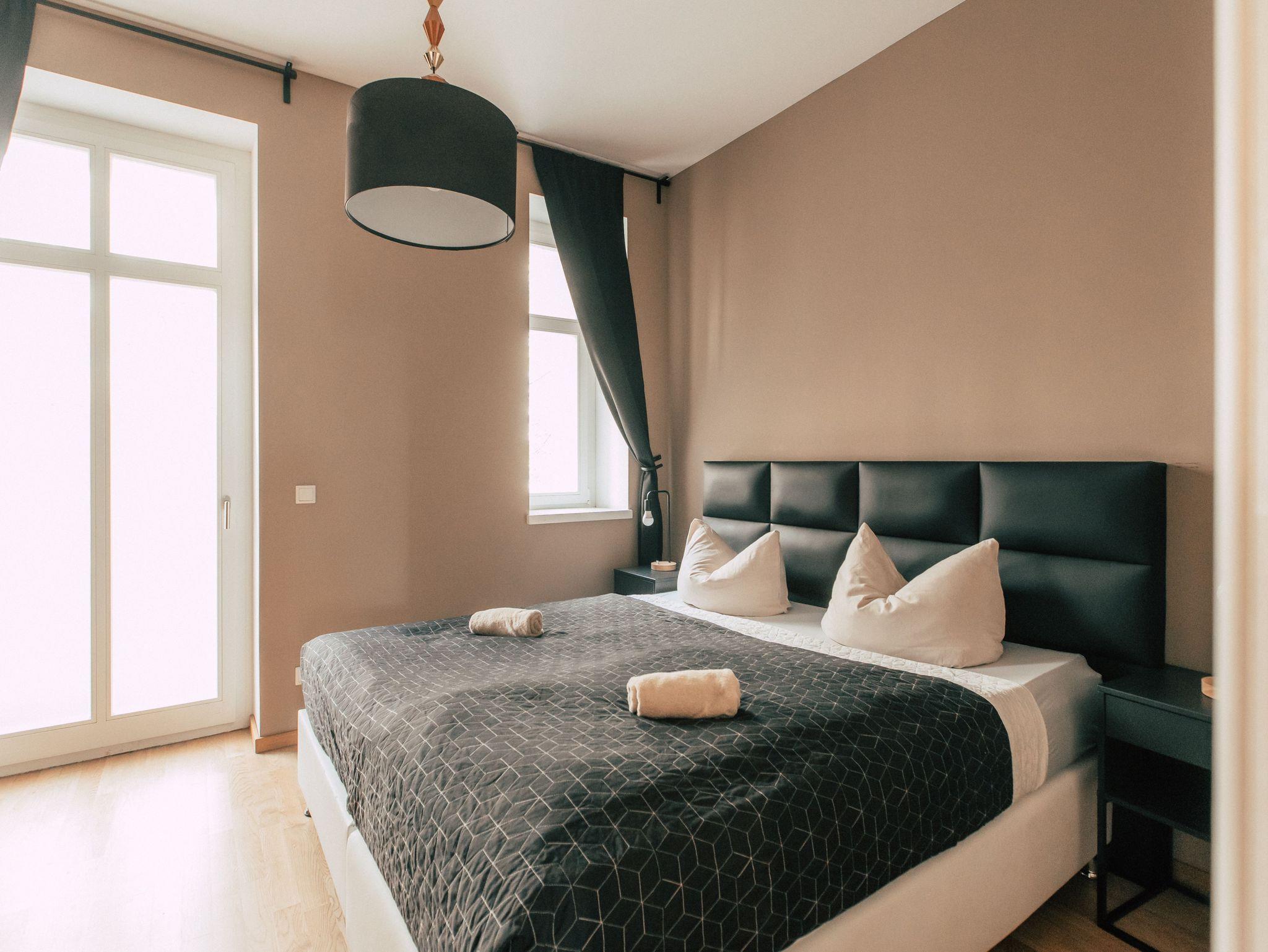 Viel Raum, hohe Decken und prachtvoller Stuck treffen auf modernen, veredelten Boho-chic ? ein absoluter Hingucker! Vom geräumigen Flur kommt man in das helle Schlaf- und Wohnzimmer. Holz und andere Naturmaterialien in warmen Farben, erfrischendes Grün und lässiger Boho-Stil bringen hier die Natur in Einklang mit klassischem Altbau und modernem Wohnen. Die entspannte Atmosphäre schafft einen trendigen Ruhepol im Herzen der Großstadt! Neben dem schicken Badezimmer mit ebenerdiger Dusche gibt es übrigens auch eine praktische Waschmaschine für alle, die gerne länger bleiben. Ergänzend zum Wohnbereich ist das Schlafzimmer mit komfortablem Boxspringbett in edlen, dunklem Schwarz gehalten und wirkt dezent luxuriös. Nicht nur vom Schlafzimmer gelangt man auf den ruhigen Balkon zum Hinterhof, sondern auch über die geschmackvolle Küche. Diese ist rundum ausgestattet und bietet, in Karamellfarben getaucht und mit verspielten Akzenten versehen, gemütlichen Platz zum Zusammensein!