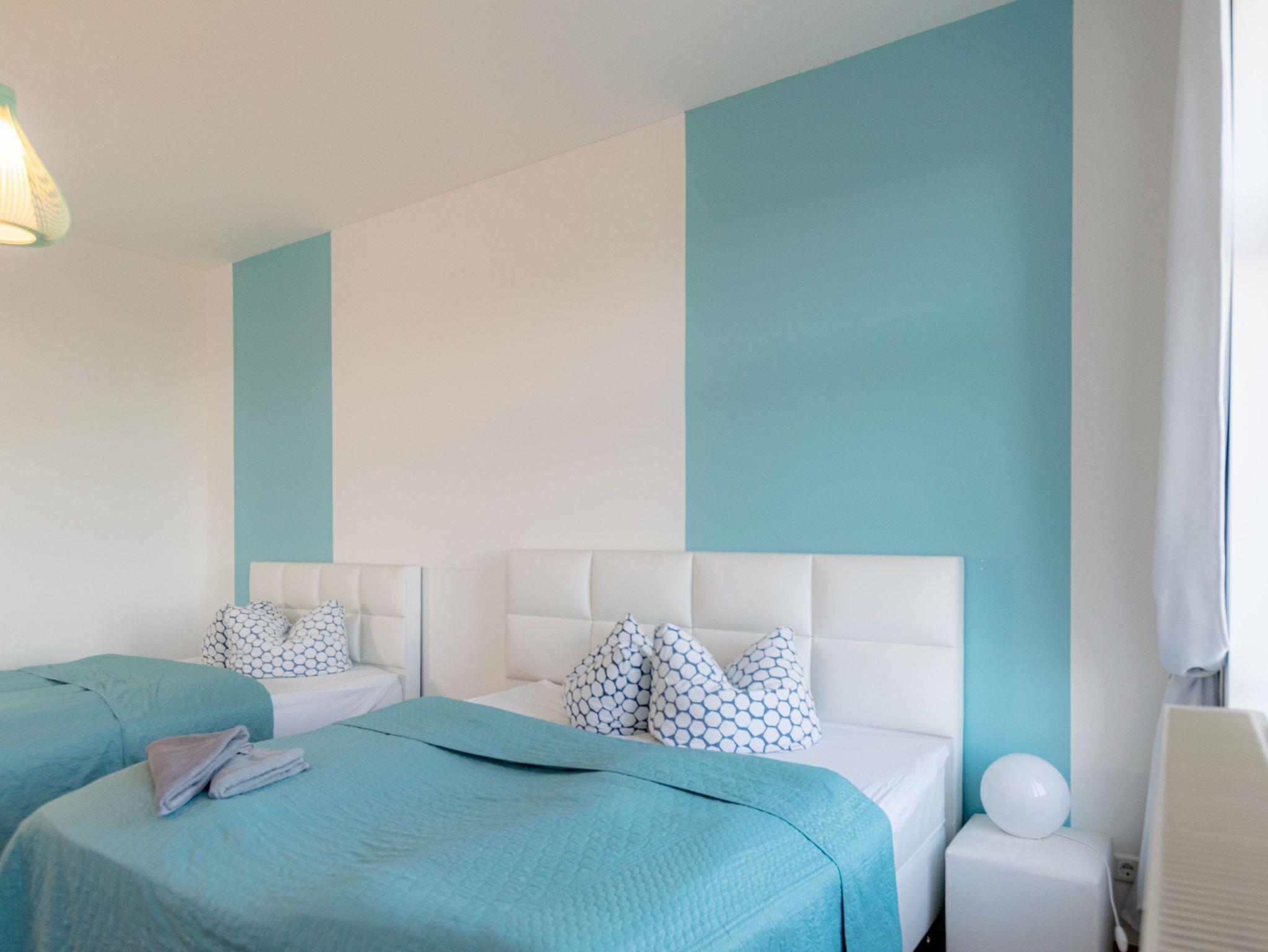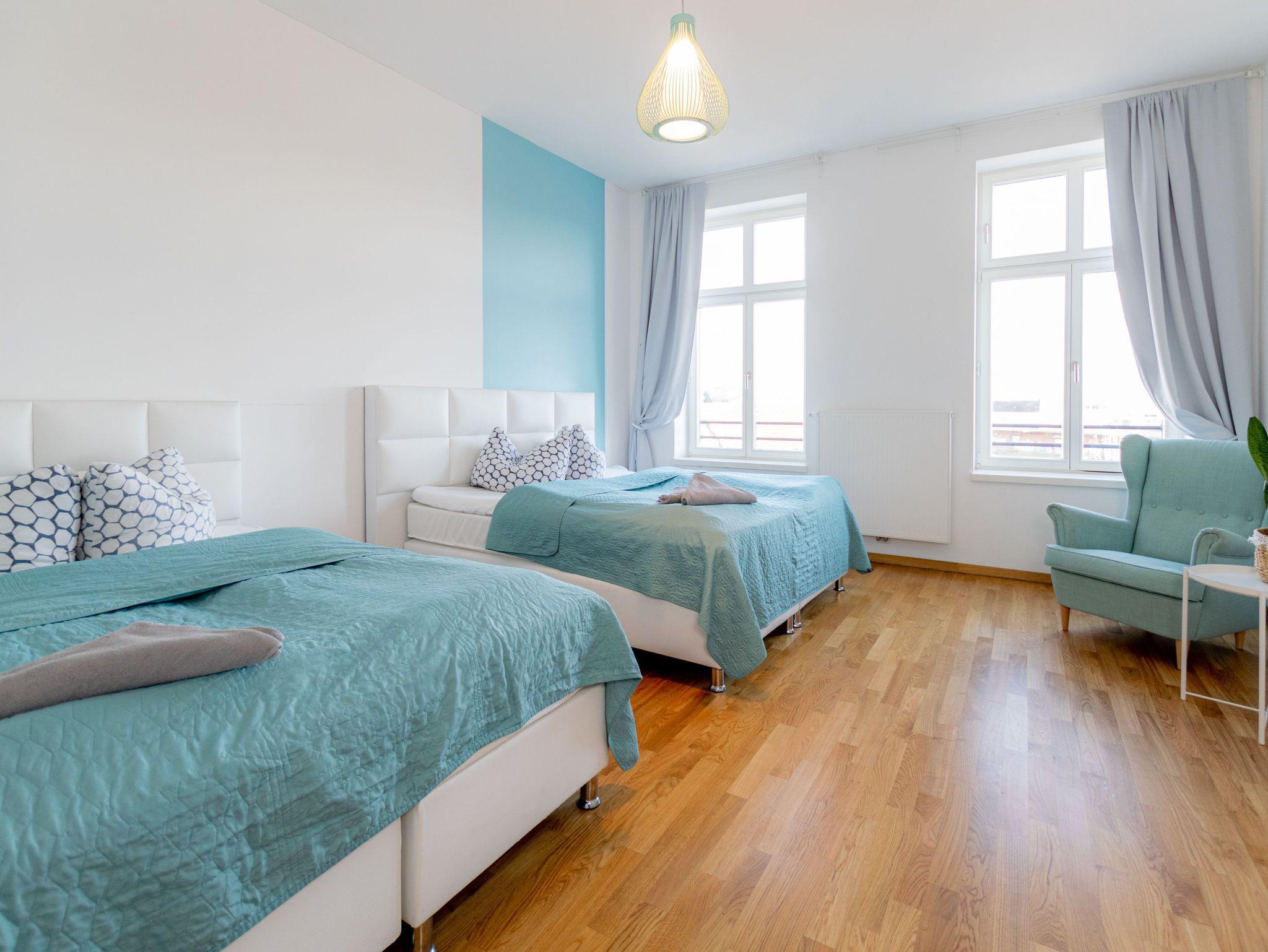 Du bist auf der Suche nach einem Zimmer für Deine kleine Reisegruppe und hättest gerne etwas Privatsphäre und Platz? Kannst Du haben! Ein schmaler Korridor führt Dich in ein geräumiges Schlafzimmer für Vier und ein eigenes Badezimmer, das mit geschmackvoller Modernität und Duschwanne keine Wünsche offen lässt. Im riesigen Schlafzimmer verheißen unsere ausgewählten Betten ausgezeichneten Schlaf. Die hohen Decken und Fenster verleihen dem Raum viel Licht und in Verbindung mit klarem Weiß und einem Spritzer Türkisblau eine beschwingte Frische. Die zeitlosen und praktischen Einrichtungsgegenstände werden von verspieltem Stuck an der Decke und hochwertigem Parkett ergänzt. Neben einem Fernseher gibt es auch einen Spiegel mit zweckmäßiger Garderobe, sowie eine kleine Ablagefläche und eine Sitzmöglichkeit. Wohnen wie im Appartement kannst Du hier für einen bestechenden Zimmerpreis!