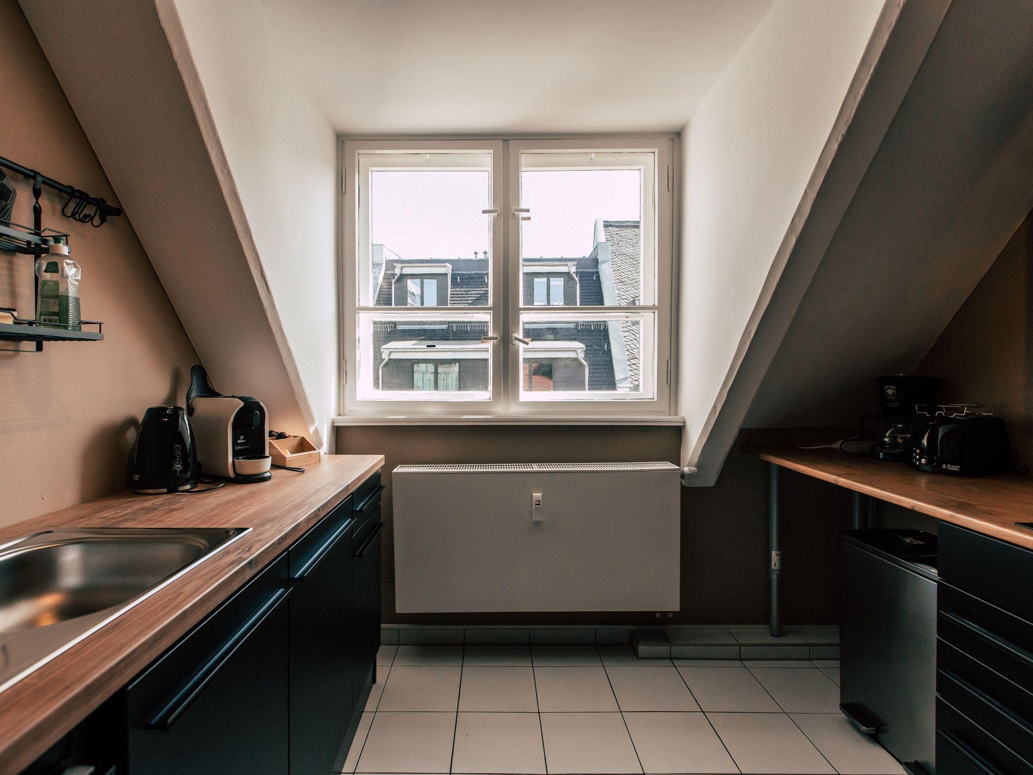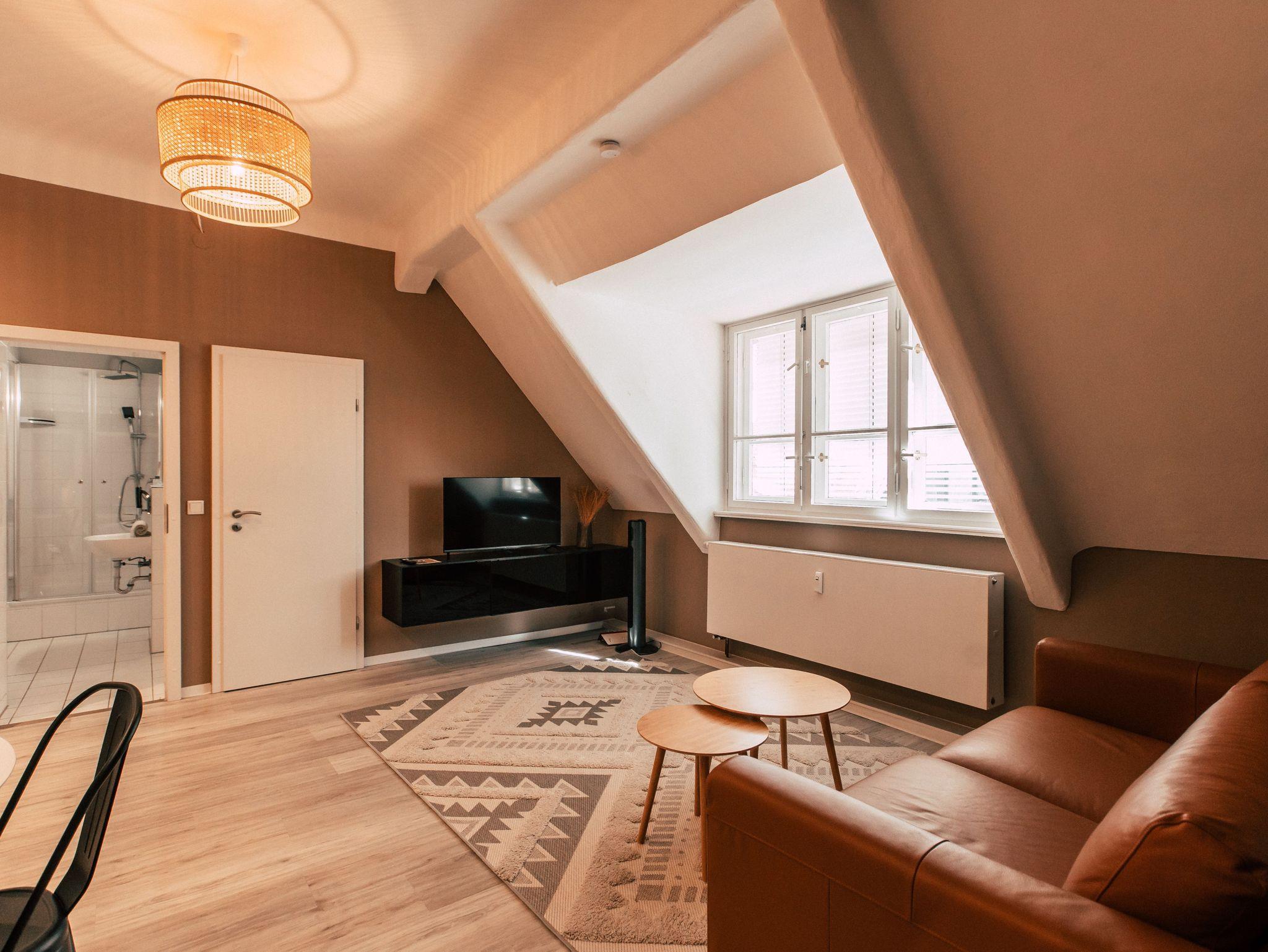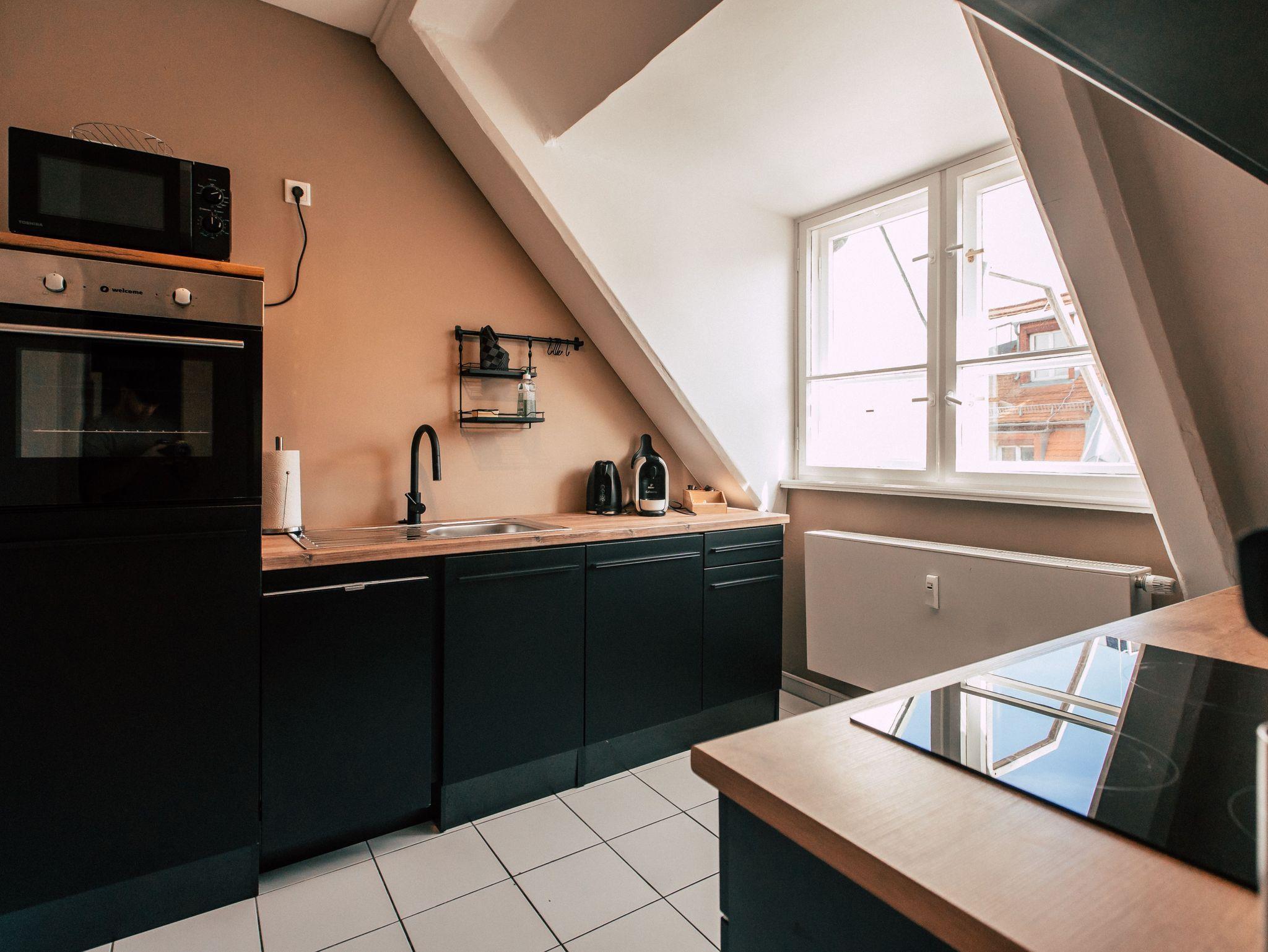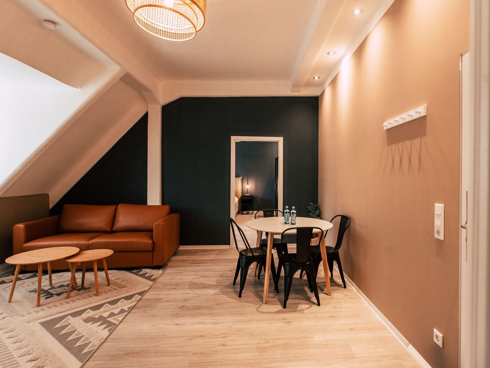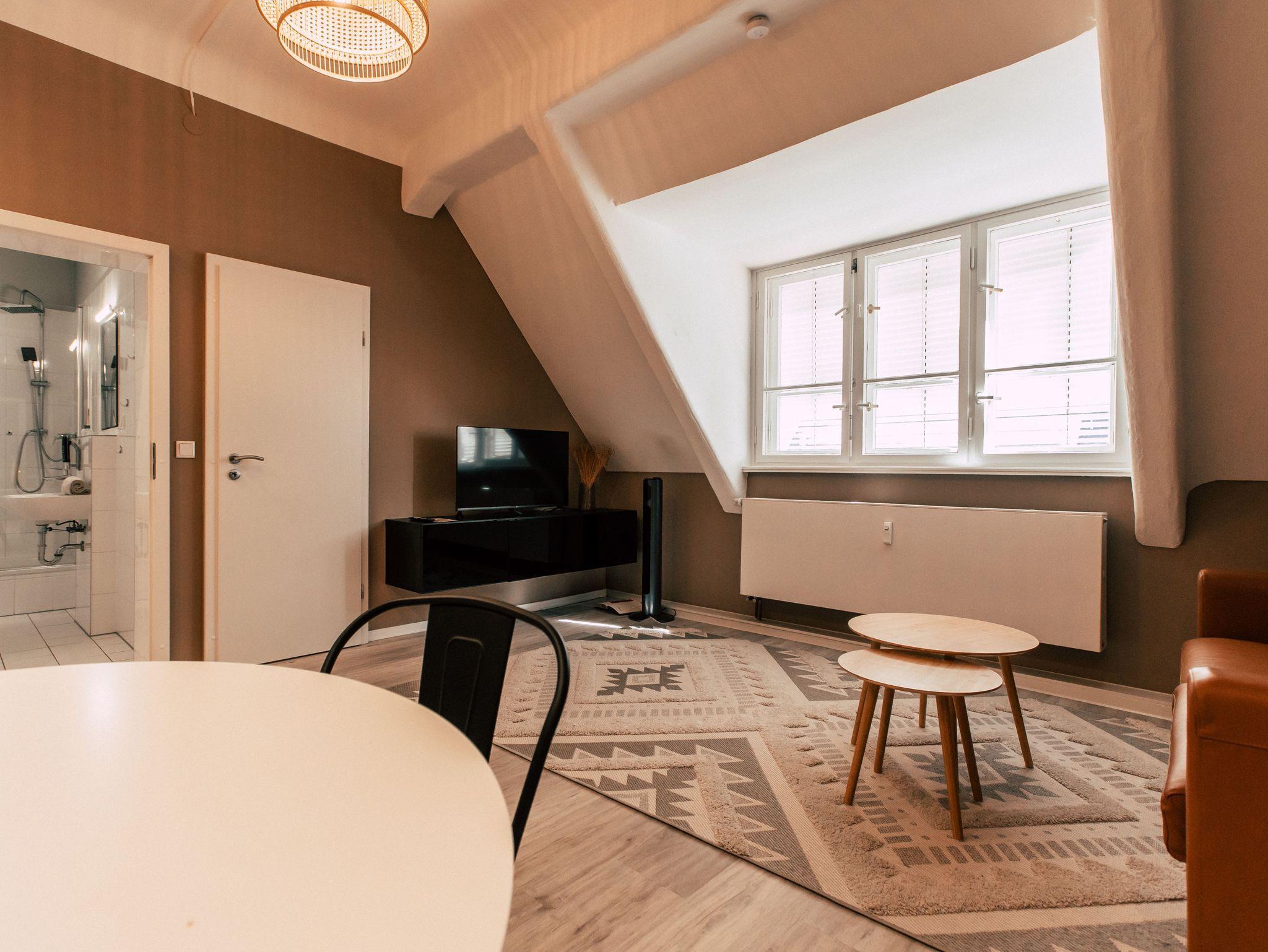 Inmitten der Leipziger Einkaufsmeile, unweit des Hauptbahnhofs, versteckt sich in einem prächtigen alten Jugendstilgebäude dieser kleine, feine Rückzugsort im Trubel der Stadt. Hoch oben mit Dachgeschossflair verbinden sich hier Altbau mit modernen, stilsicheren Elementen zu einem geschmackvollen, entschleunigten Ambiente, in dem du perfekt das Stadtleben auskosten kannst. Das geräumige Wohnzimmer mit Esstisch und Schlafsofa sind Mittelpunkt. Im Schlafzimmer nebenan verspricht das komfortable Boxspringbett unter sattem Dunkelblau erholsame Nachtruhe und die kleine separate Küche macht Kochen zum Genuss. Das moderne Badezimmer verfügt neben Dusche sogar über eine Waschmaschine. Perfekt für alle, die mitten in der Stadt Leipziger Luft schnuppern und sich auch gekonnt mit Stil zurückziehen wollen!