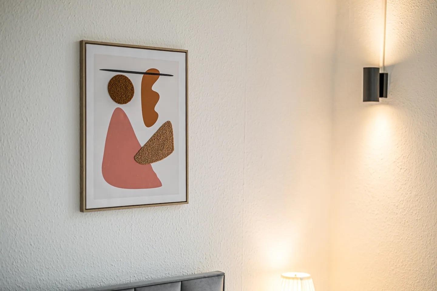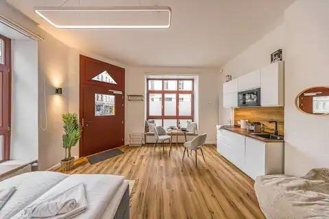 Das Apartment ist geschmackvoll eingerichtet und verfügt über ein gemütliches Schlafzimmer mit einem komfortablen Doppelbett und eine helle Küche mit Esstisch, die auch für ein Home-Office geeignet ist. Die moderne Küche ist komplett mit allem ausgestattet, was man braucht, um seine Mahlzeiten zuzubereiten. Das Bad ist neu und verfügt über eine Dusche.