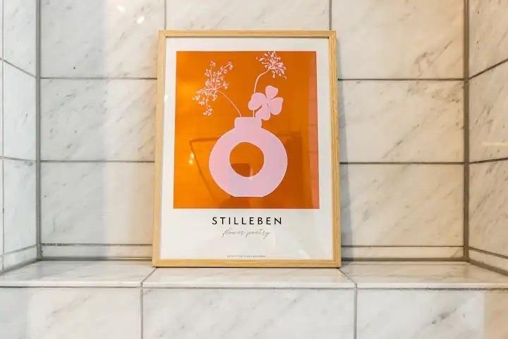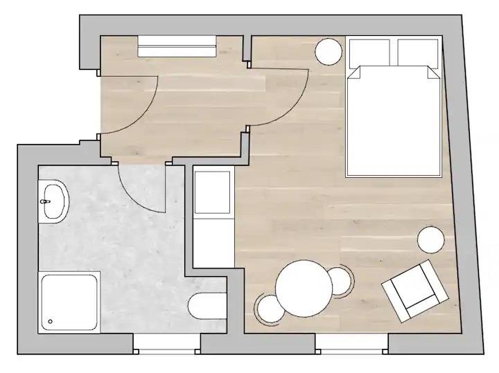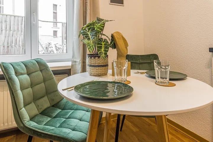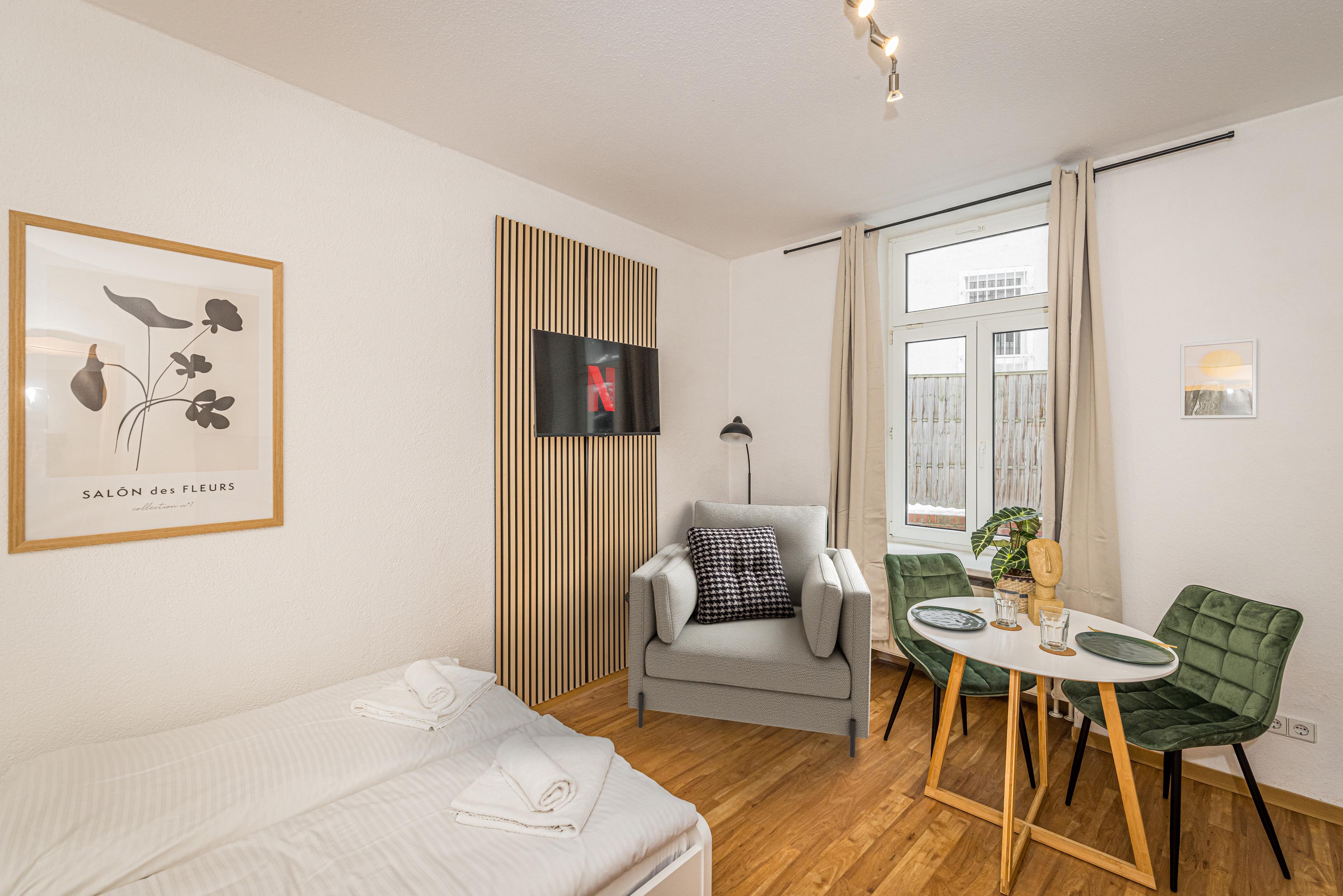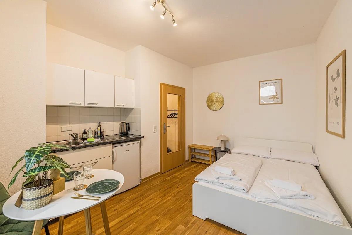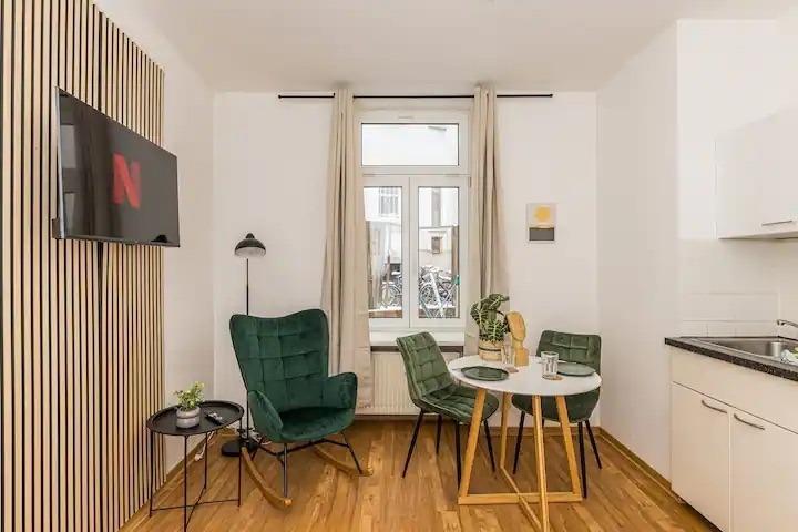 Das Apartment ist stilvoll eingerichtet und verfügt über ein gemütliches Schlafzimmer mit einem komfortablen Doppelbett und eine helle Küche mit Esstisch, die auch für ein Home-Office geeignet ist.