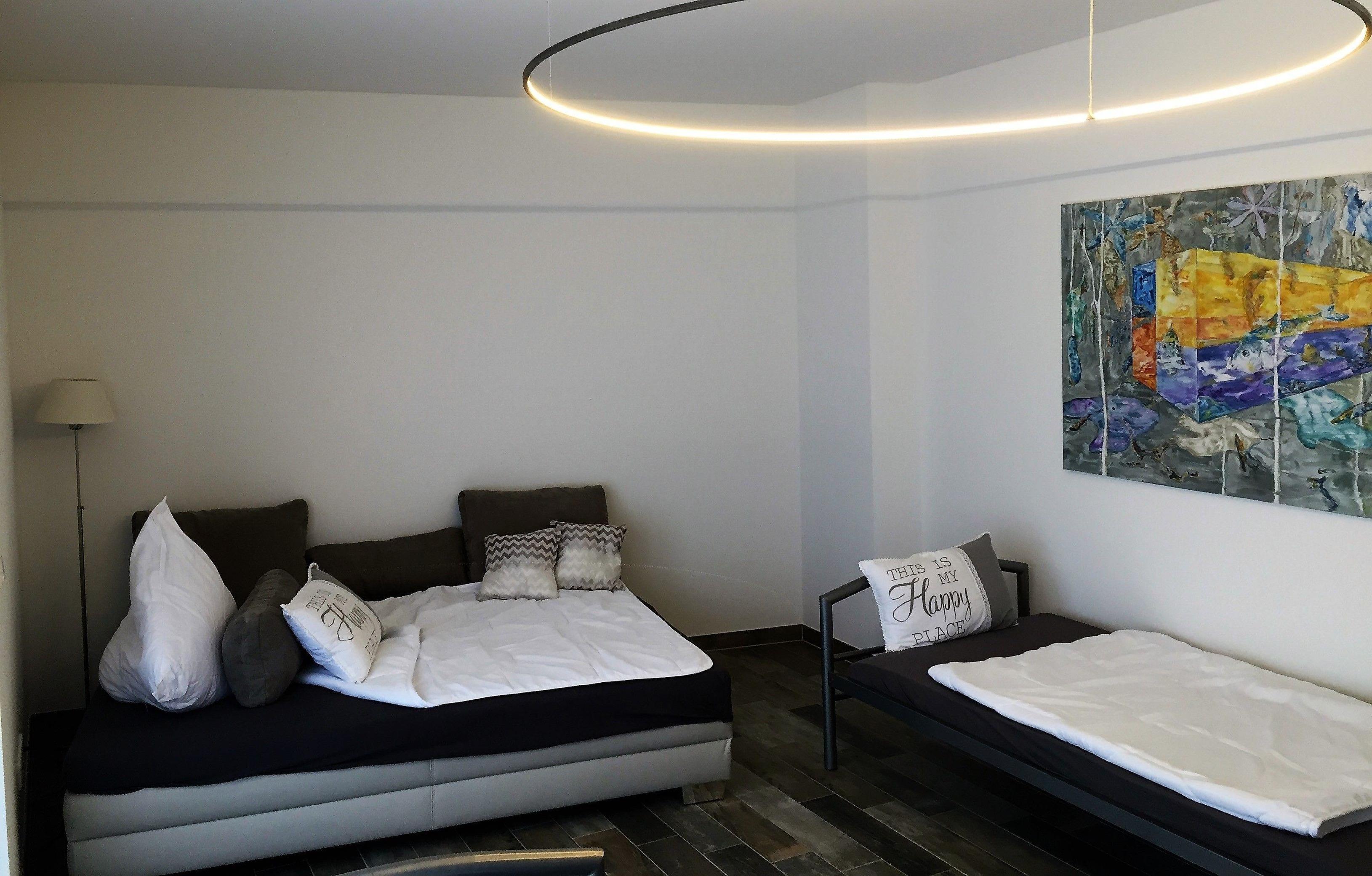 3 helle Räume, ein Schlafzimmer, ein weiterer Raum kann bei Bedarf als zusätzliche Schlafmöglichkeit genutzt werden. Zusätzlich gibt es eine ausziehbares Sofa im Wohnbereich.