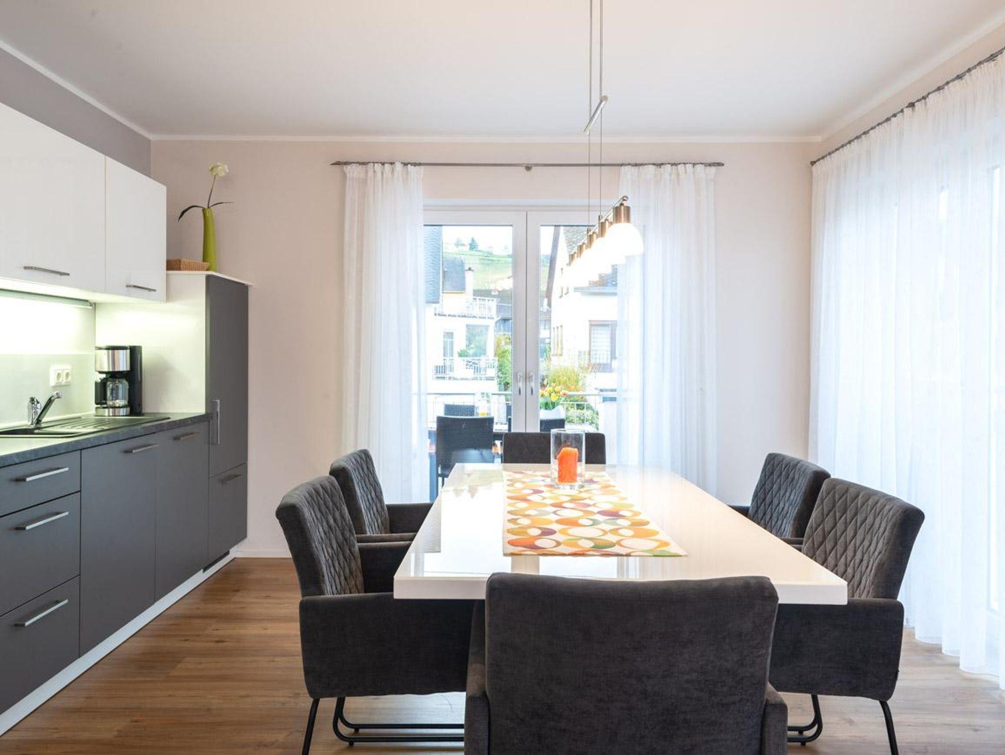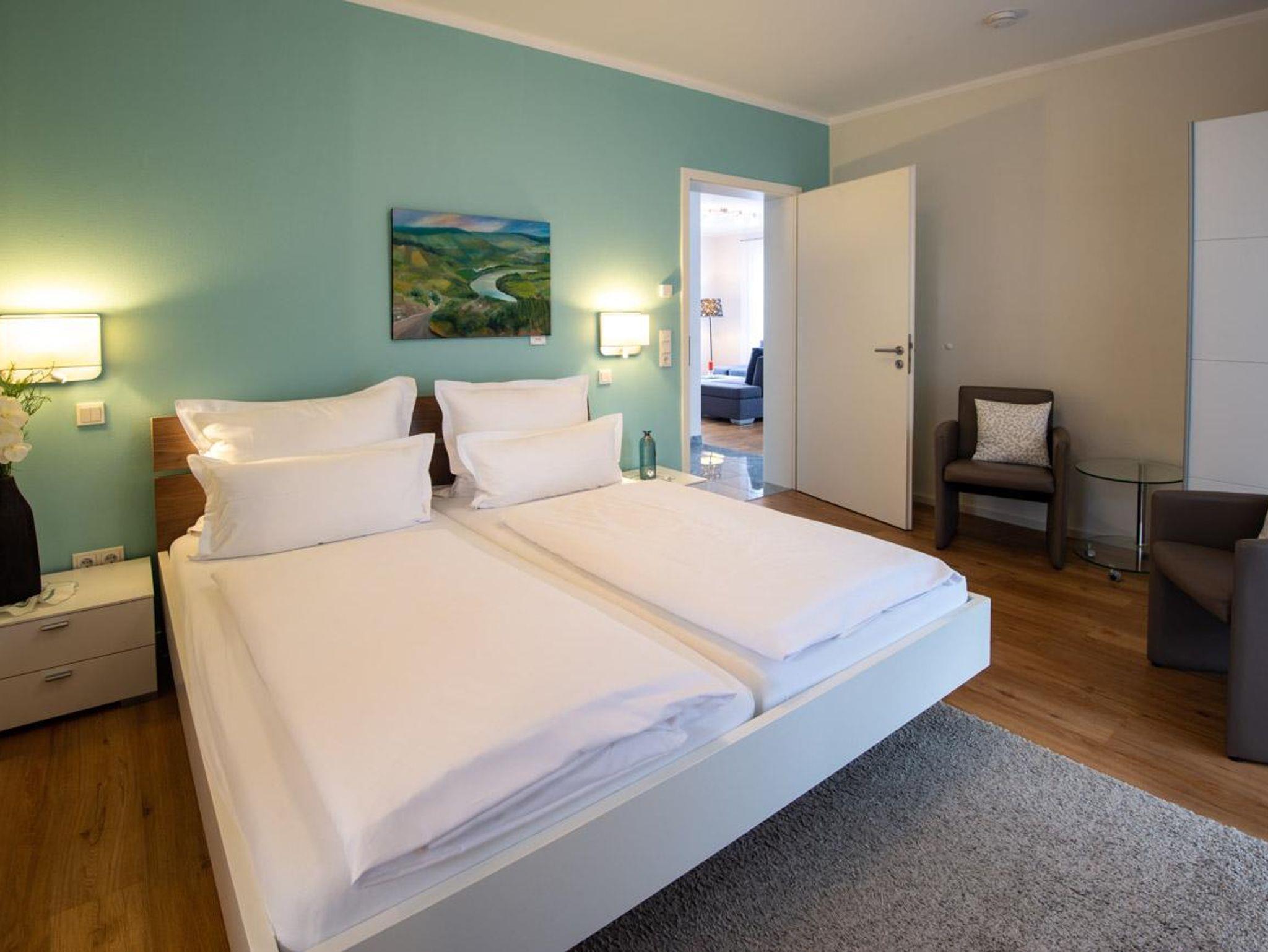 Die hellen und licht durchfluteten Räume unserer Ferienwohnung Verena haben wir mit viel Liebe zum Detail, stilvoll und mit höchstem Komfort für Sie eingerichtet. Vom Wohnzimmer genießen Sie einen wundervollen Ausblick in den großen Garten voller Blumen und heimischer Obstbäume bis hin zu unserer besten Weinbergslage, der Leiwener Laurentiuslay auf der gegenüberliegenden Moselseite.