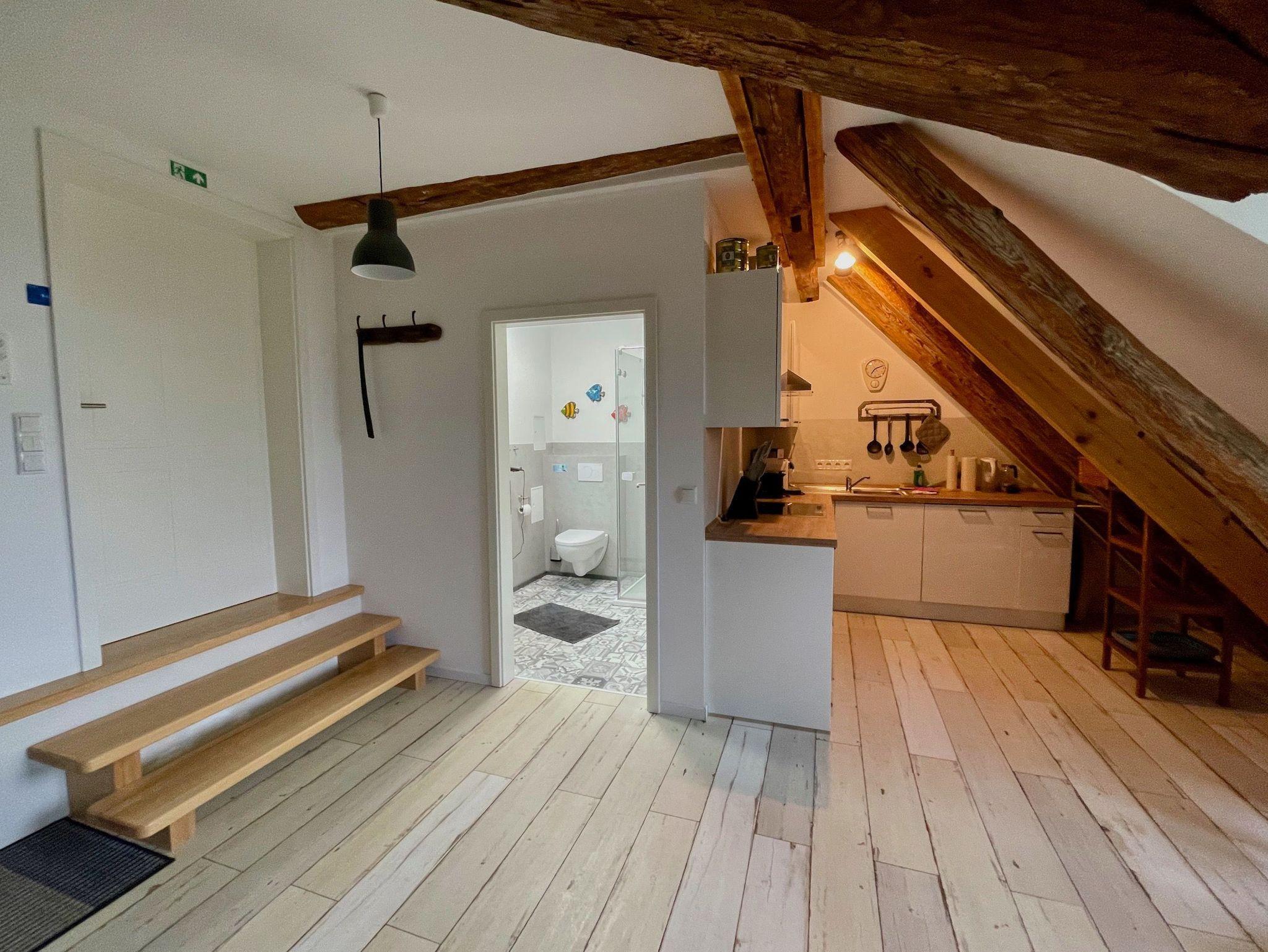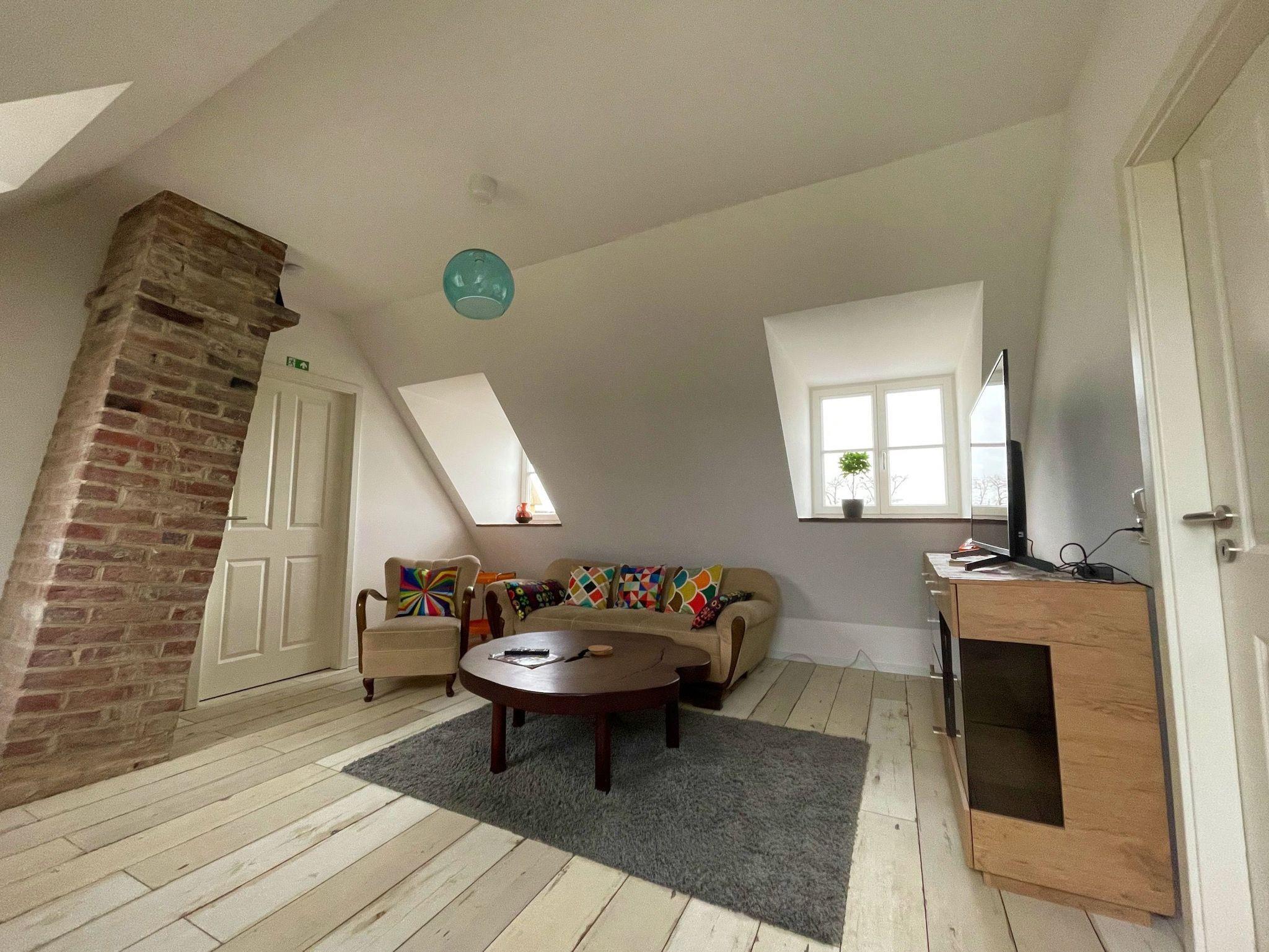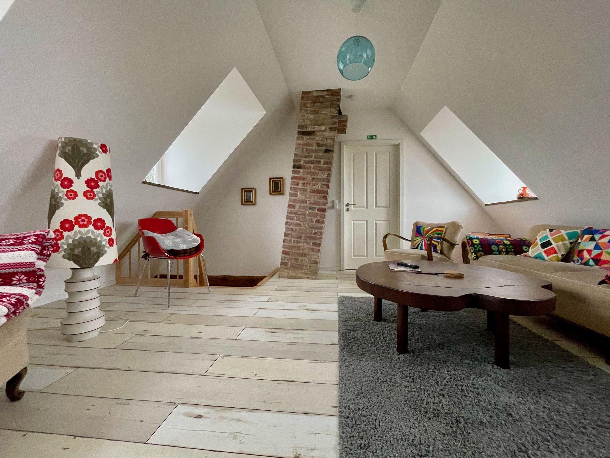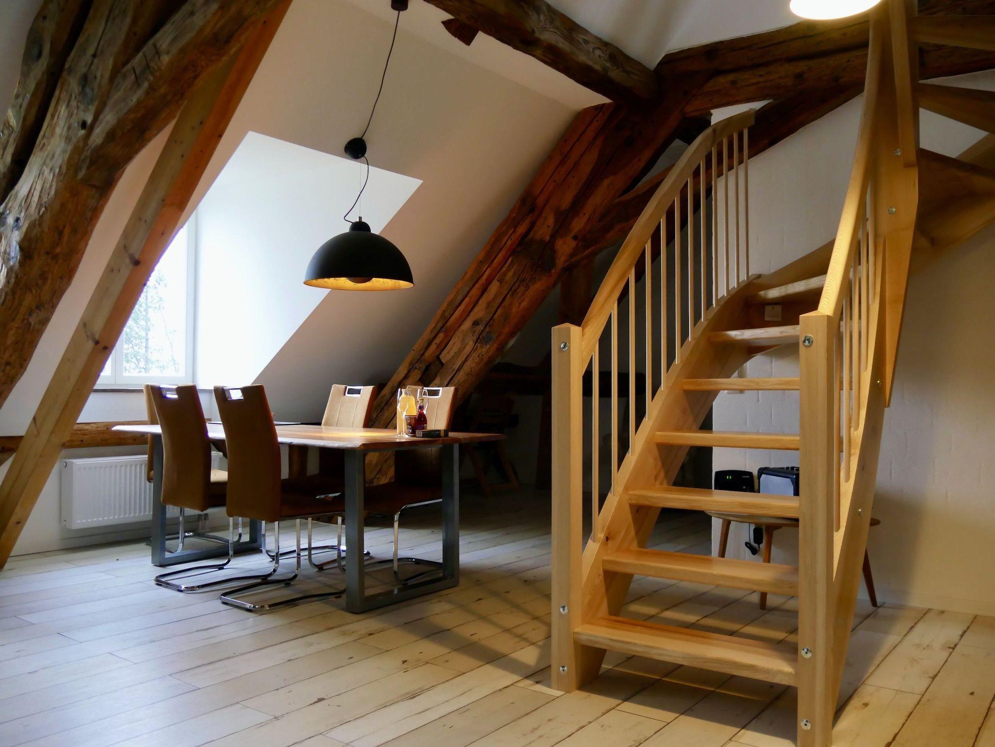 Das Apartment verfügt über ca. 90 qm Wohnfläche, aufgeteilt in einen großen Wohn ? und Essbereich und Badezimmer im zweiten Obergeschoss und einer Galeriewohnung mit zwei Schlafzimmern im dritten Obergeschoss.