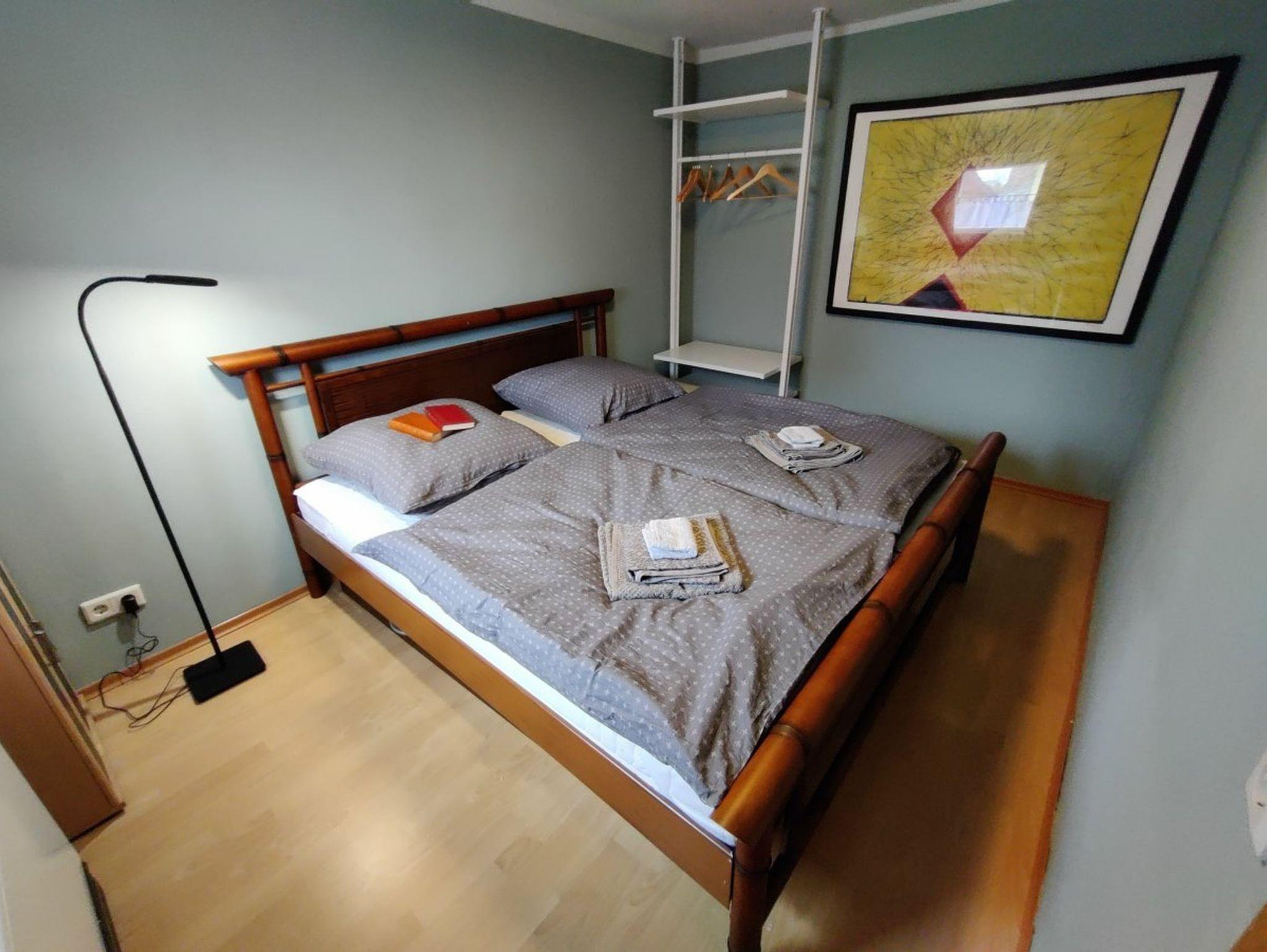Zwei Schlafzimmer bieten Platz für bis zu vier Personen: Eines mit einem komfortablen Doppelbett, das andere mit einem stabilen Doppelstockbett, dazu ein faltbares Kinderbett perfekt für Kinder oder Freunde. Das Badezimmer ist mit einer Dusche und einer Waschmaschine ausgestattet, sodass auch längere Aufenthalte bequem möglich sind.
