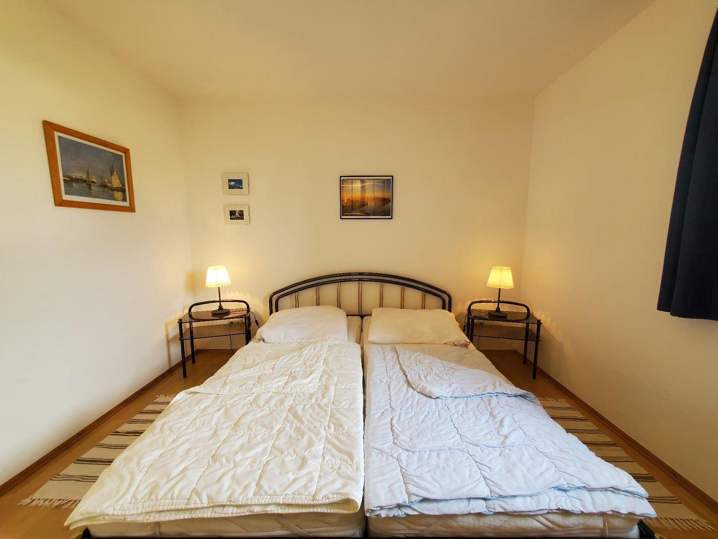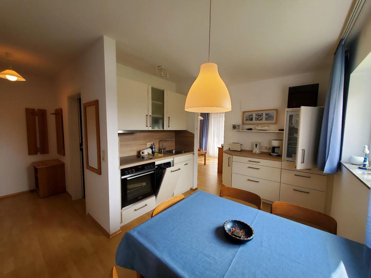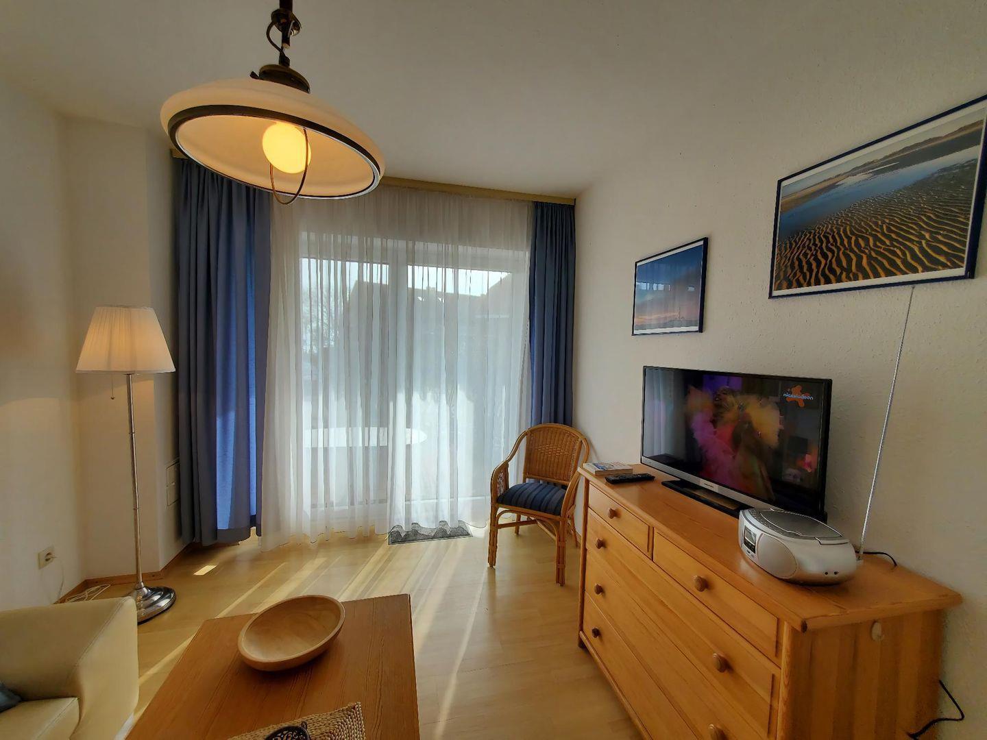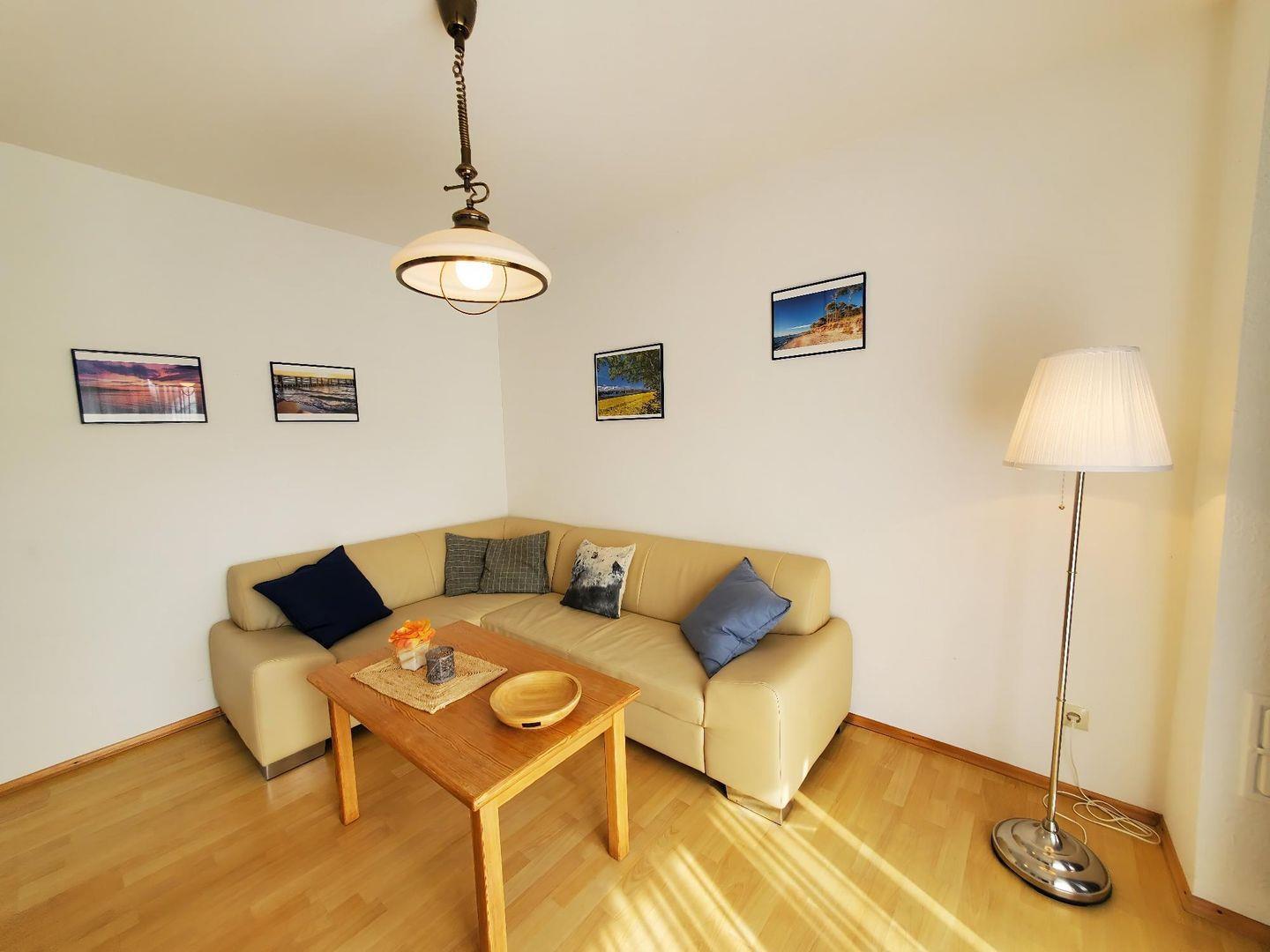 Ferienwohnung in kleiner Ferienanlage in einem 4-Familien-Ferienhaus, Ferienwohnung im Erdgeschoss, Größe ca. 48 m2, hell und freundlich eingerichtet, Wohnzimmer mit Farb-TV-SAT, Eckcouch mit Schlaffunktion für 2 Personen,
