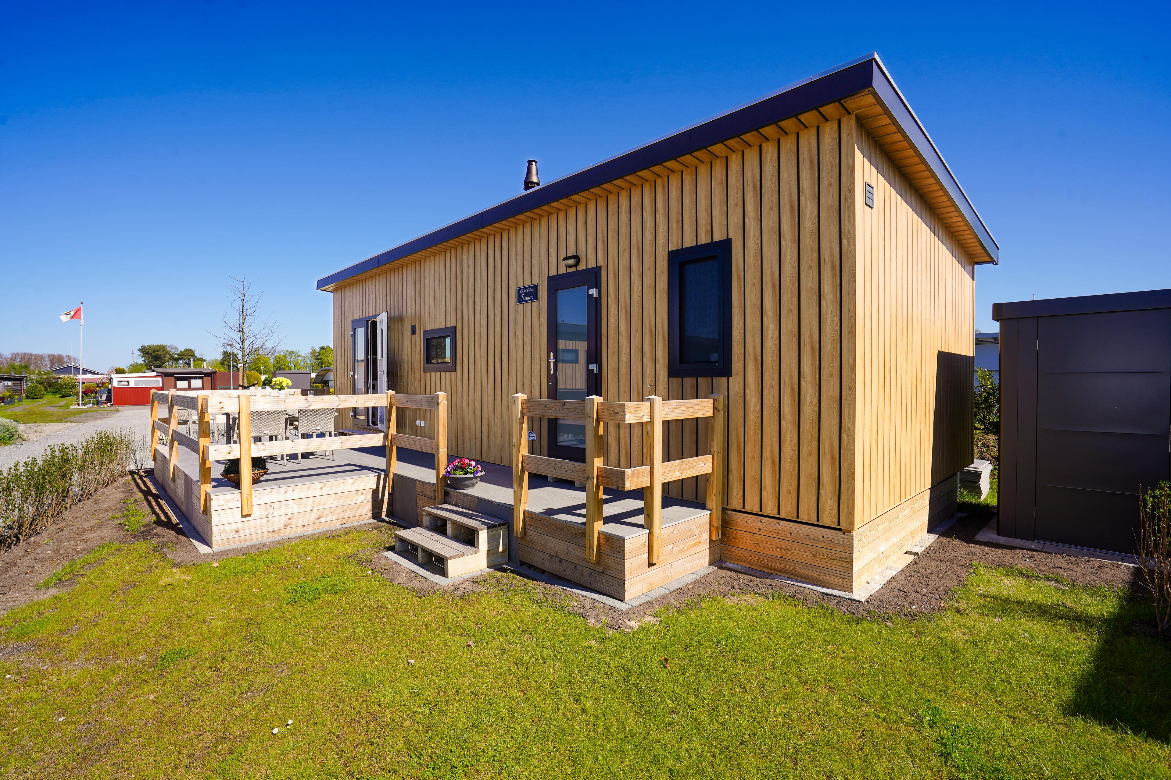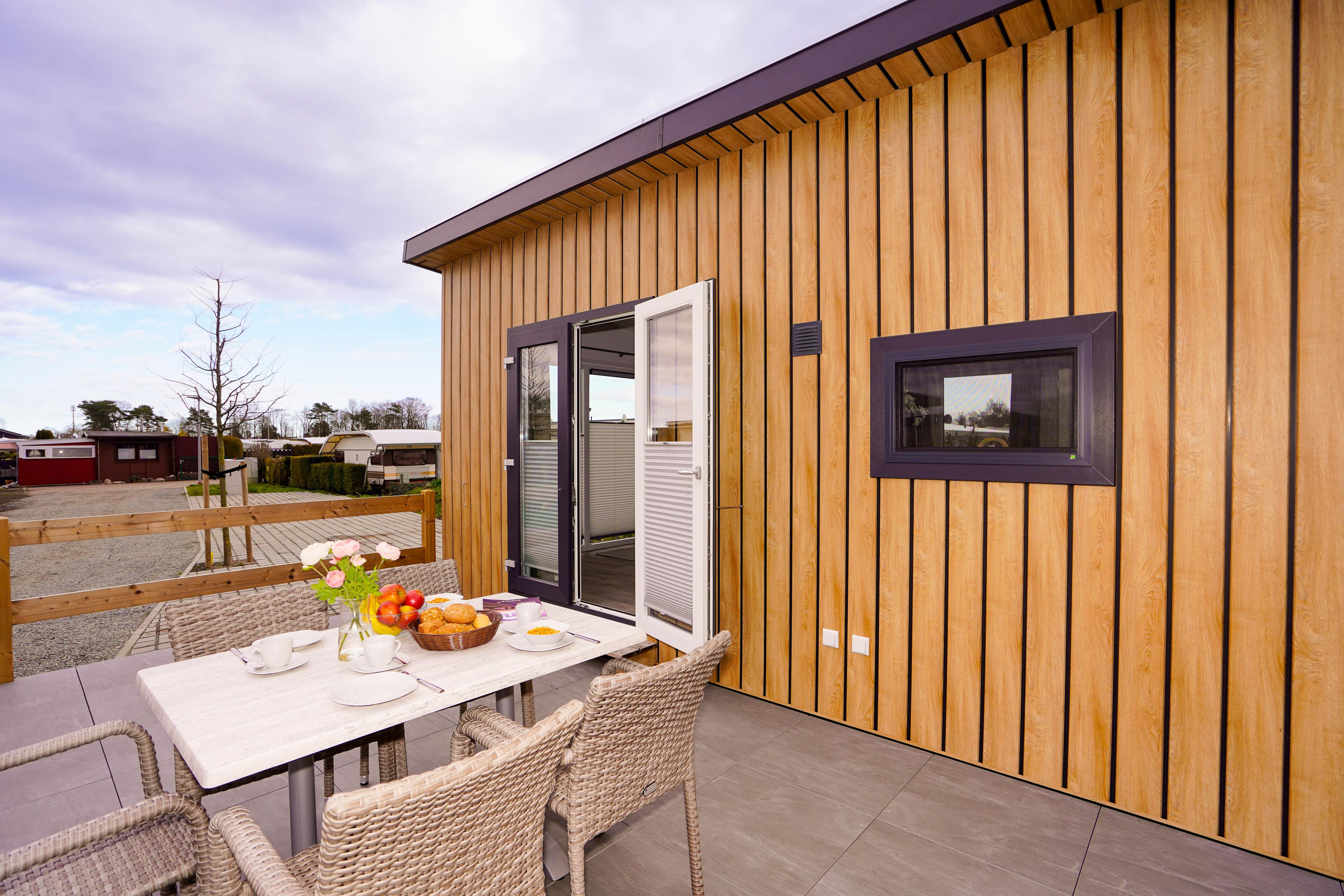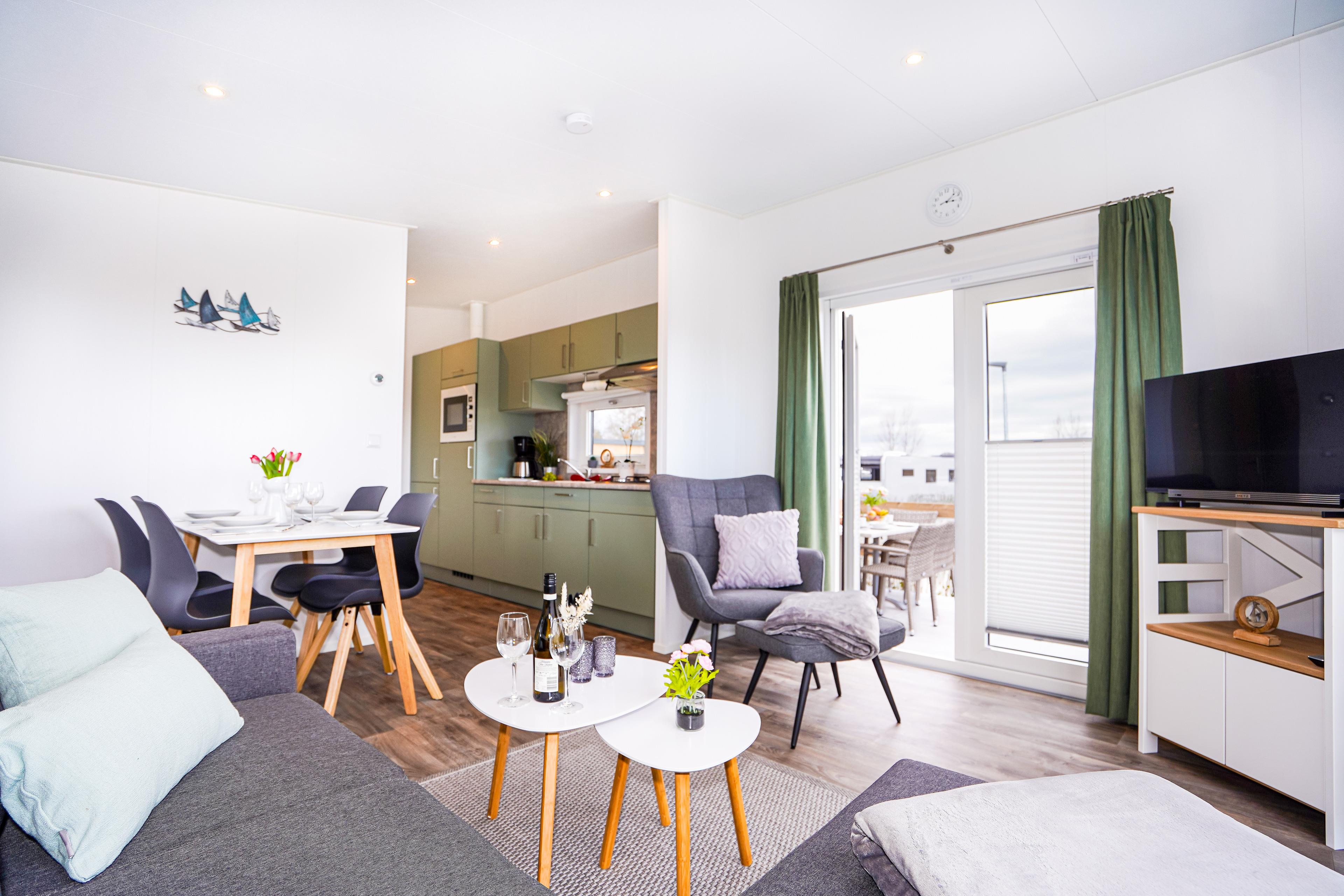Gemütliches Mobilheim in Lensterstrand mit Terrasse, moderner Küche und Strandnähe für entspannte Urlaubstage.