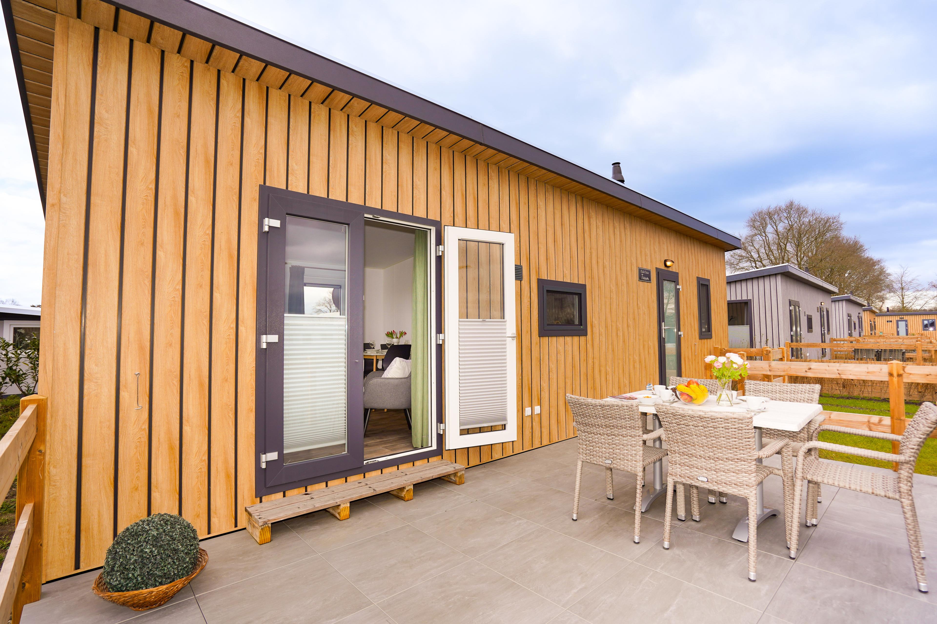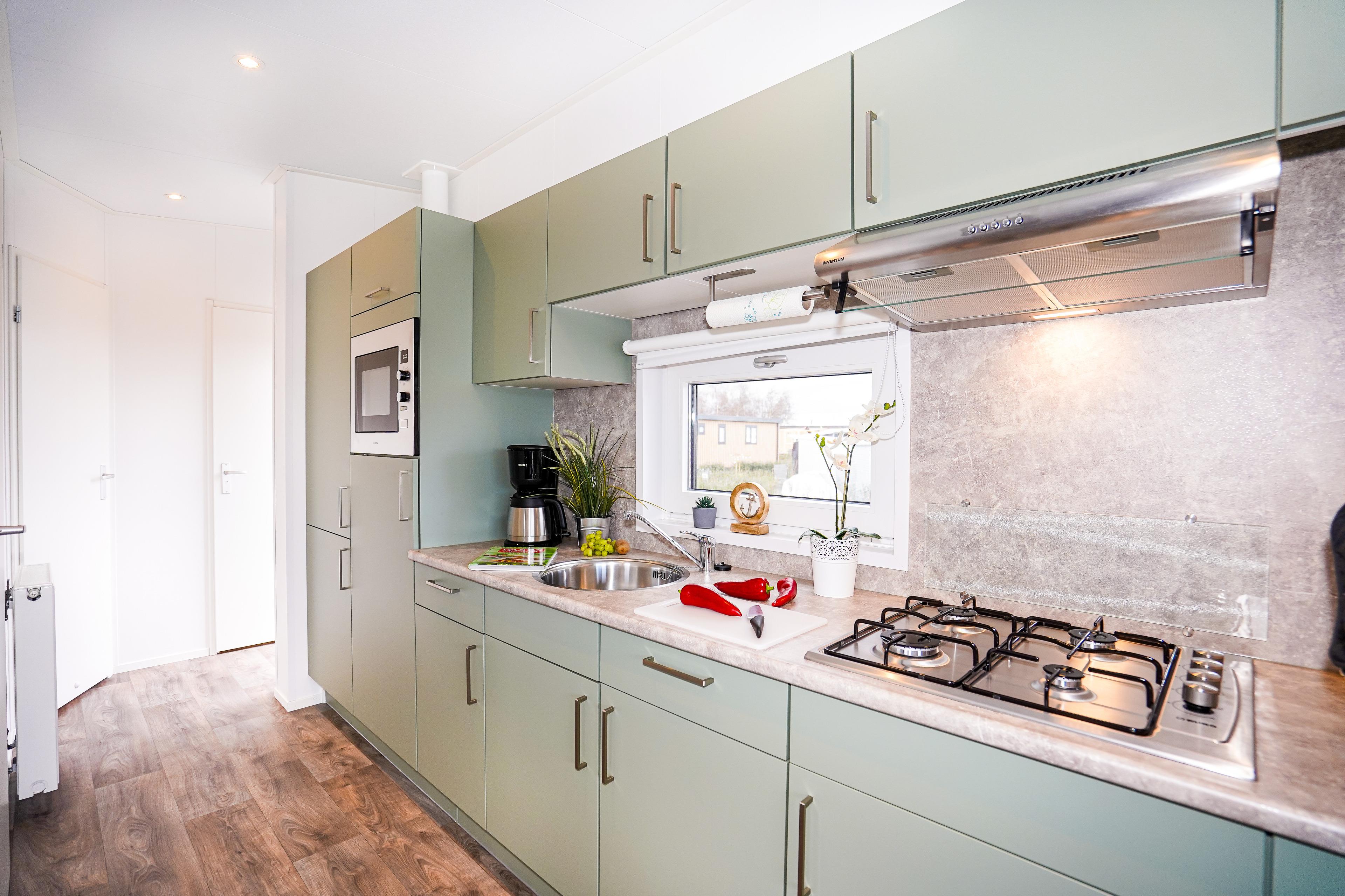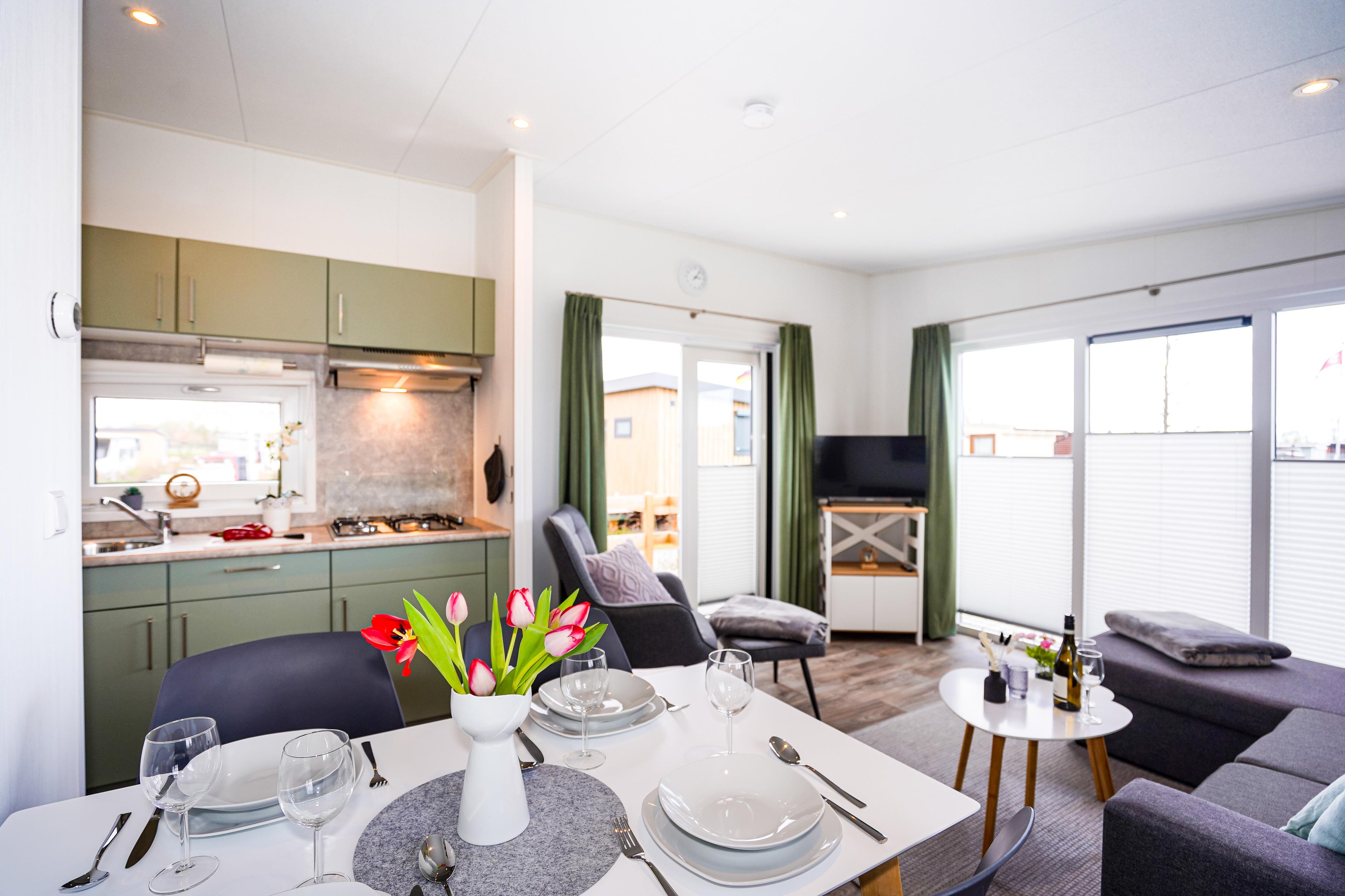 Gemütliches Mobilheim in Lensterstrand mit Terrasse, moderner Küche und Strandnähe für entspannte Urlaubstage.