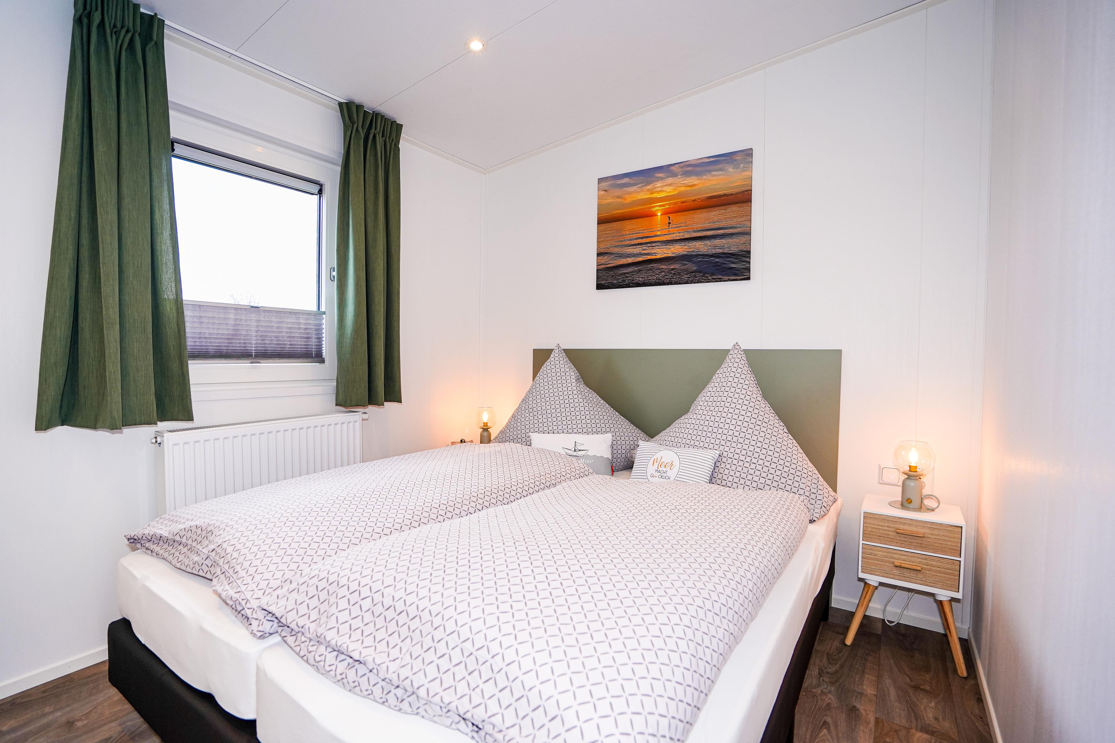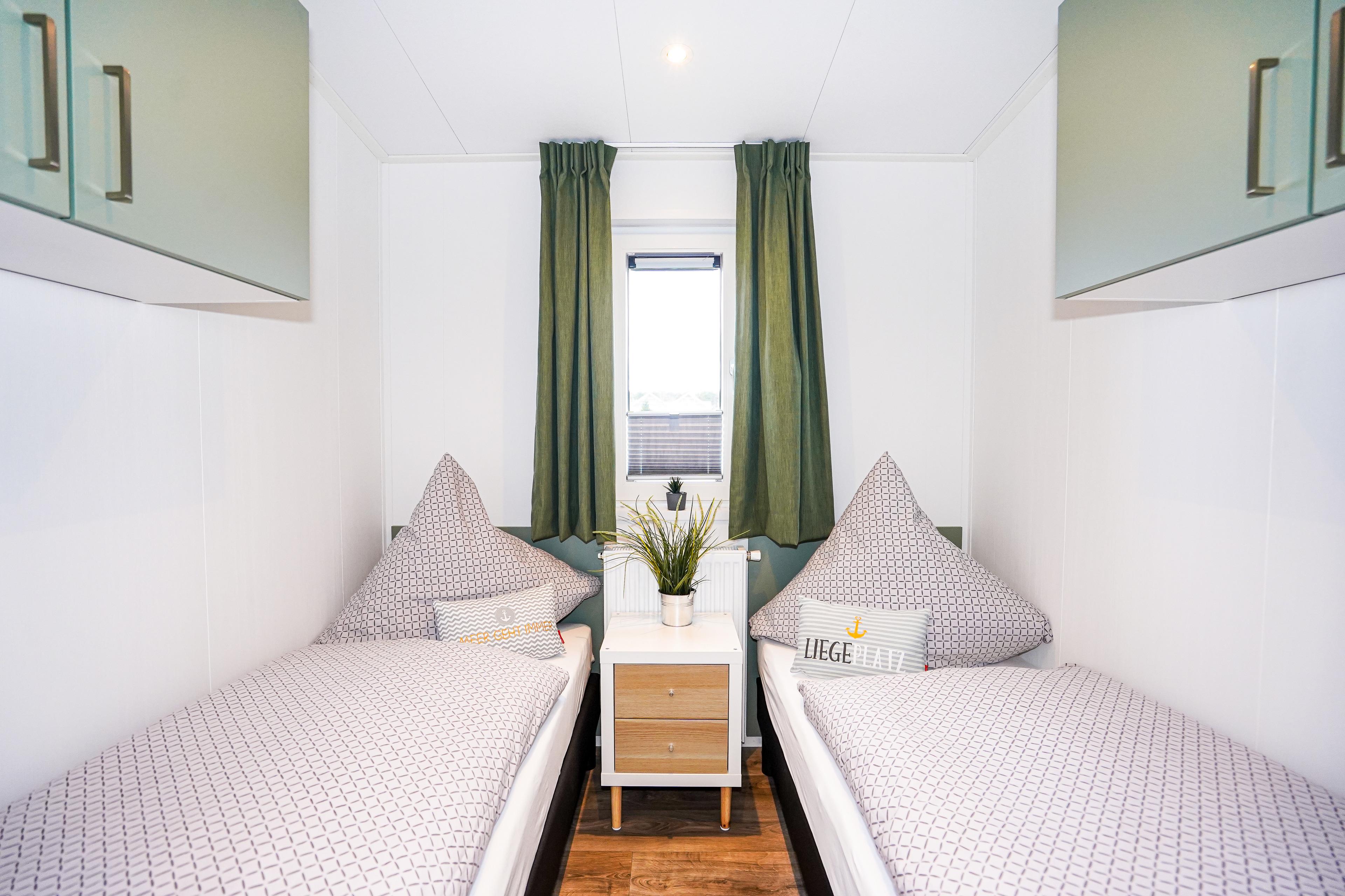Diese gemütlichen Unterkünfte bieten Platz für bis zu 4 Personen und sind perfekt für einen entspannten Urlaub. Jedes Mobilheim verfügt über eine voll ausgestattete Küche mit Gasherd und Mikrowelle, Kühl- und Gefrierkombination, Geschirrspüler, Kaffeemaschine und Wasserkocher. Ein modernes Badezimmer mit Dusche, WC und Waschtisch sowie zwei einladende Schlafzimmer (ein Doppelbett 2x80x200cm und zwei Einzelbetten 80x200cm) sorgen für Ihren Komfort.