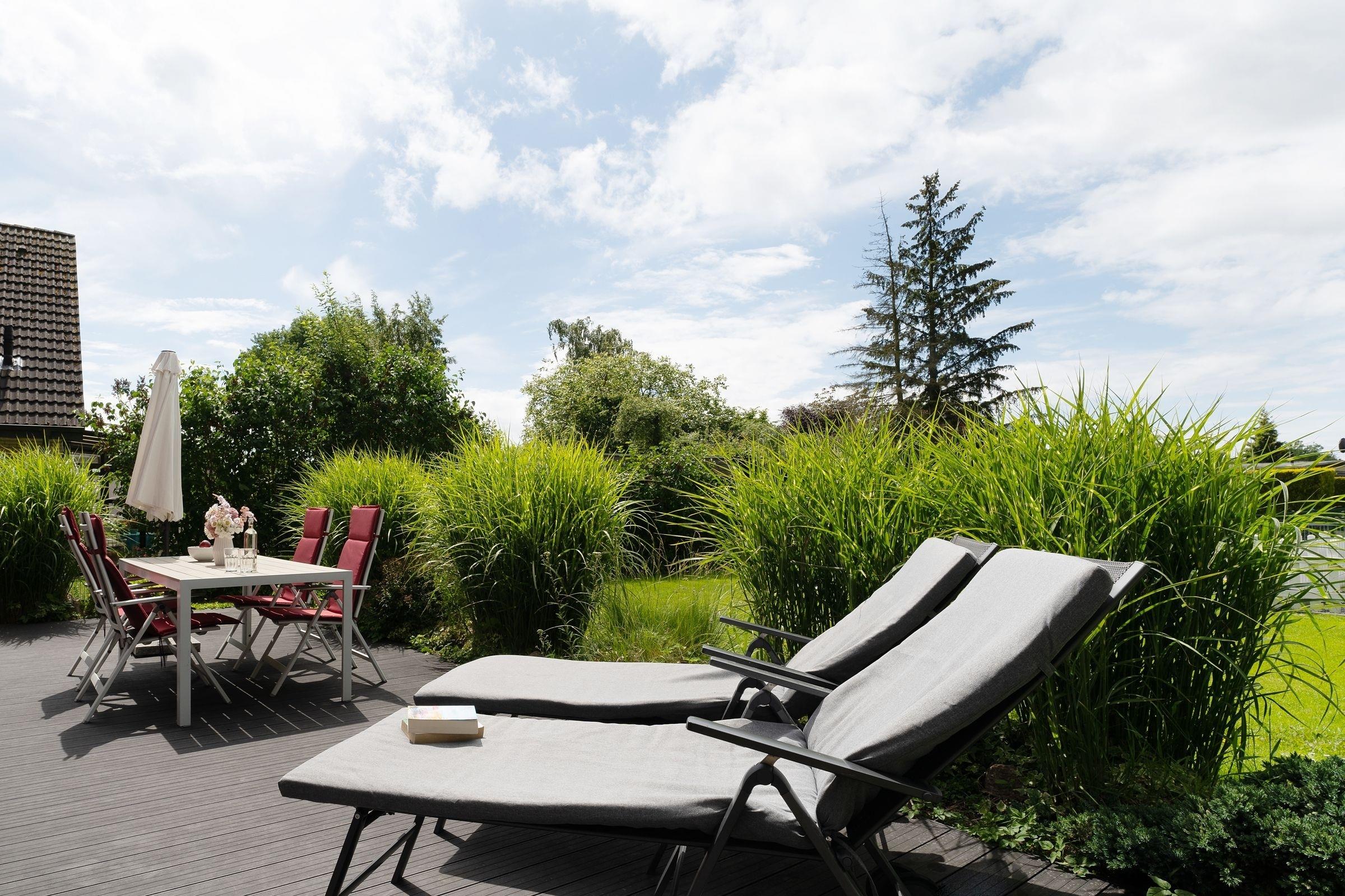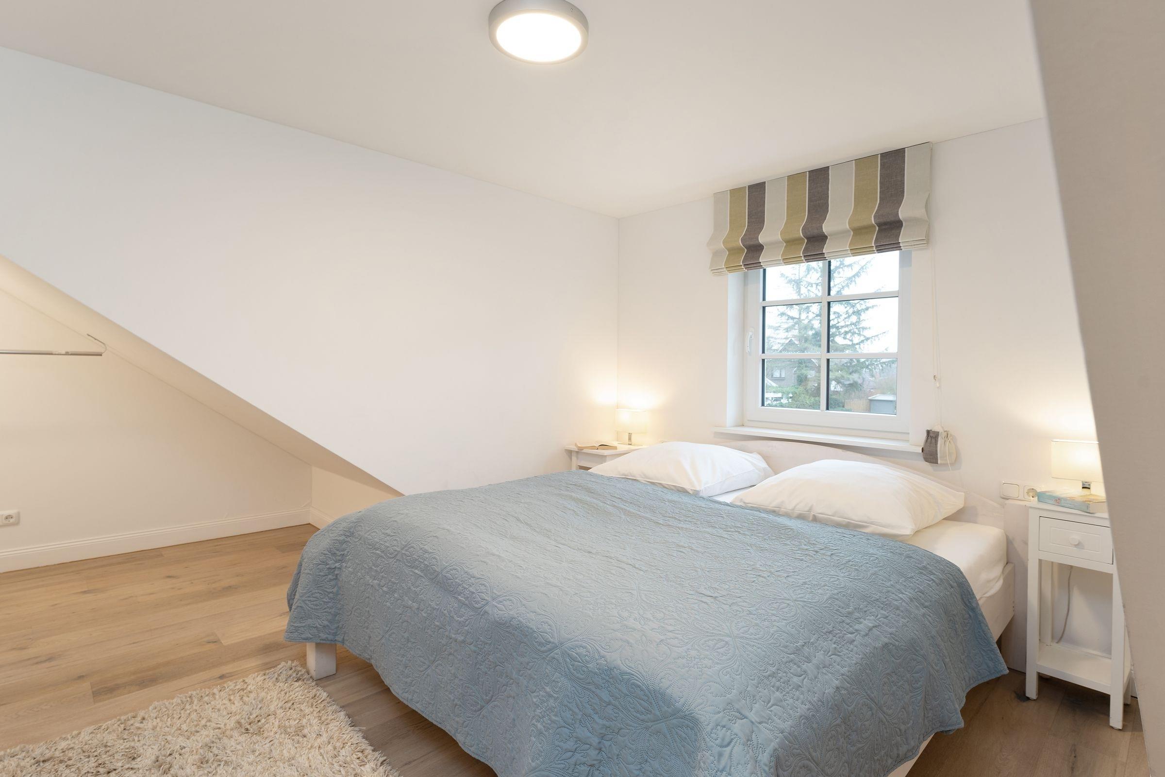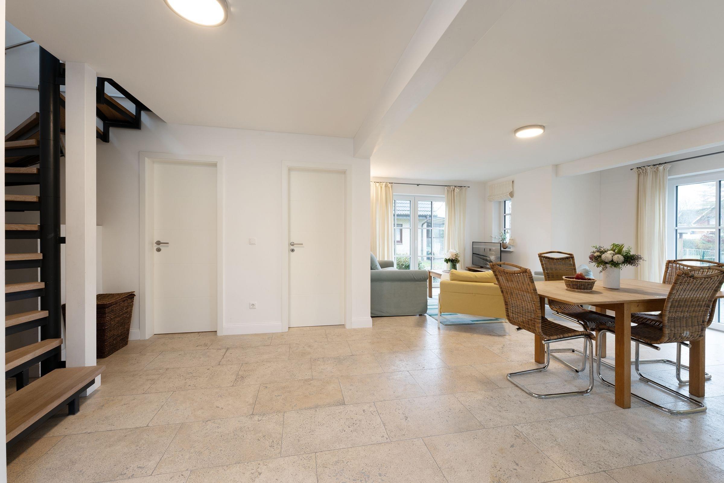 Der offene Wohn- und Kochbereich, umrahmt von 2 Terrassen, begeistert mit geschmackvollem Design und gehobener Ausstattung. Bequeme Sitzgelegenheiten im Wohnbereich, der Flat-TV, Stereoanlage und ein Esstisch bieten viele Möglichkeiten, die Urlaubstage zu gestalten. Die schicke, offene Küche ist hochwertig ausgestattet. Absolutes Highlight ist die wunderschöne möblierte Holzterrasse mit Blick in den umzäunten Garten, auf der Sie die gesunde Ostseeluft genießen können. Das moderne Bad ist mit einer bodentiefen Dusche und einer Waschmaschine bestückt. Erholsame Nächte beschert Ihnen das Doppelbett (2x 90x200 cm) im Hauptschlafzimmer. Im Kleiderschrank ist Platz für Ihre Urlaubsgarderobe und ein 2. Flat-TV sorgt für Unterhaltung. 2 weitere Gäste können es sich im nebenliegenden Schlafzimmer in zwei Einzelbetten (je 90x200 cm) gemütlich machen. Auf dieser Etage gibt es ein zusätzliches Gäste-WC.