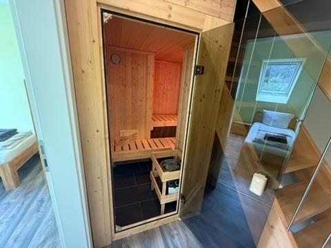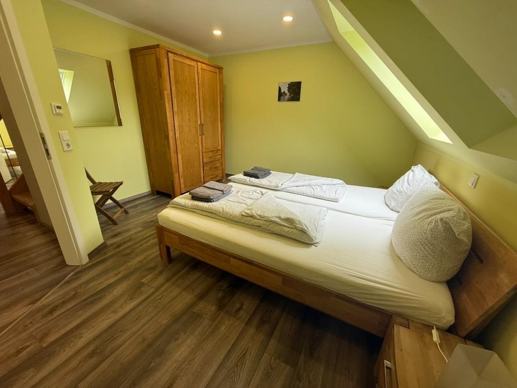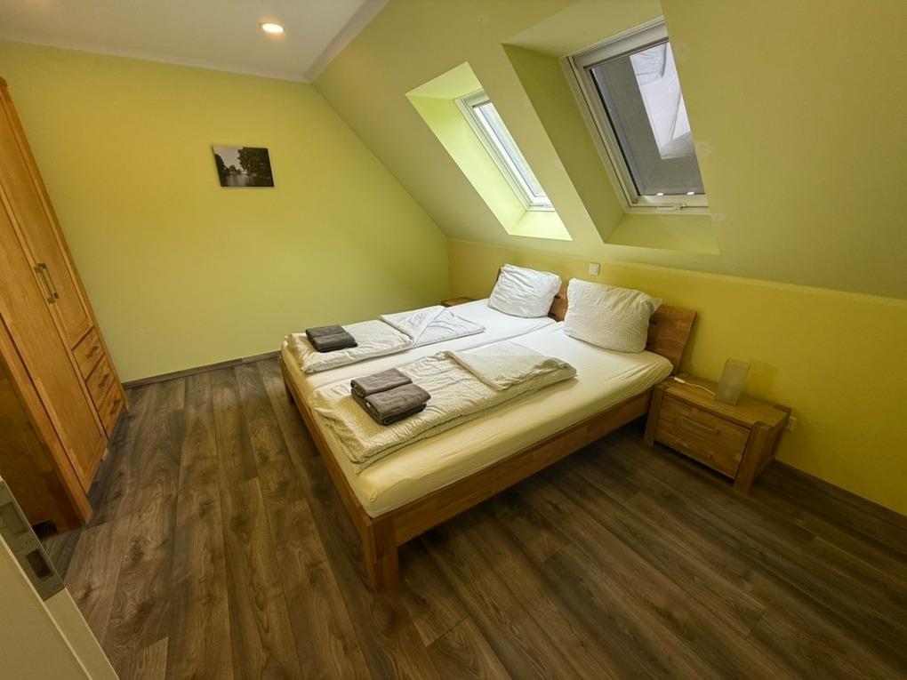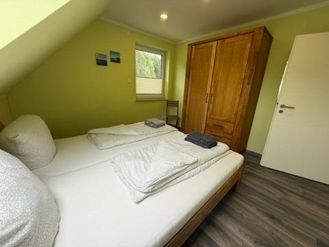 Ebenfalls auf der unteren Etage befindet sich ein Schlafzimmer mit Doppelbett und ein Bad mit Wellnessdusche, Waschbecken und WC, Sauna. Im OG befinden sich 3 Schlafzimmer. Zwei Schlafzimmer mit einem Doppelbett und einen Kleiderschrank.Ein Schlafzimmer mit 2 Einzelbetten und Kleiderschrank.Ein Bad mit Dusche und einer Badewanne. Zusätzliches WC mit Waschmaschine. Über eine Treppe erreichen Sie den Schlafboden im DG. Dieser ist mit 3 Einzelbetten, großen TV und einer PlayStation 4 ausgestattet. Ideal für die Jugendlichen und Kinder.