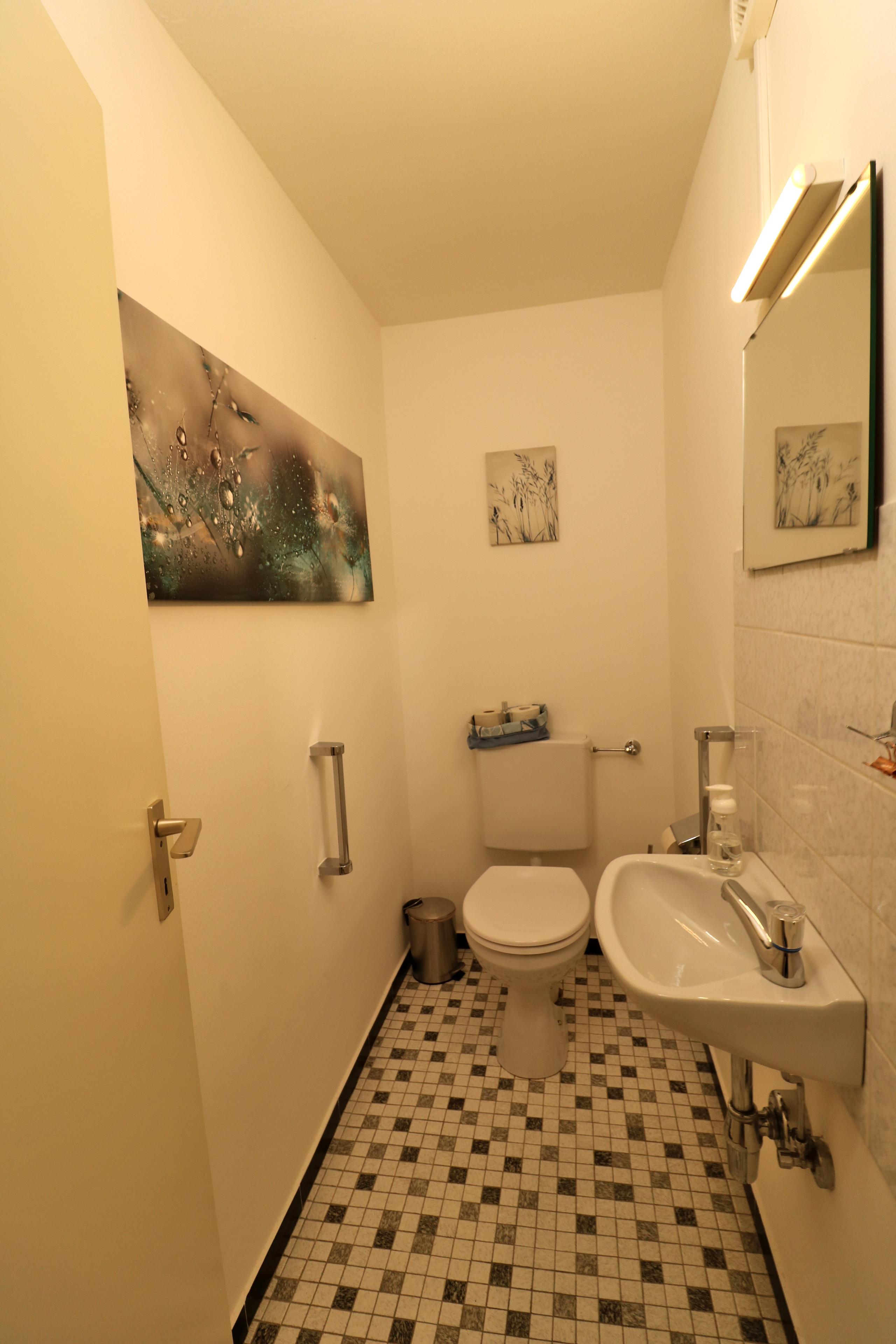 Im Bad befindet sich eine Badewanne mit Duschmöglichkeit.