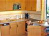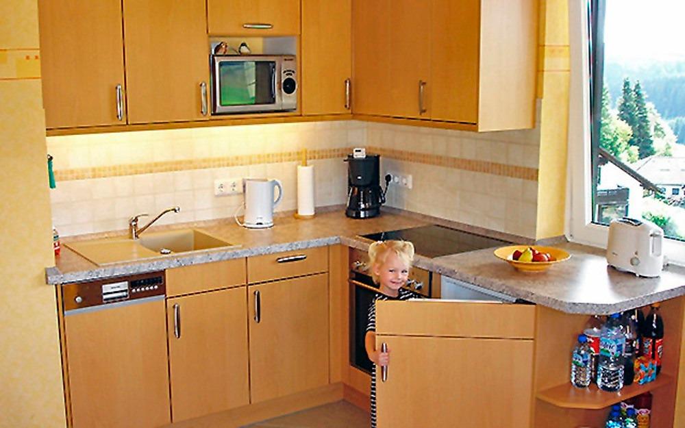 Komplett eingerichtete Küche mit Geschirrspüler, Mikrowelle und Essplatz mit Blick auf den Wald