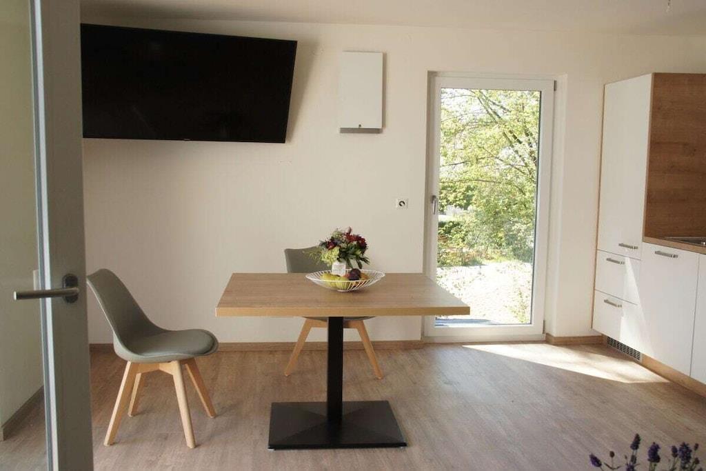 Parterre: (Küche(Kochplatte, Wasserkocher, Toaster, Kaffeemaschine, Backofen, Spülmaschine, Kühlschrank, Tiefkühlschrank, Heizung, ), Wohn/Esszimmer(Schlafcouch 1 Pers., TV, Esstisch, Heizung, Fliegenfenster), Schlafzimmer(Doppelbett, Heizung, Fliegenfenster), Badezimmer(Dusche, Waschbecken, Toilette, Heizung, Föhn, Fliegenfenster, Handtücher inklusive)) Balkon, Gartenmöbel