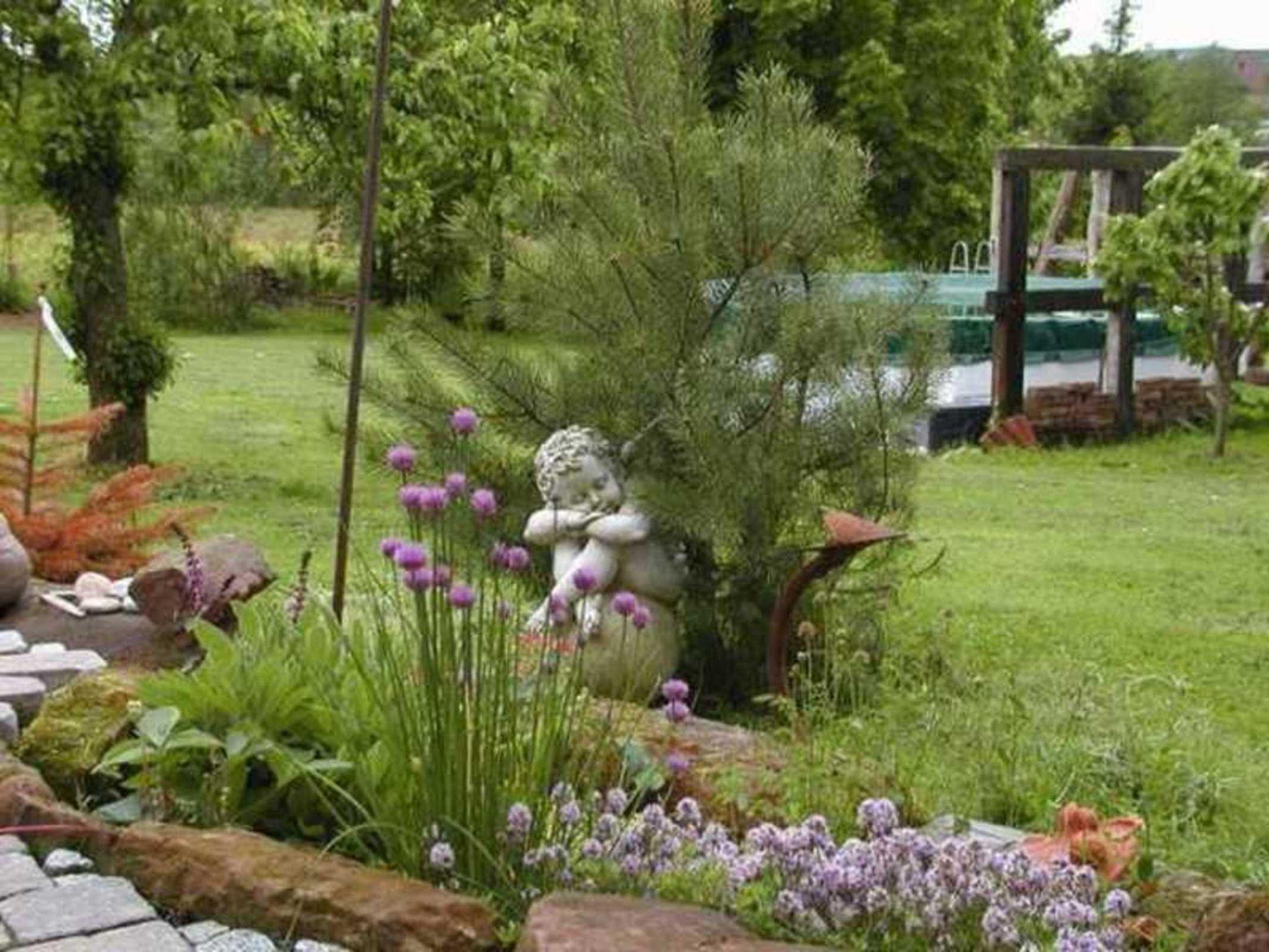 Über die Terrasse gelangen Sie in einen großen, angelegten Garten mit Gartenteich, Grillplatz, Kräuterspirale, Tischtennisplatte, Sitzgruppen, Schwimmbecken und Sandkasten.