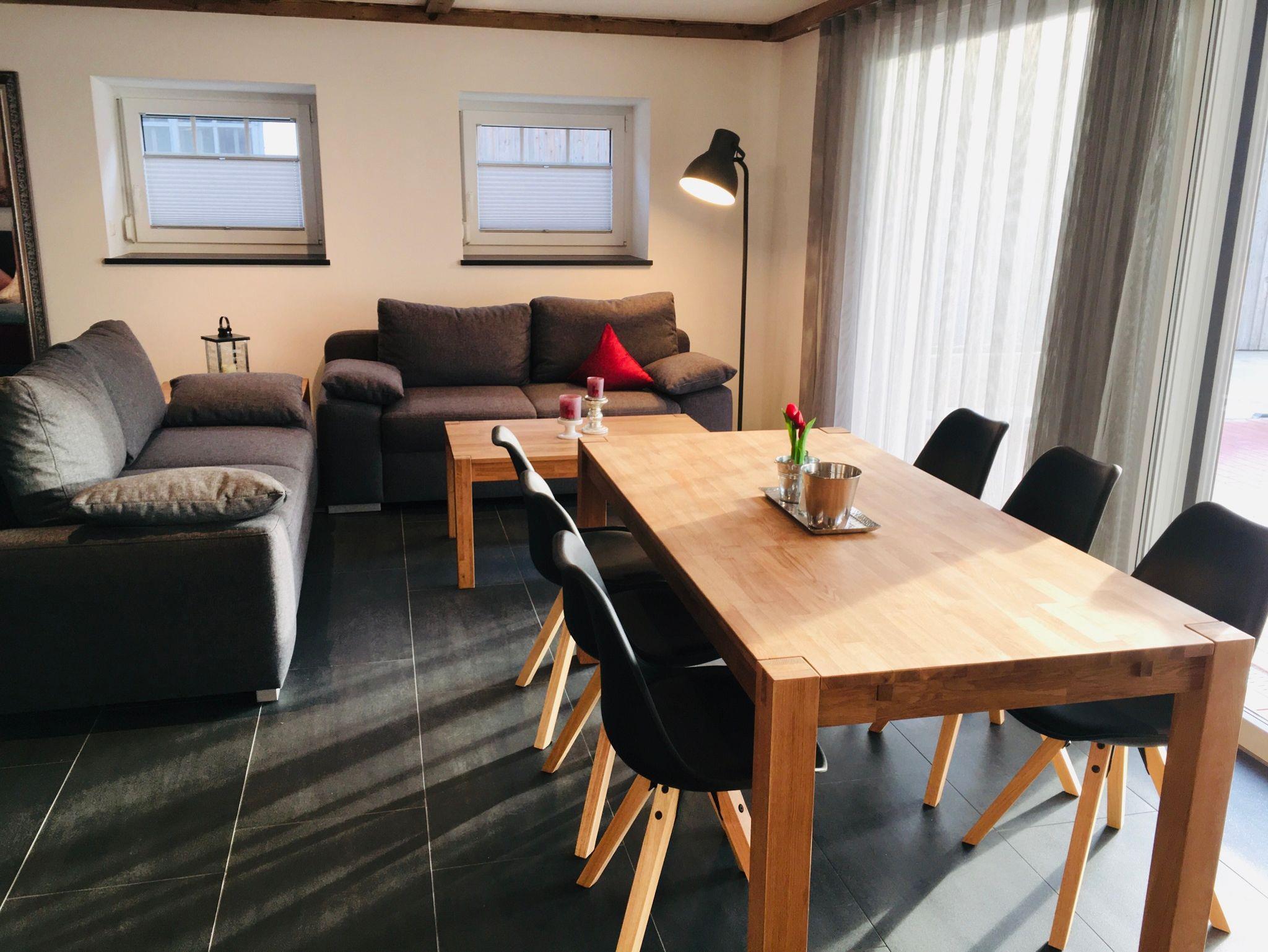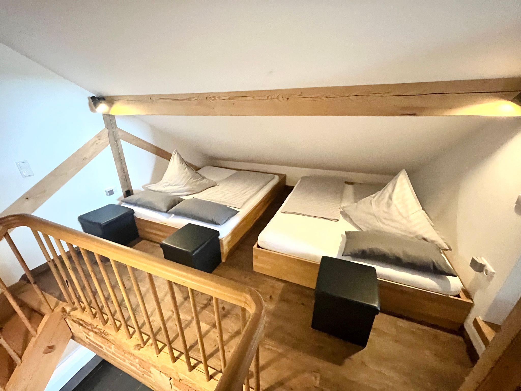 Die moderne Ferienwohnung bietet auf 95 Quadratmetern Platz für bis zu 6 Personen. Der offene und helle Wohn- und Essbereich verfügt über einen großen Esstisch mit Stühlen, zwei Sofas, einen Beistelltisch sowie TV und Radio. Von hier aus haben Sie Zugang zu einer ebenerdigen Terrasse. An den Wohn- und Essbereich schließt der offene Schlafbereich mit einem Boxspringbett an. Die moderne Küche ist mit Kühlschrank, Gefrierschrank, Backofen, Geschirrspüler, Kaffeemaschine, Mikrowelle und Toaster voll ausgestattet. Das Badezimmer verfügt über Waschbecken, WC, Dusche und Fön. Über eine Holztreppe gelangen Sie in die Galerie. Hier stehen 4 Einzelbetten zur Verfügung und Sie haben Zugang zu einem eigenen Balkon.