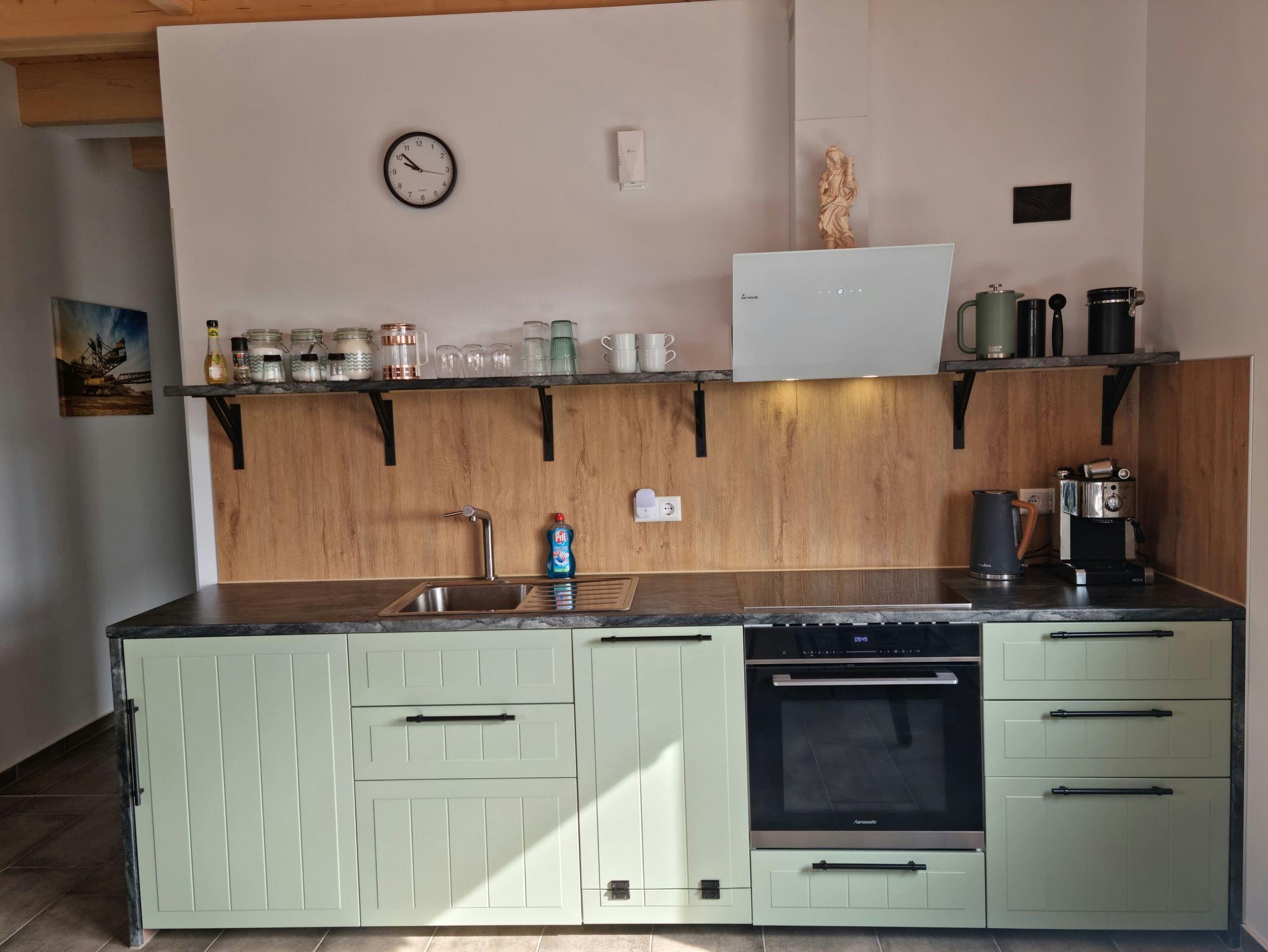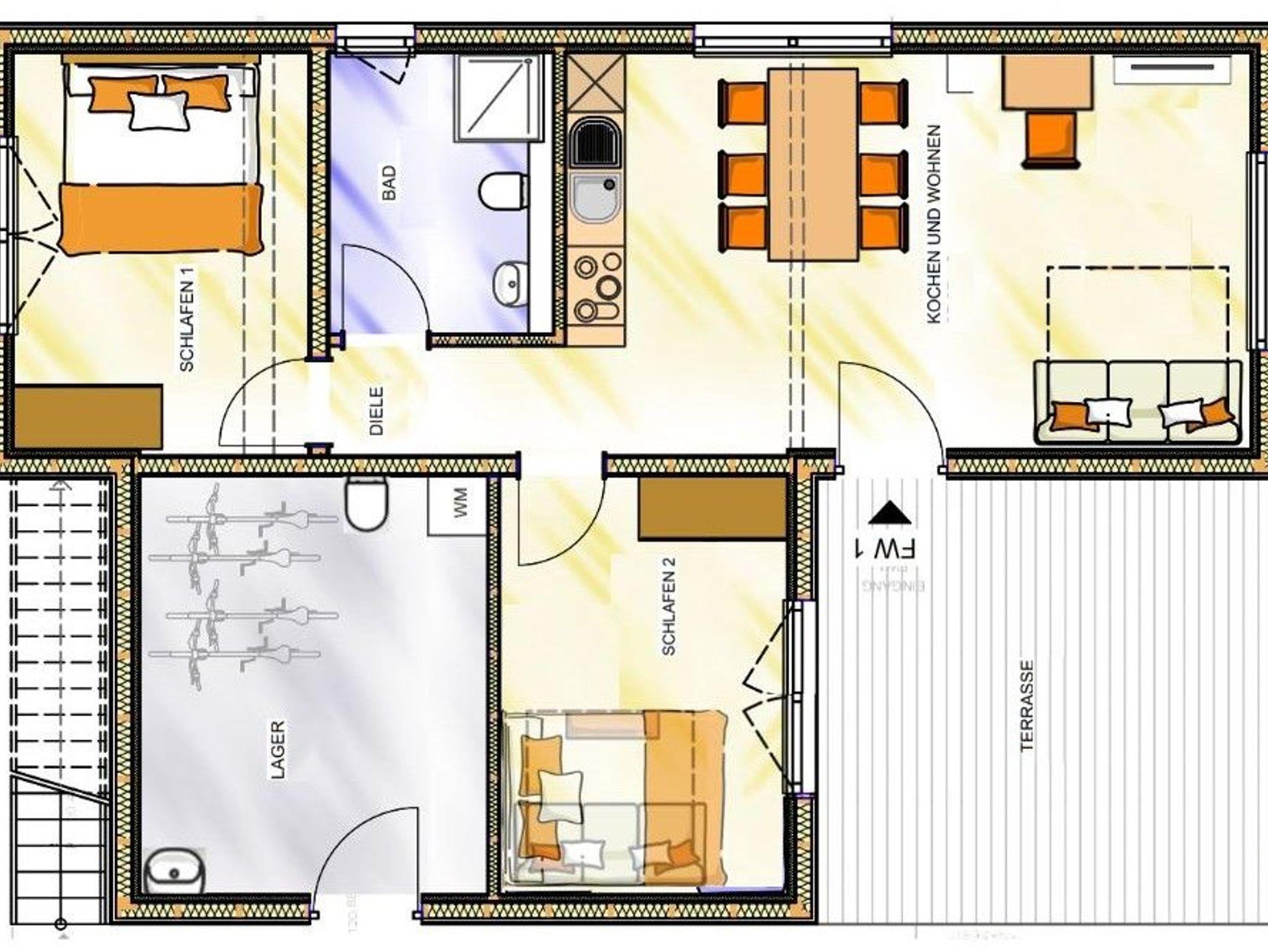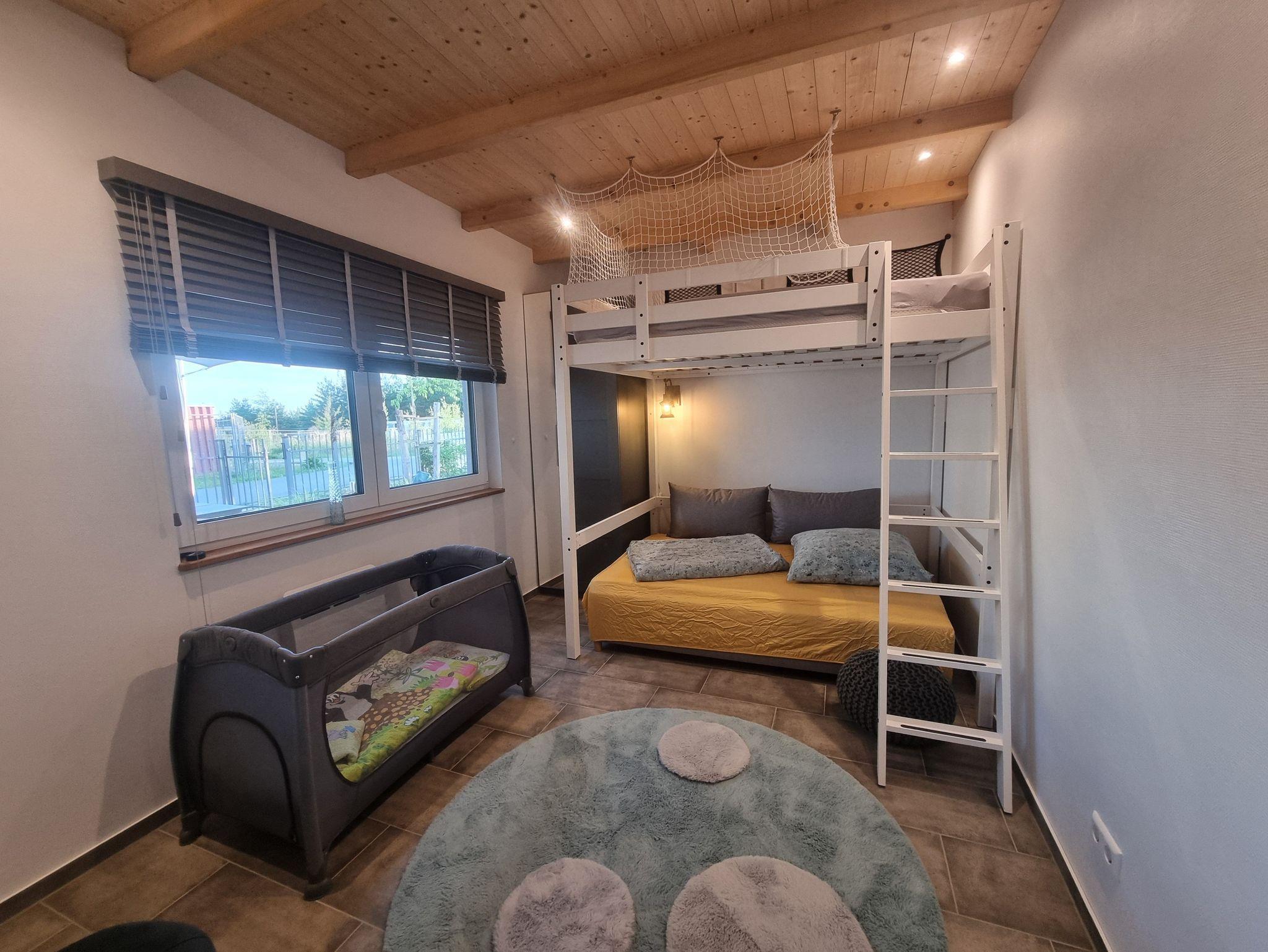 Die 60m² große Ferienwohnung Grubenlampe befindet sich im Erdgeschoss und besticht durch ihre großzügigen Räumlichkeiten. Sie verfügt über zwei Schlafzimmer und ist besnders für Familien geeignet. Das erste Schlafzimmer hat ein Doppelbett (1,80x2,00m). Das zweite Schlafzimmer hat ein Hochbett (1,40x2,00m), darunter befindet sich ein Schlafsofa (1,30x1,90m). Bei Bedarf kann auch das Sofa im Wohnzimmer zum Schlafen benutzt werden. Für Kinder gibt es einen Spielschrank mit Lego Duplo, Playmobil, Puzzles und Malsachen. Im Wohnzimmer befinden sich Bücher und Brettspiele. Der Sandkasten an der Terrasse lädt zum Spielen ein. Im Lagerraum befinden sich weitere Spiel- und Strandsachen sowie Kinderfahrräder in verschieden Größen.