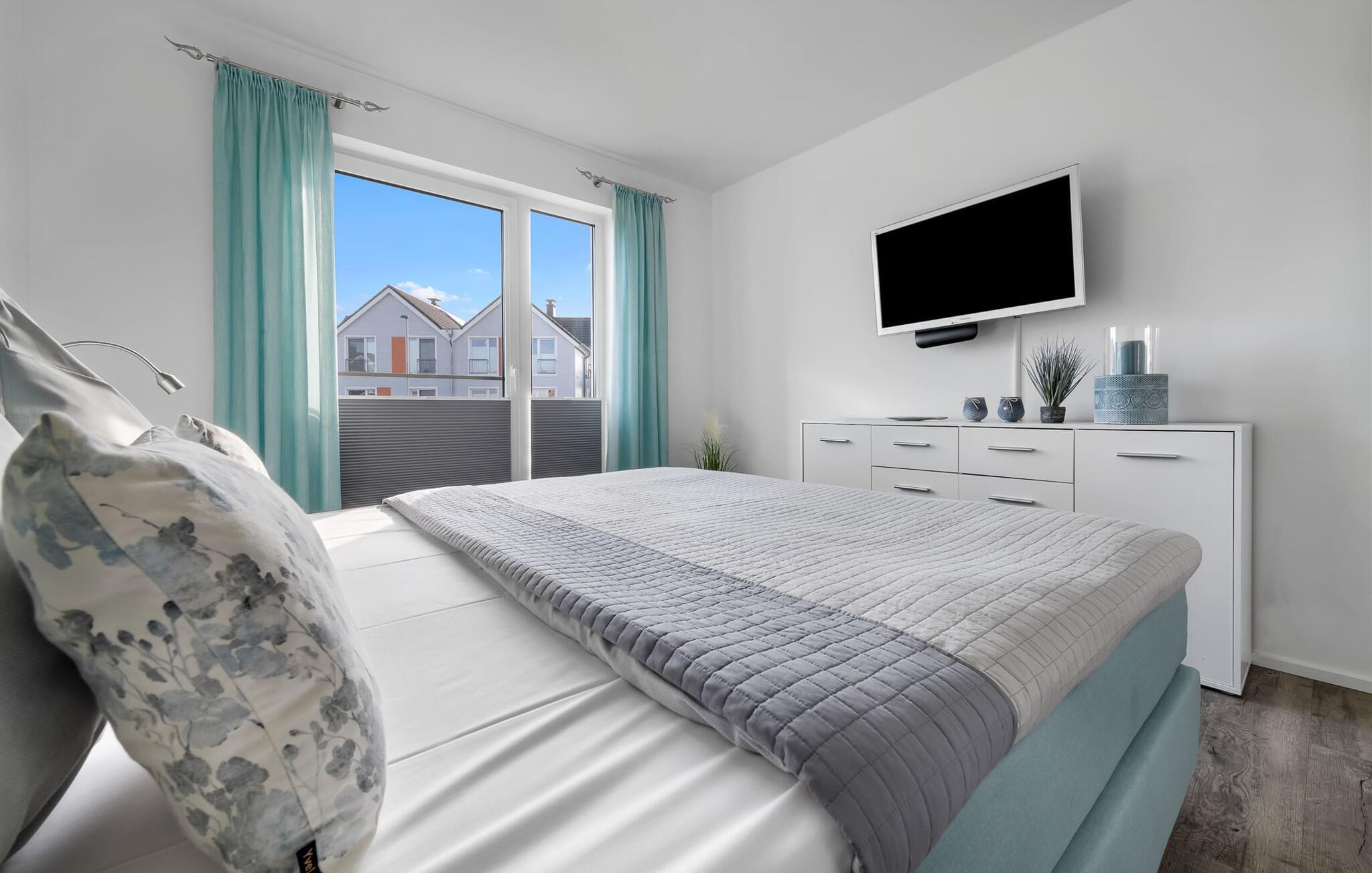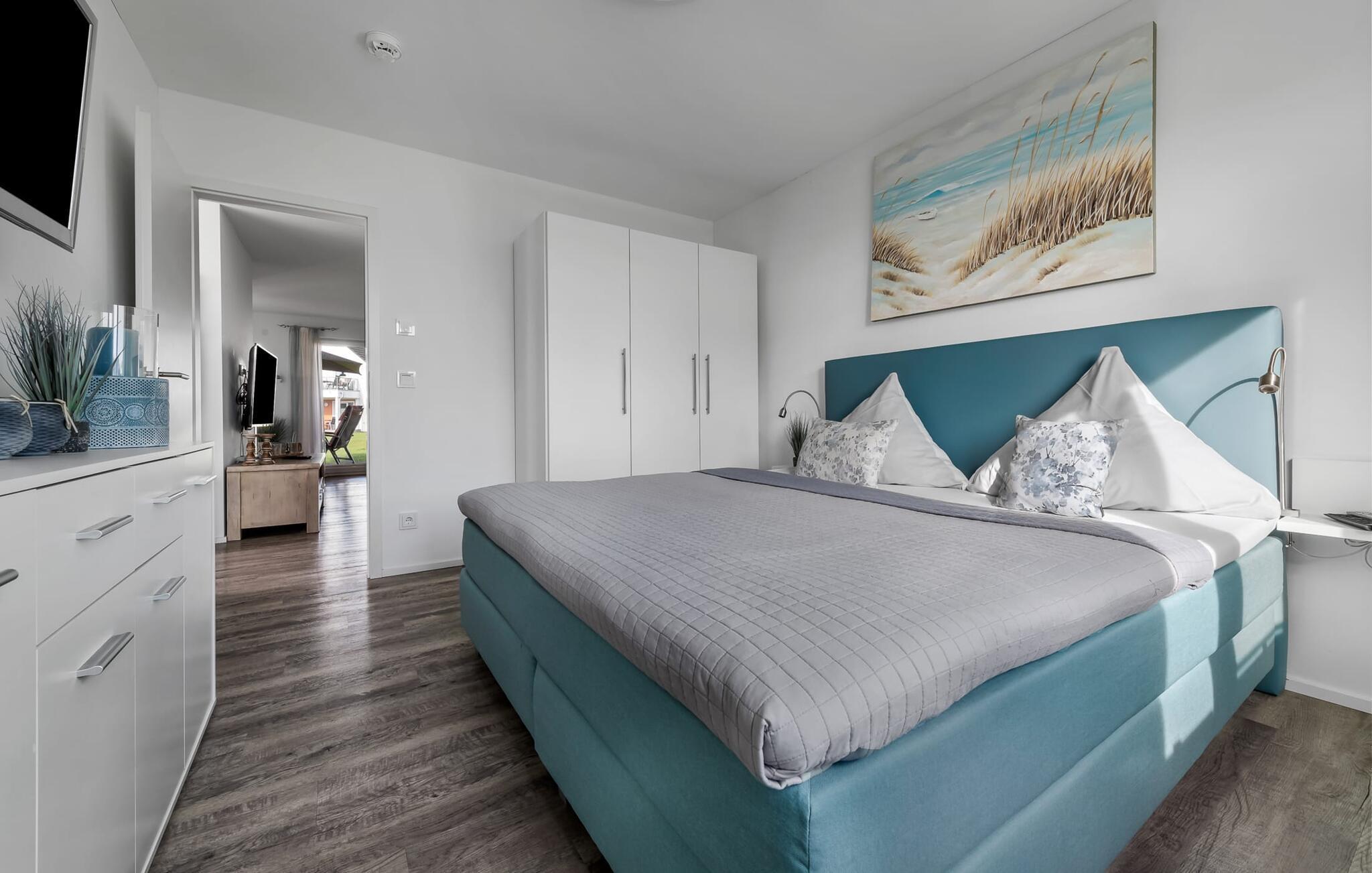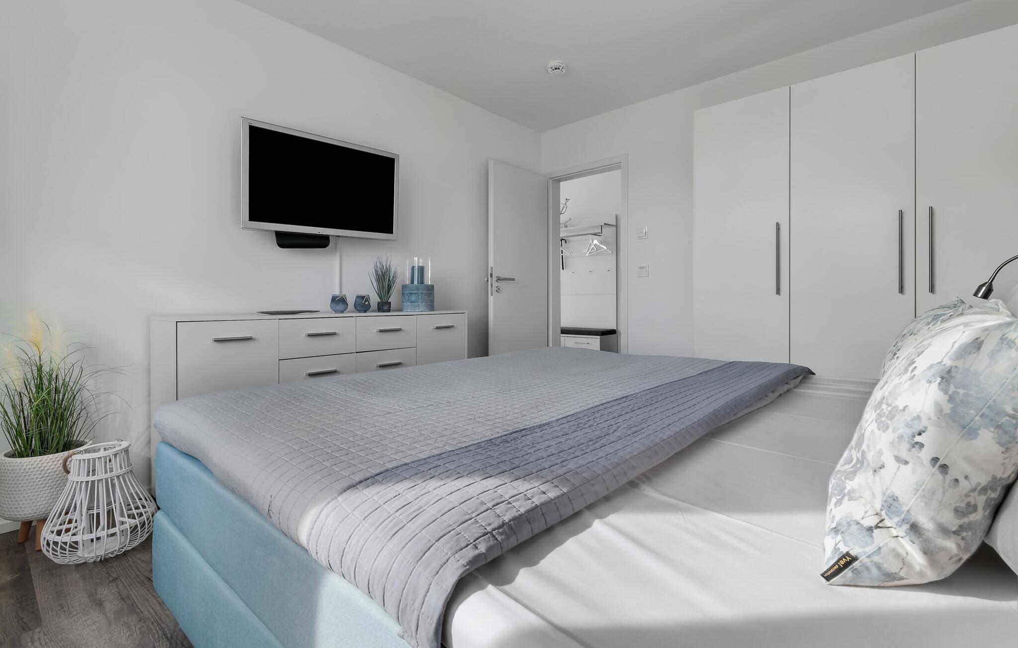 Die beiden Schlafzimmer, beide mit einem Fernseher ausgestattet, könnt ihr auch wunderbar im bequemen Boxspringbett im Hauptschlafzimmer entspannen. Im zweiten Schlafzimmer stehen euch zwei Boxspring-Einzelbetten zur Verfügung. Beide Zimmer bieten reichlich Schrankplatz.