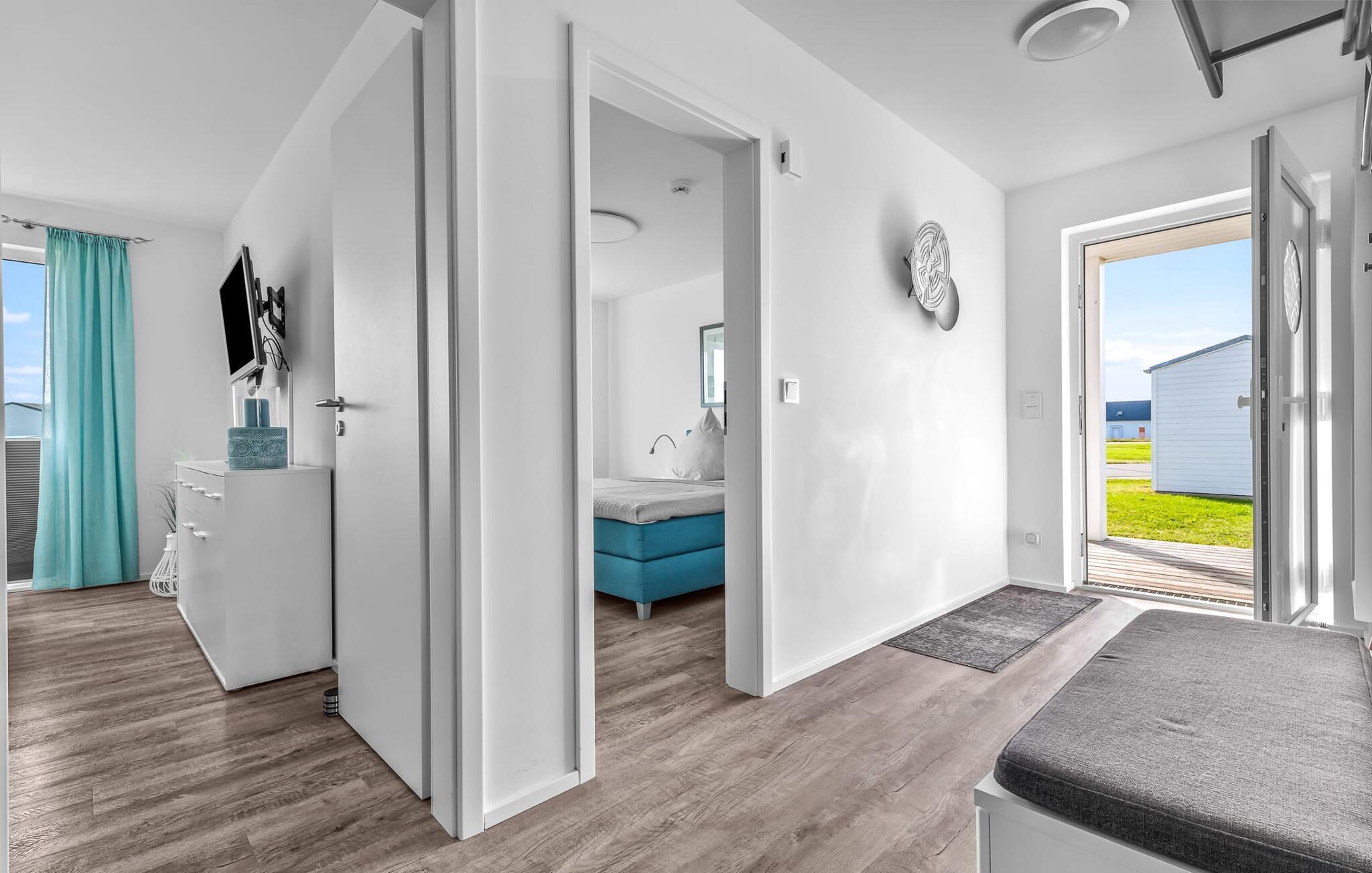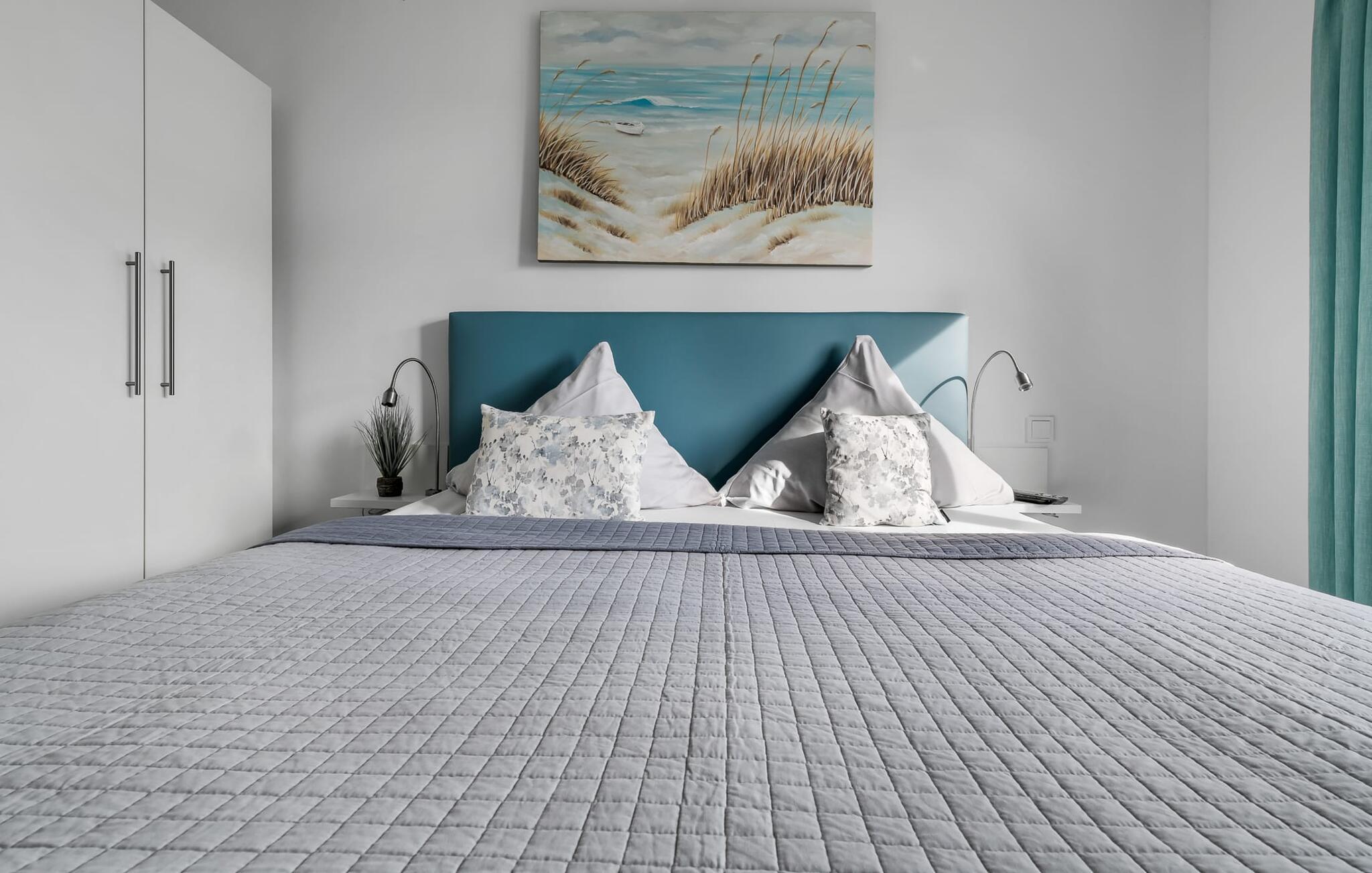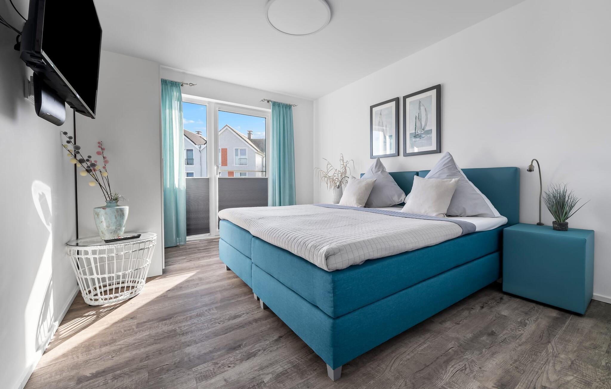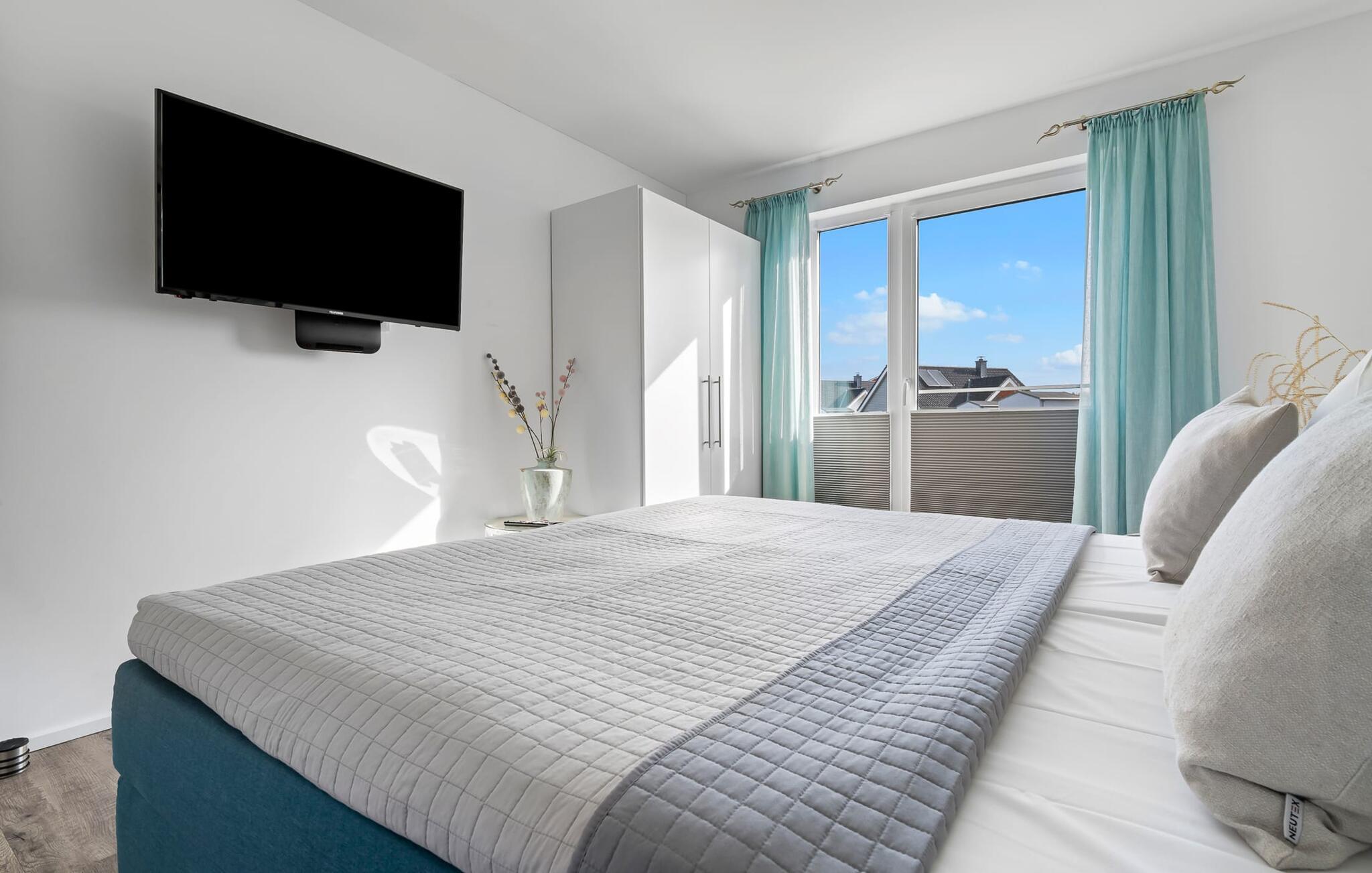 Die beiden Schlafzimmer, beide mit einem Fernseher ausgestattet, könnt ihr auch wunderbar im bequemen Boxspringbett im Hauptschlafzimmer entspannen. Im zweiten Schlafzimmer stehen euch zwei Boxspring-Einzelbetten zur Verfügung. Beide Zimmer bieten reichlich Schrankplatz.
