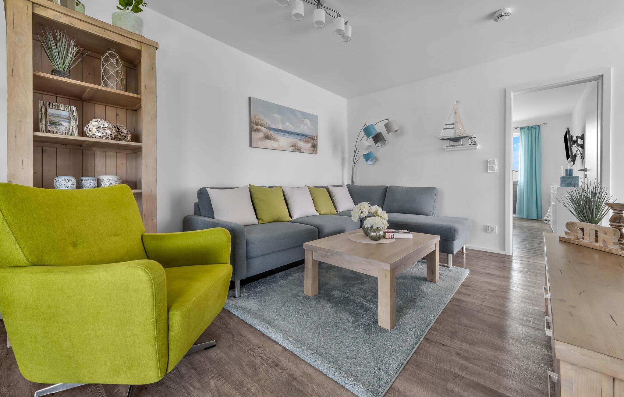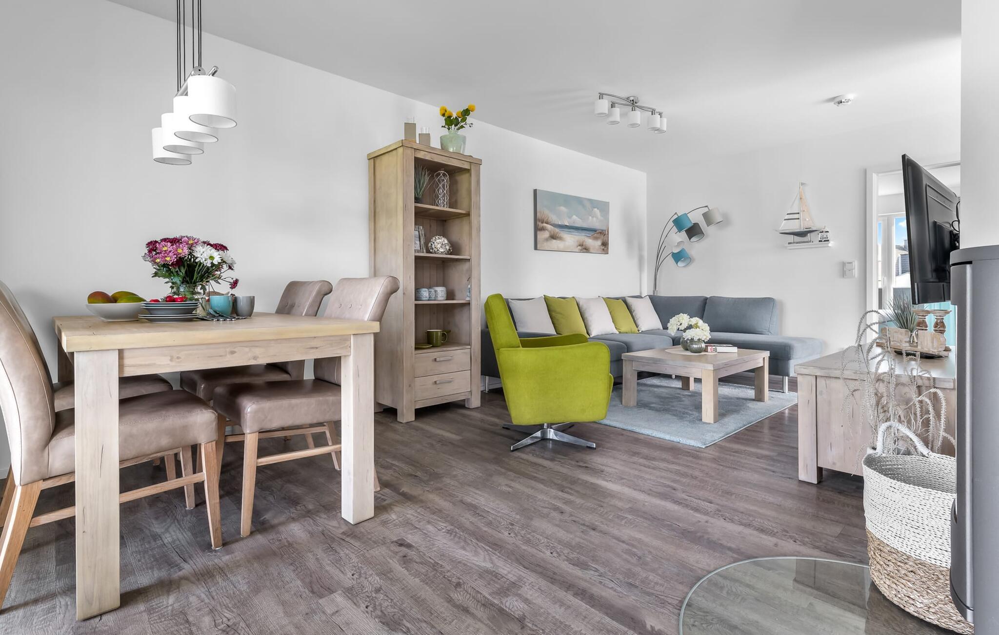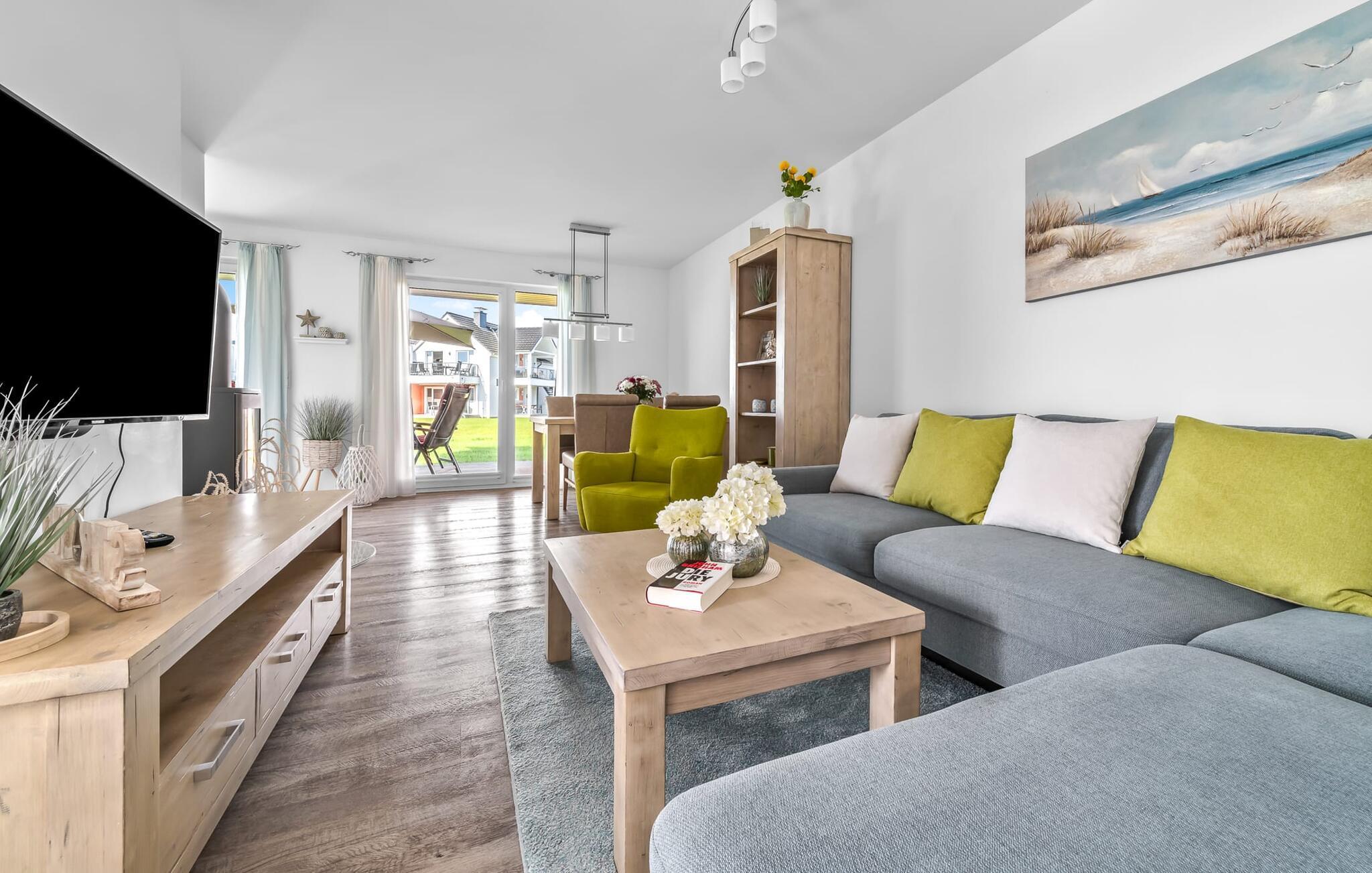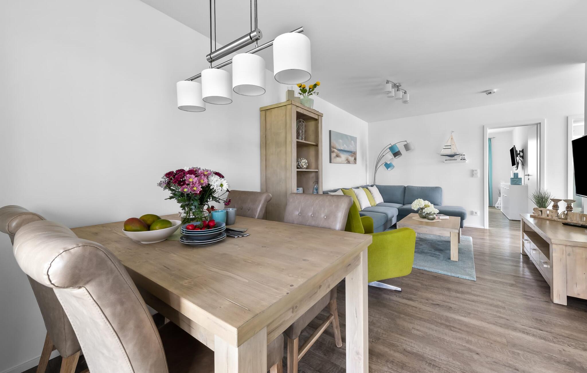 Die Ferienwohnung macht ihrem Namen alle Ehre, denn mit ihrem offenen Wohn-/Essbereich, der durch die bodentiefe Fensterfront hell und freundlich ist und dem gemütlichen Wohnbereich mit Relax-Sofa, will man diesen Ort gar nicht mehr verlassen.