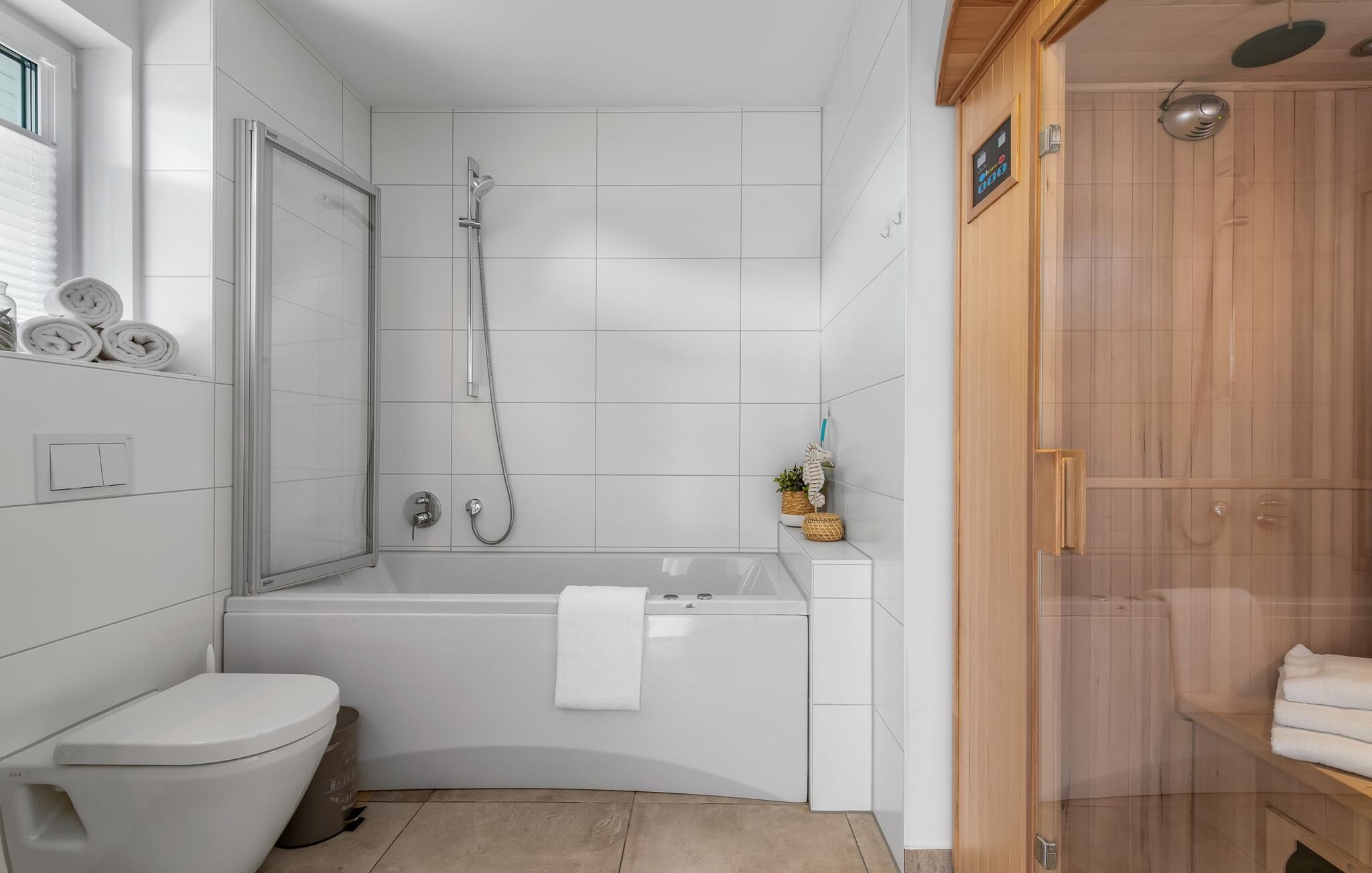 Ein Highlight ist ganz ohne Frage das Bad, oder eher der kleine, private Wellnessbereich. Mit seiner Whirlpool-Badewanne und der Infrarotsauna lassen sich erfolgreiche Urlaubstage erholsam abschließen. Hier steht auch eine private Waschmaschine.