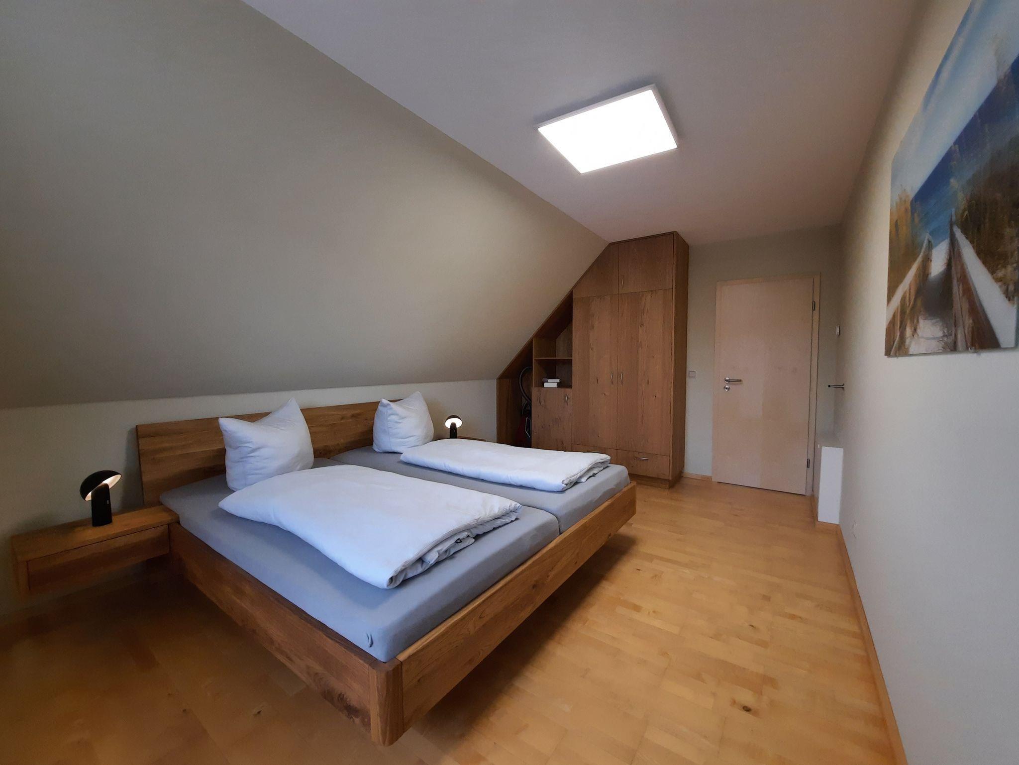 Die Ferienwohnung ist gemütlich, komfortabel und den heutigen Anforderungen entsprechend eingerichtet. Die 54 m² große Wohnung befindet sich im Obergeschoss eines Einfamilienhauses. Ausgestattet ist sie für 2 bis 4 Personen. Die Ferienwohnung verfügt über einen Schlafraum mit großzügigem Doppelbett, einem Wohnraum mit halb offener Küche und Essecke sowie ein Bad mit Du/WC.