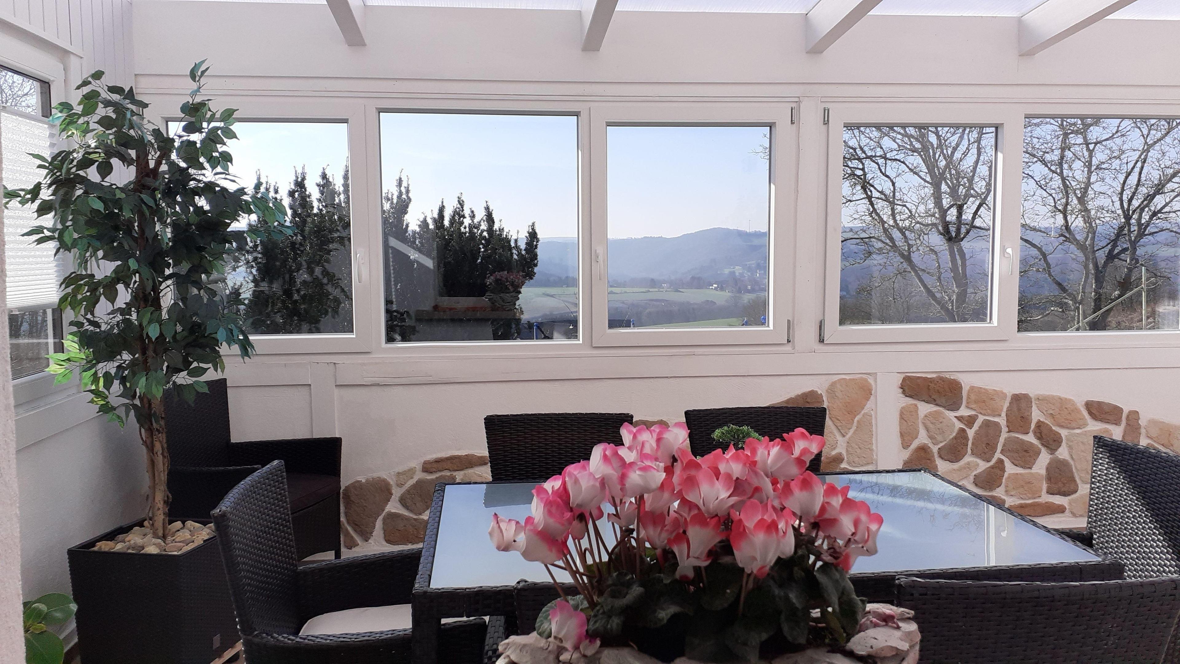Wintergarten mit Lounge-Möbeln und zusätzlich eine Terrasse mit Grillmöglichkeit im Freien