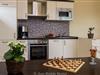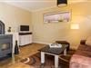 Über eine Treppe gelangen Sie in den großen und modern eingerichteten Wohnbereich mit offener Küche. Eine behagliche Sitzecke mit Flachbildfernseher und Kamin lädt zum Verweilen ein. In der komplett ausgestatteten Küchenzeile finden Sie unter anderem einen Ceranherd mit Backofen, eine Geschirrspülmaschine sowie eine Mikrowelle.