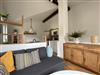 Über eine Treppe gelangen Sie in den großen und modern eingerichteten Wohnbereich mit offener Küche. Eine behagliche Sitzecke mit Flachbildfernseher lädt zum Verweilen ein. In der komplett ausgestatteten Küchenzeile finden Sie unter anderem einen Ceranherd mit Backofen, eine Geschirrspülmaschine sowie eine Mikrowelle.