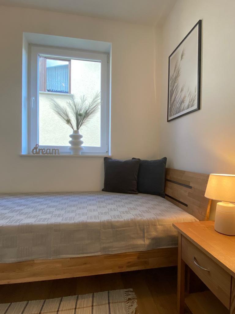 Über einen separaten Eingang gelangen Sie in die untere Ebene der modern eingerichteten Ferienwohnung. Hier finden Sie das Elternschlafzimmer mit Doppelbett, das Kinderschlafzimmer mit einem Einzelbett sowie das Badezimmer mit Dusche und WC.