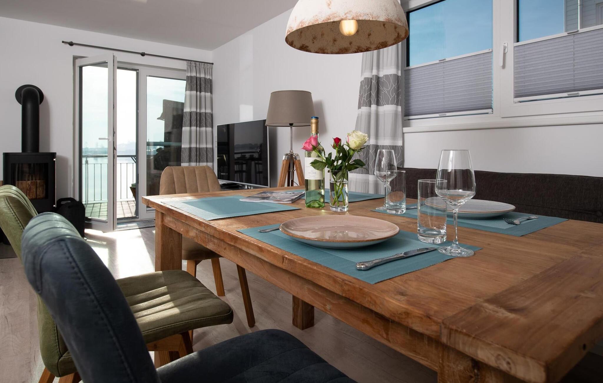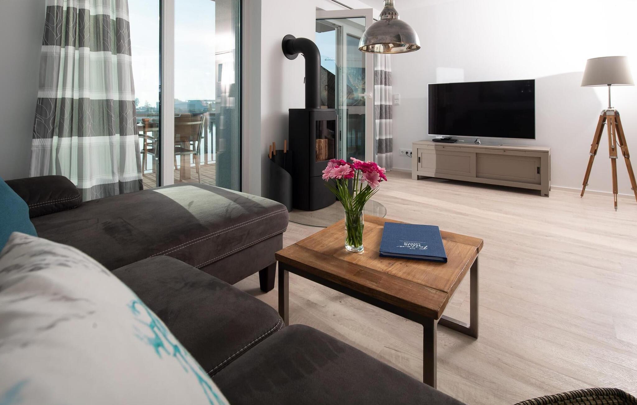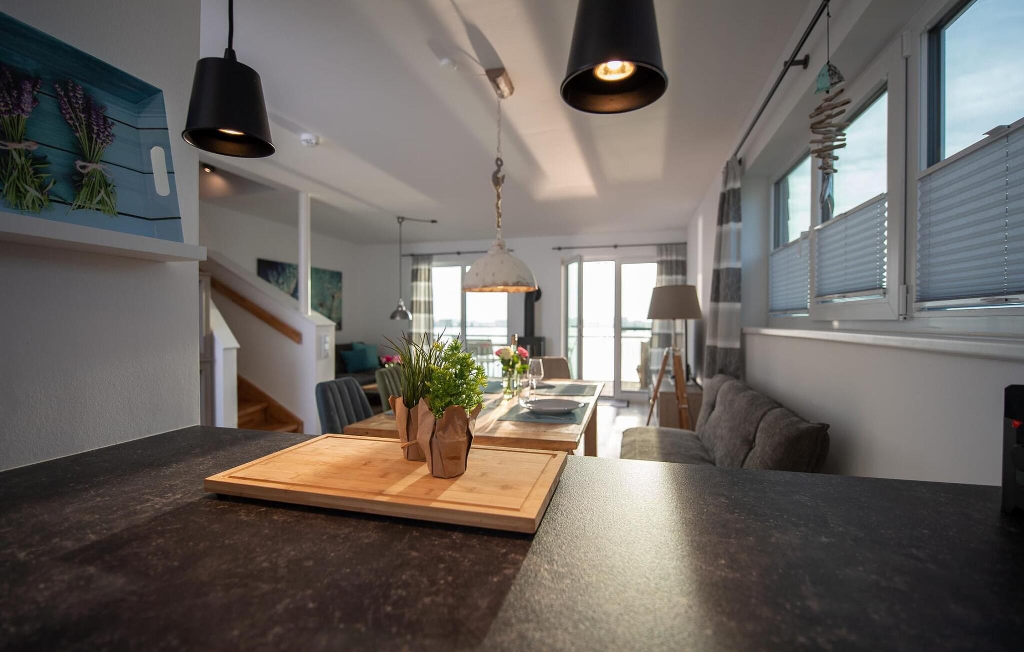 Der offen gestaltete, lichtdurchflutete Wohn- und Essbereich befindet sich im Erdgeschoss des Ferienobjekts. Von hier aus gelangt man direkt auf die angrenzende Terrasse. Ob bei einem gemeinsamen Grillabend mit Weber-Elektrogrill oder gemütlich vorm KaminHafenkino ist hier garantiert. Die Küche lässt keine Wünsche offenrundum ausgestattet erlaubt diese vollen Urlaubskomfort. Frühstück auf der Terrasse direkt am Wasser bei traumhaften Sonnenaufgängendas ist Urlaub!