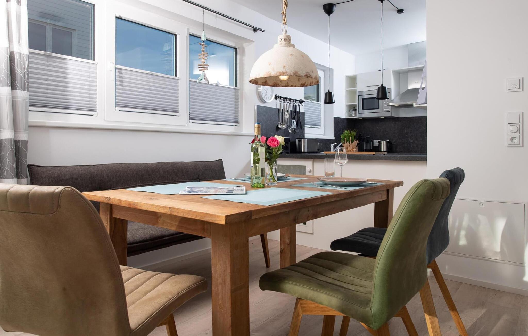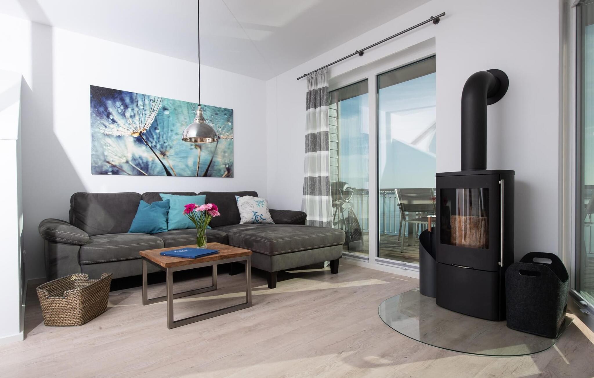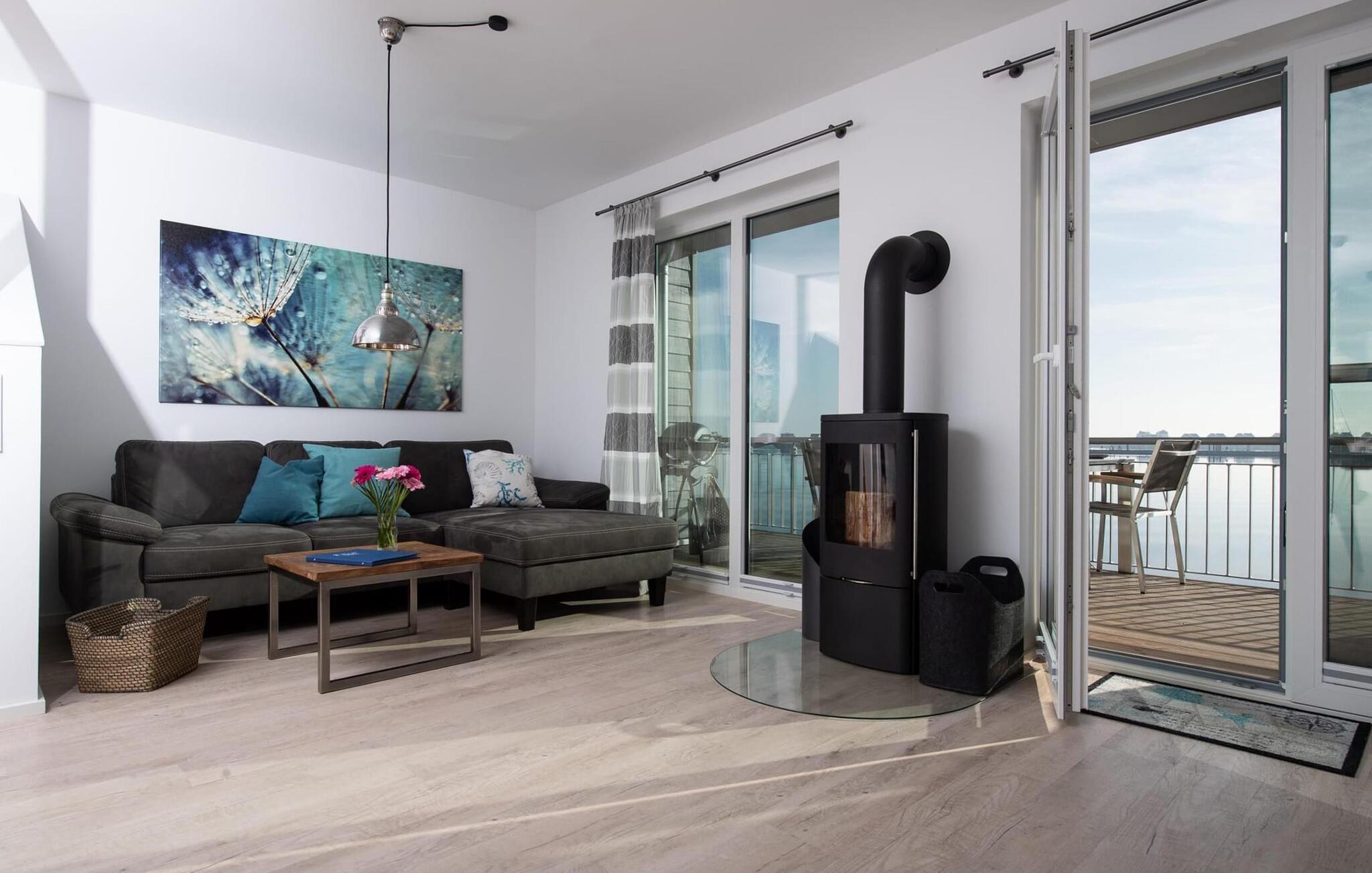 Der offen gestaltete, lichtdurchflutete Wohn- und Essbereich befindet sich im Erdgeschoss des Ferienobjekts. Von hier aus gelangt man direkt auf die angrenzende Terrasse. Ob bei einem gemeinsamen Grillabend mit Weber-Elektrogrill oder gemütlich vorm KaminHafenkino ist hier garantiert. Die Küche lässt keine Wünsche offenrundum ausgestattet erlaubt diese vollen Urlaubskomfort. Frühstück auf der Terrasse direkt am Wasser bei traumhaften Sonnenaufgängendas ist Urlaub!