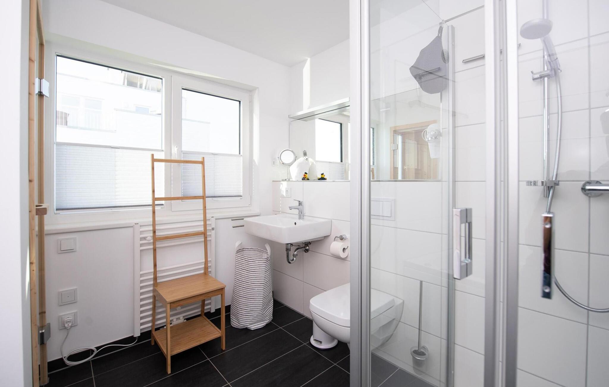 Ebenfalls auf dieser Ebene befindet sich das voll ausgestattete Badezimmer mit Wasserblick. Ein Duschbad im Erdgeschoss sorgt für zusätzlichen Komfort.