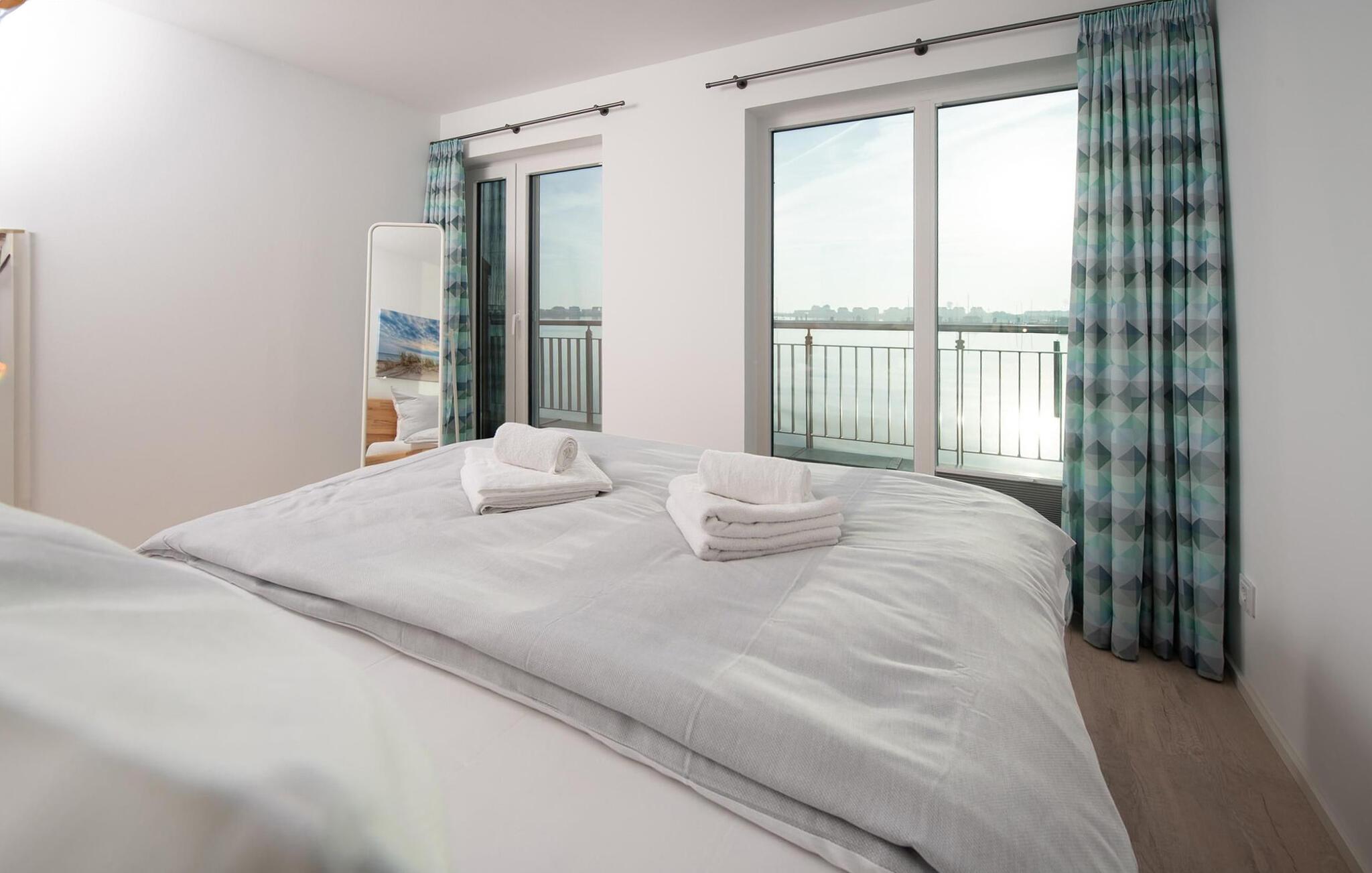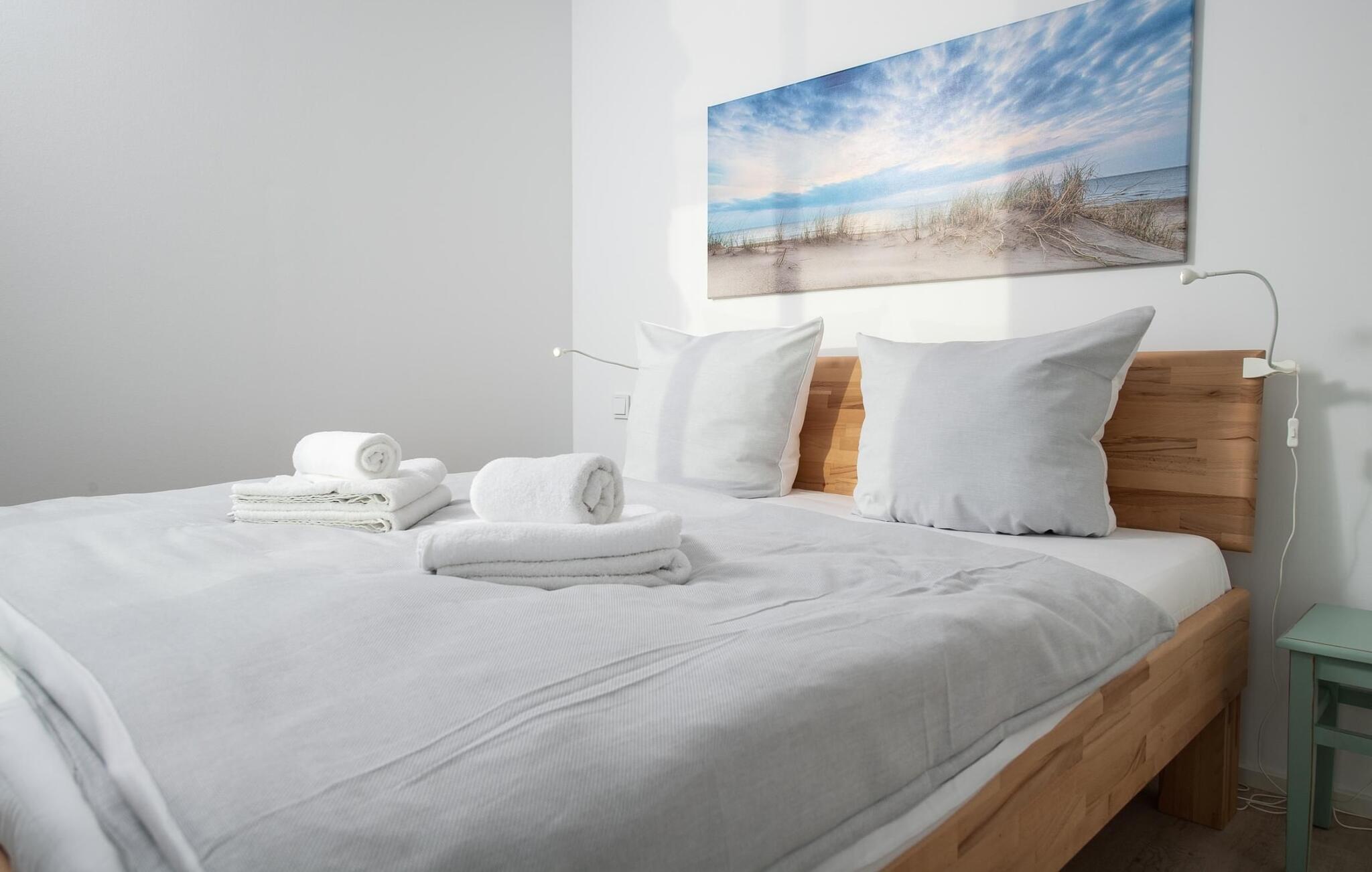 Der Ruhebereich des Ferienhauses befindet sich im ersten Obergeschoss. In zwei Schlafzimmern darf Gast einschlafen und aufwachen bei Wasserblick. Das Hauptschlafzimmer ist zum Hafen hin ausgerichtet und mit einem Doppelbett ausgestattet. Bei einem morgendlichen Kaffee lassen sich auf der angrenzenden Terrasse ablegende Segelschiffe beobachten. Das zweite Schlafzimmer erlaubt einen Blick auf den Ostseefjord Schlei und verfügt über zwei flexibel zusammenschiebbare Einzelbetten sowie einen zusätzlichen TV mit Home Entertainment Programm. Ein komfortabler Schlafsessel bietet einen weiteren Schlafplatz für eine Person.