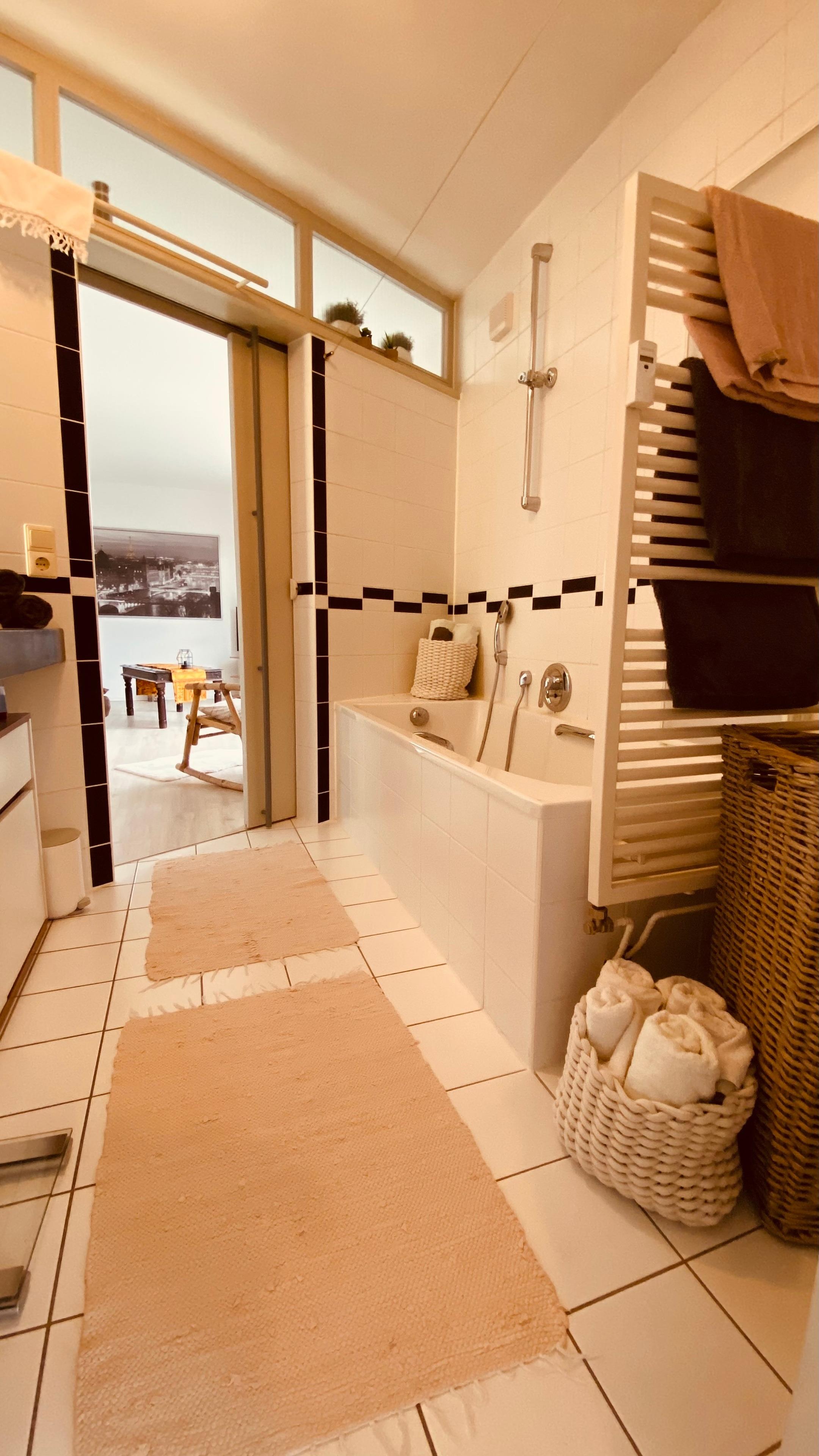 Das moderne Badezimmer ist mit Waschbecken, Dusche und Badewanne ausgestattet und ist sowohl von Schlafzimmer wie auch Wohnzimmer begehbar.
