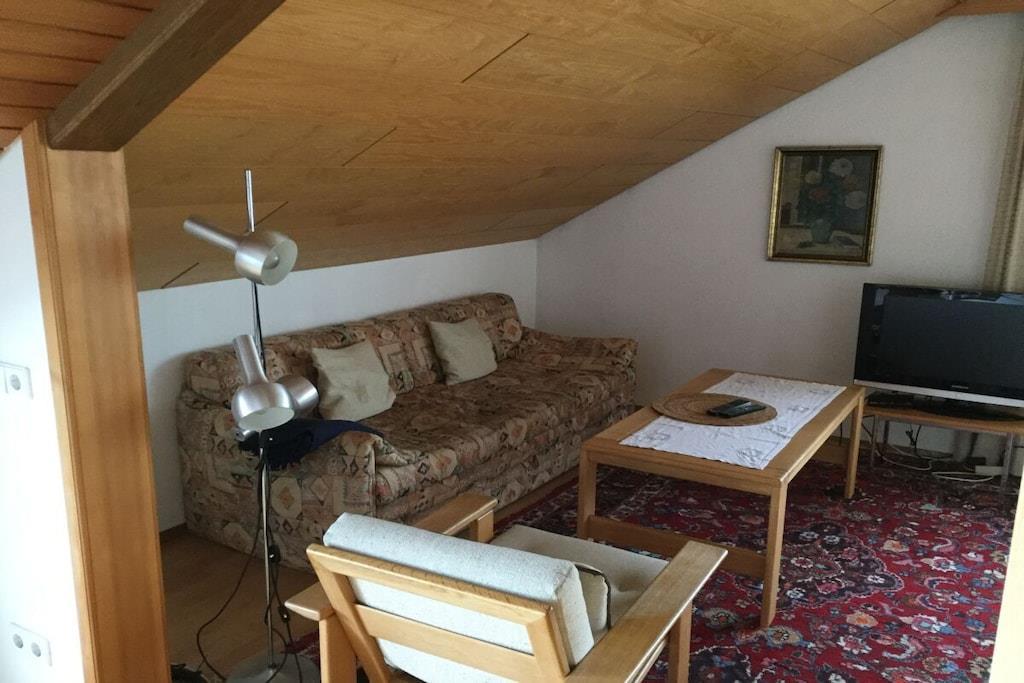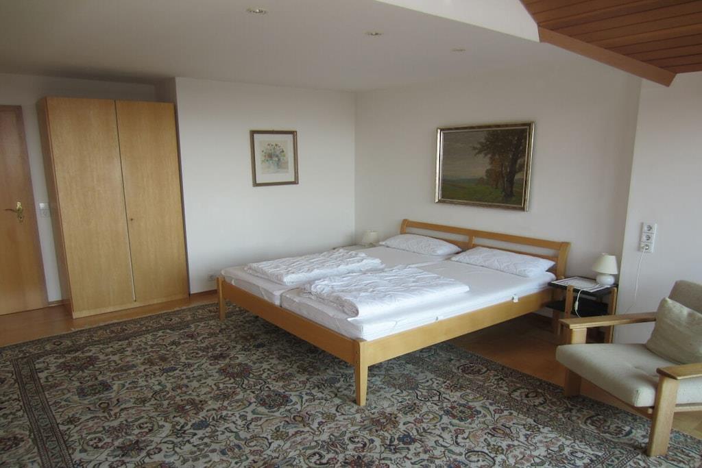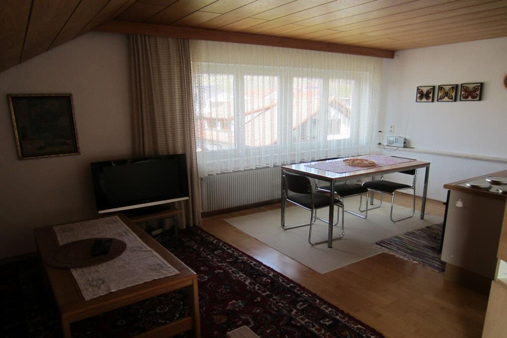 Unsere Ferienwohnung liegt im 2.OG. mit herrlichem Blick auf Bodensee, Schweizer-und Österreichische Berge. Auf einer Wohnfläche von ca. 35 qm finden sich im Wohn/Schlafbereich ein Doppelbett und eine Schlafcouch für insges. 3 Pers.. Eine vollausgestattete Küchenzeile mit Backofen, Kühlschrank. Radio und Farbfernseher. Separate Dusche/WC. WLAN steht Ihnen kostenfrei zur Verfügung.