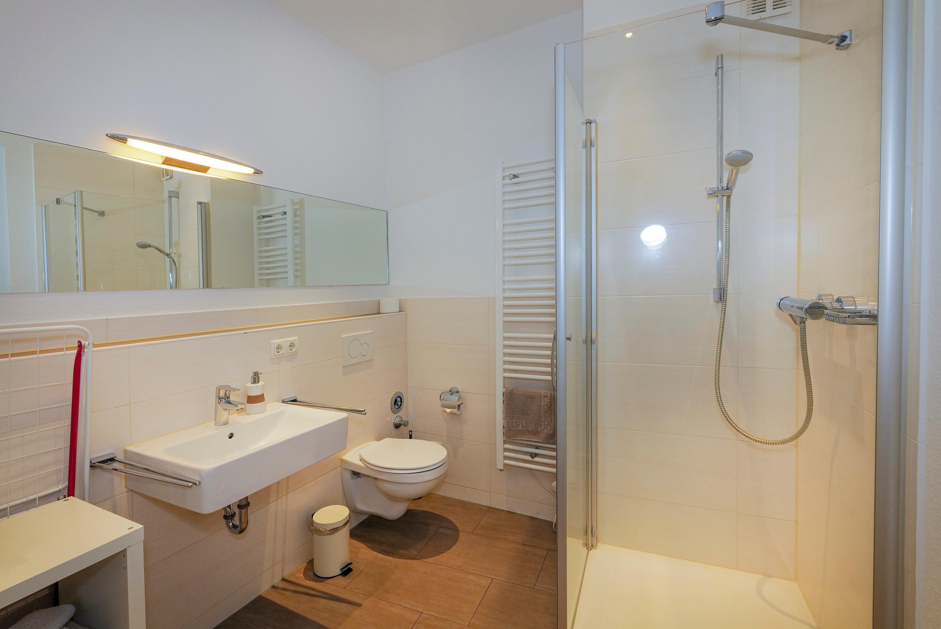 Das modern gestaltete Bad hat eine bodengleiche Dusche, einen Handtuchwärmer und eine Waschmaschine zur alleinigen Benutzung.