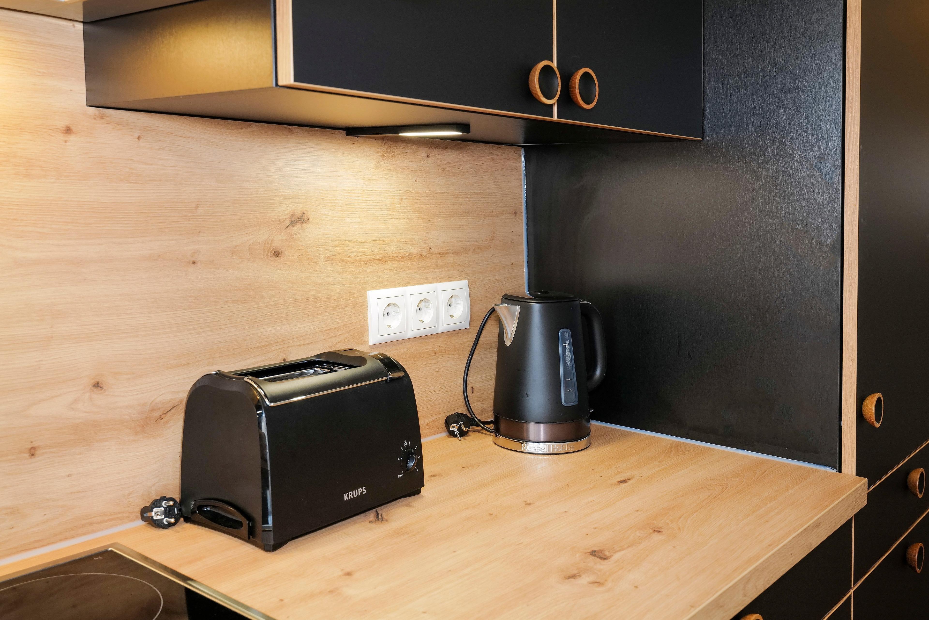 Nebenan gelangen Sie in die neue moderne Küche mit Vollausstattung sowie Geschirr in den Farben der Wohnung. Hier befindet sich ein zusätzlicher Essplatz.