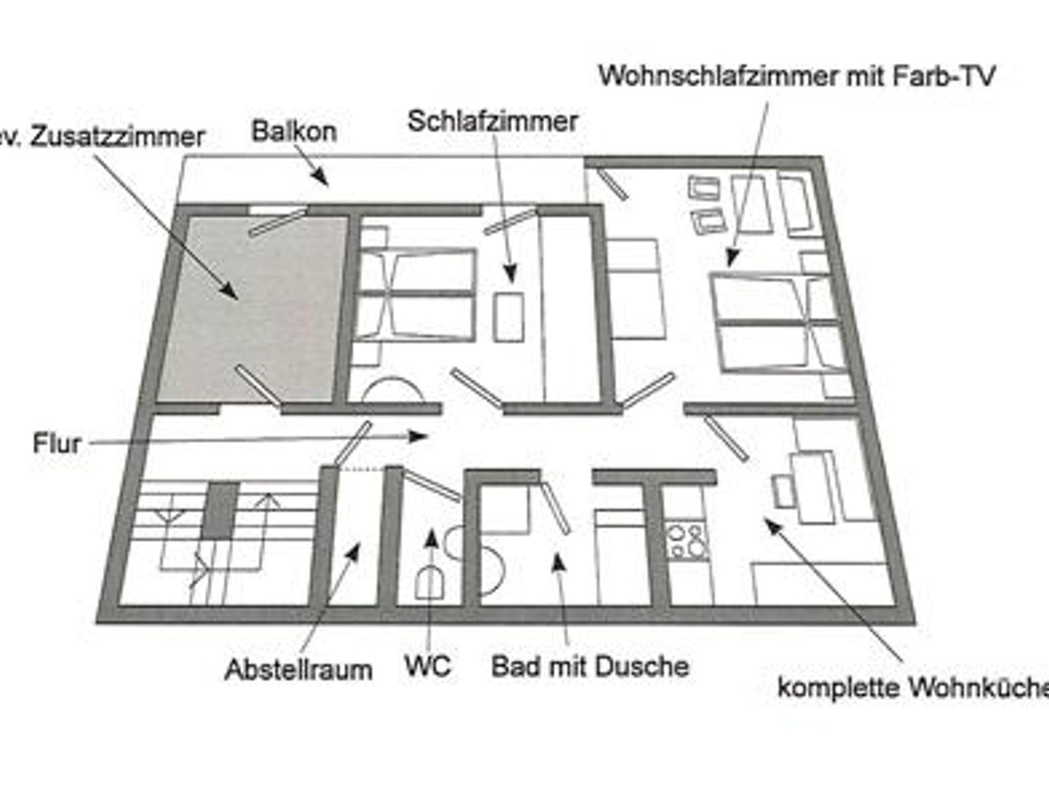 Die Ferienwohnung befindet sich in der 1. Etage und ist bestens geeignet für bis zu 4 Personen. Im Wohn-Schlafraum befinden sich 1 Doppelbett (2 x 2 m) und 1 gemütliche Sitzecke. Im zweiten Schlafraum stehen ein weiteres Doppelbett und ein Waschbecken zur Verfügung. Die separate Küche ist voll ausgestattet mit Geschirrspülmaschine, Backofen, Mikrowelle, Kaffeemaschine, Wasserkocher und einer Essecke. Das Badezimmer mit Dusche und Badewanne rundet das Gesamtbild ab. Das WC ist separat. Vom Wohn-Schlafraum und vom Schlafzimmer aus ist der möblierte Balkon zugänglich.