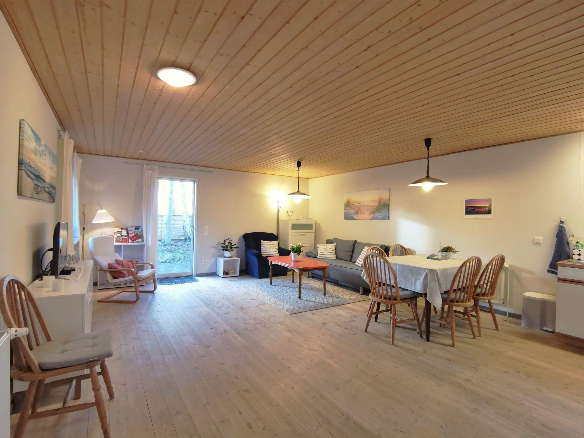 Das Häuschen besteht aus einem großen Wohnraum mit Sofa, Sessel, offener Küche und Essecke sowie einem kleinen Schlafzimmer mit zwei Einzelbetten und einem Badezimmer mit Dusche und Fußbodenheizung. Vom Wohnzimmer aus erreicht man die möblierte Terrasse und den kleinen Garten.