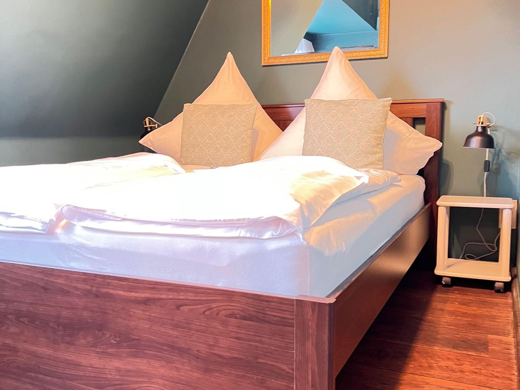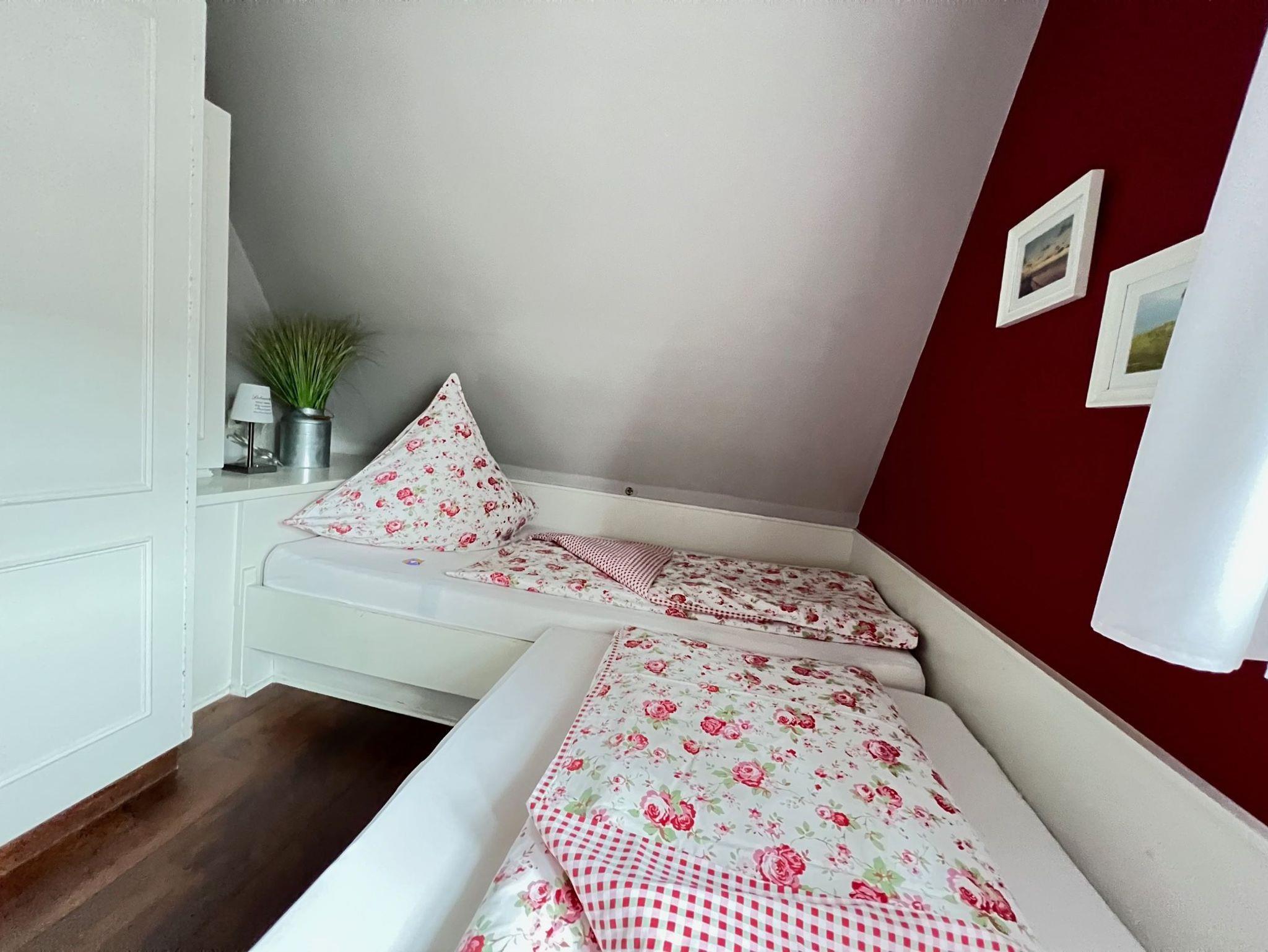 einladende Schlafzimmer mit einem Doppelbett bzw. zwei Einzelbetten. Ein freundliches Badezimmer mit