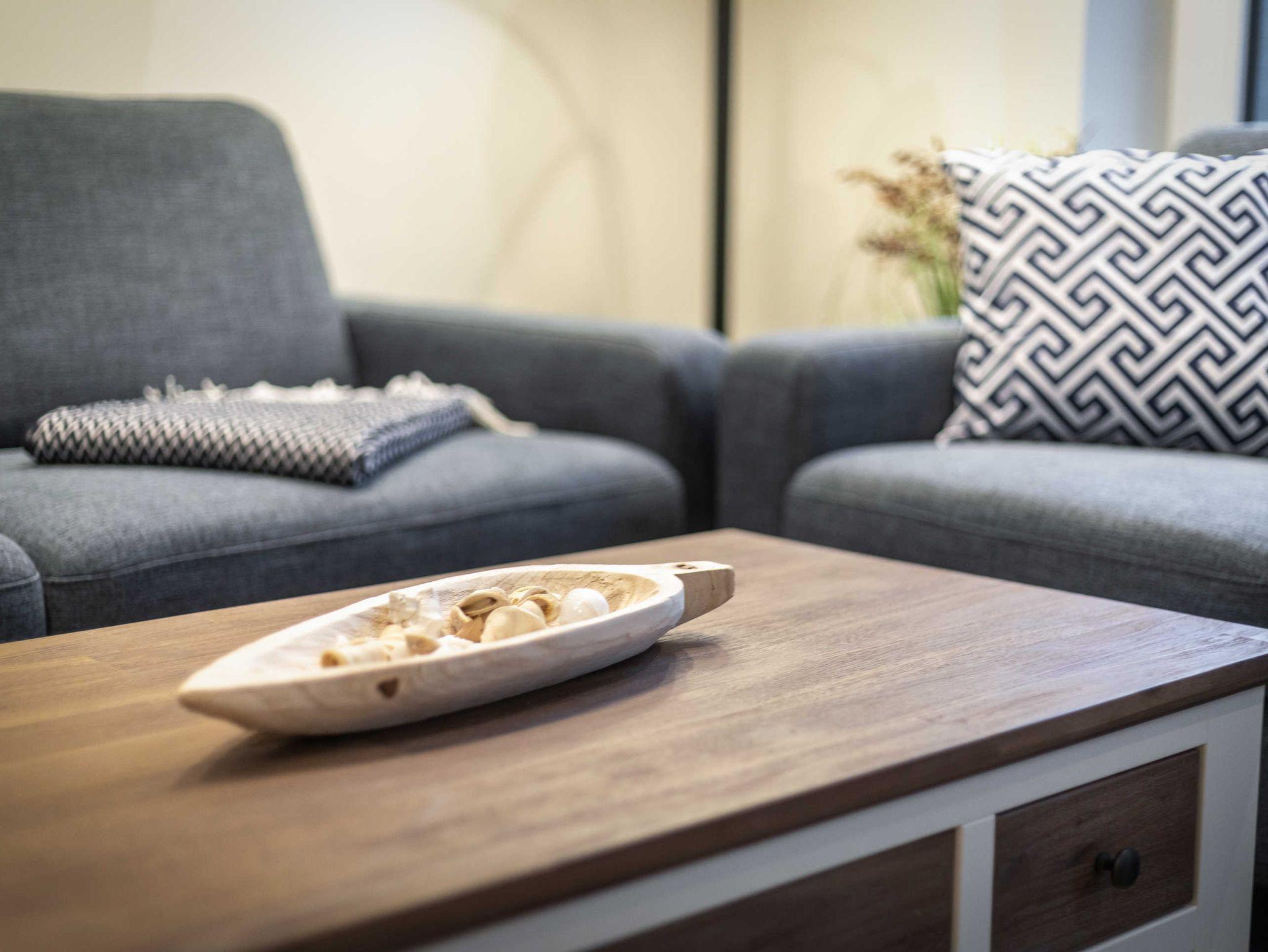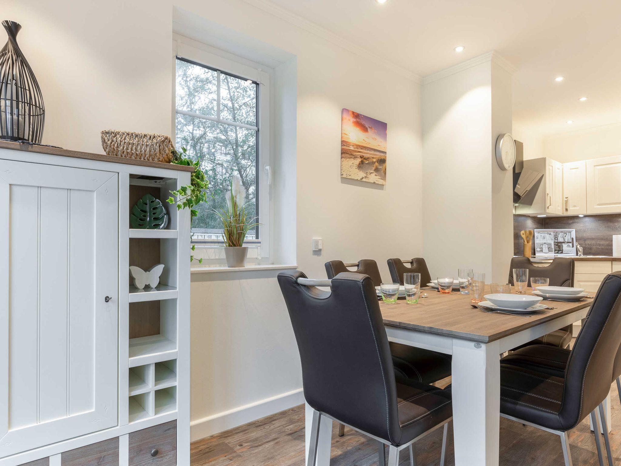 Das Ferienhaus bietet mit 135 qm Wohnfläche bis zu 6 Personen Platz. Die komfortabel ausgestattete Unterkunft integriert neben einem großzügigen Wohnzimmer auch drei Schlafzimmer mit je einem Doppelbett. An den Wohnbereich im Erdgeschoss schließt sich eine offene Küche an.