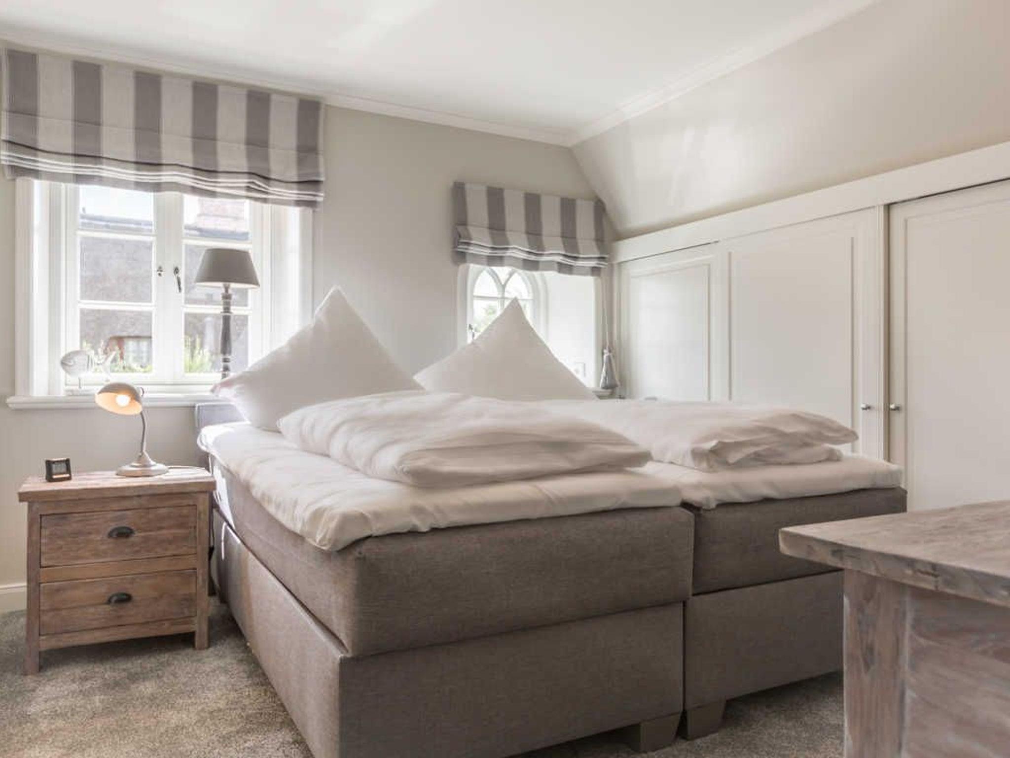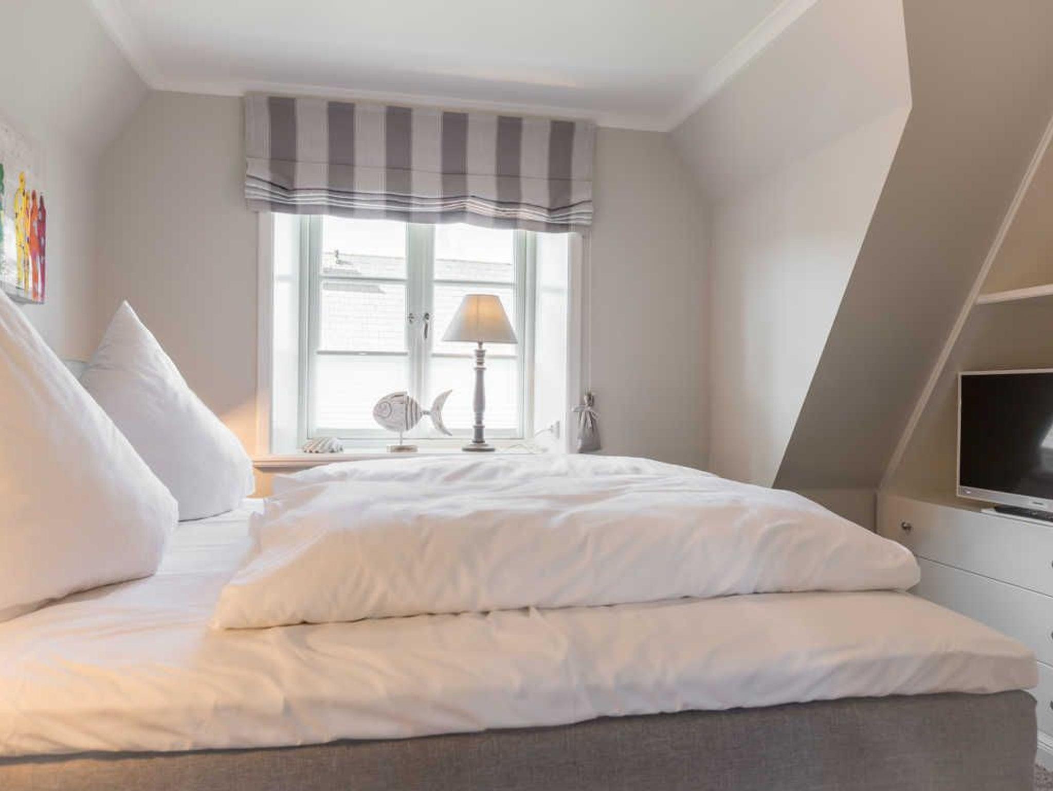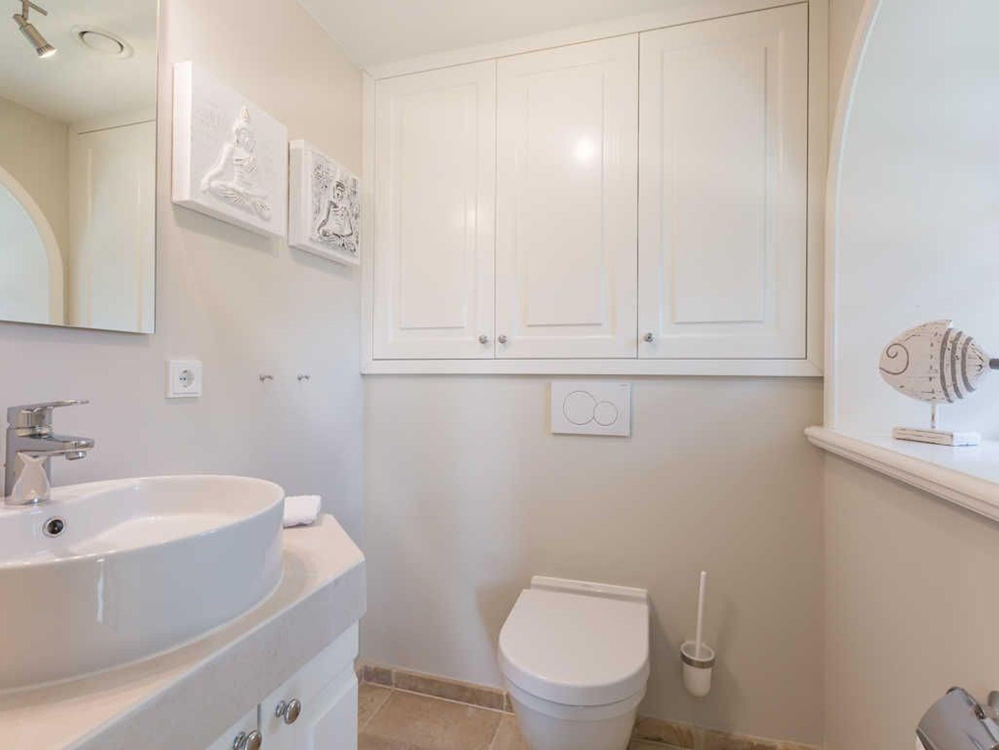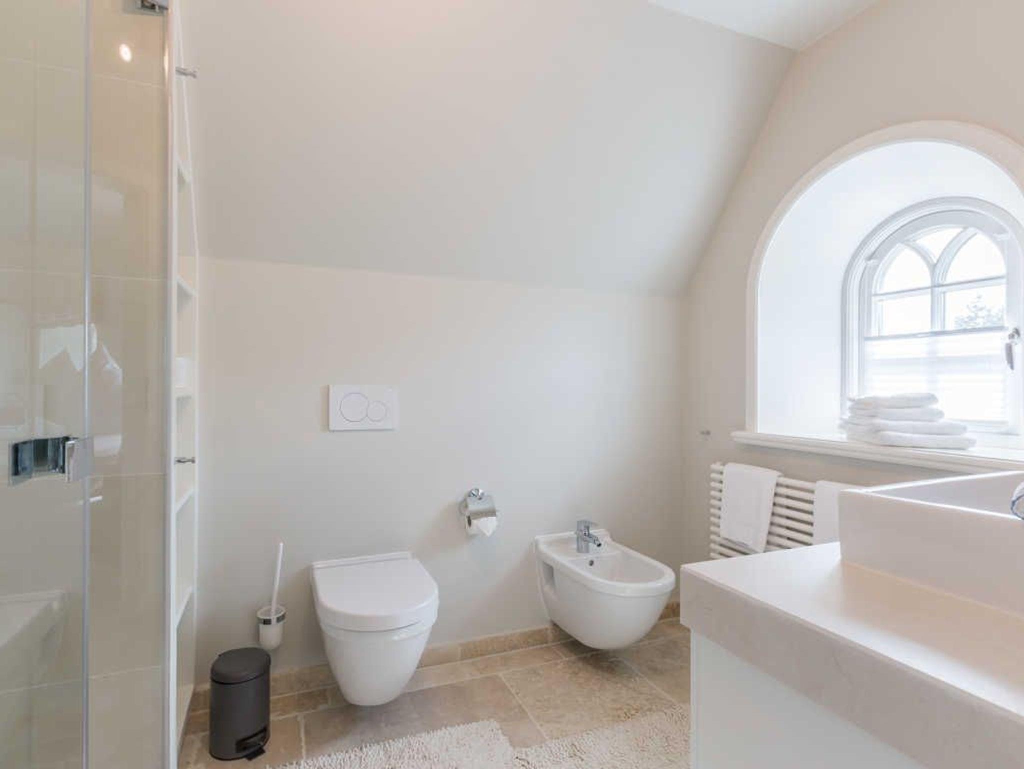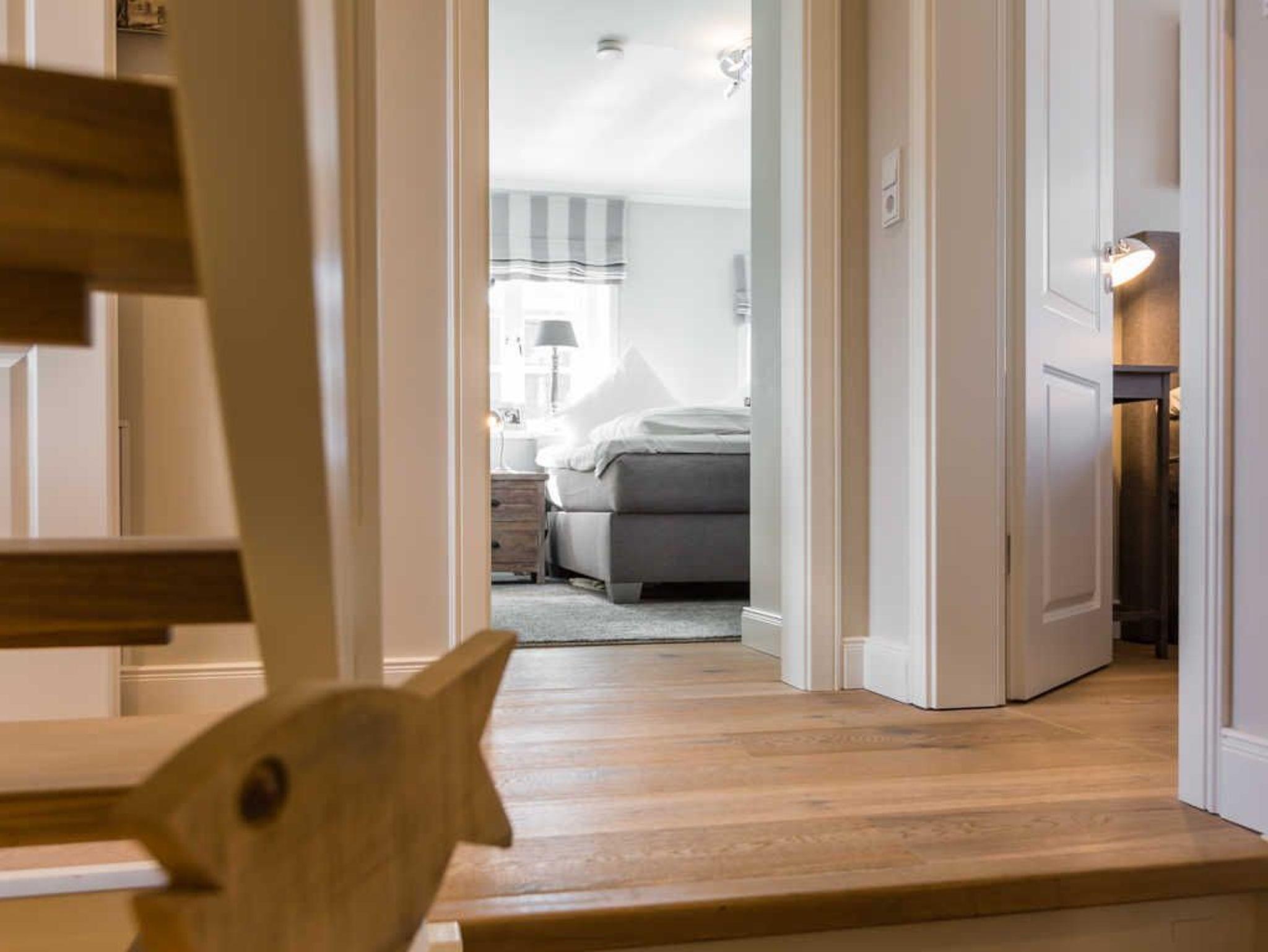 Über eine Wendeltreppe gelangen Sie zu den drei separaten, individuell eingerichteten Schlafzimmern im Obergeschoss. Die hochwertigen Doppelbetten gewährleisten tiefen, gesunden Schlaf. Ebenso komfortabel ist das Bad / WC eingerichtet. Ein Gäste-WC ergänzt die Räumlichkeiten.