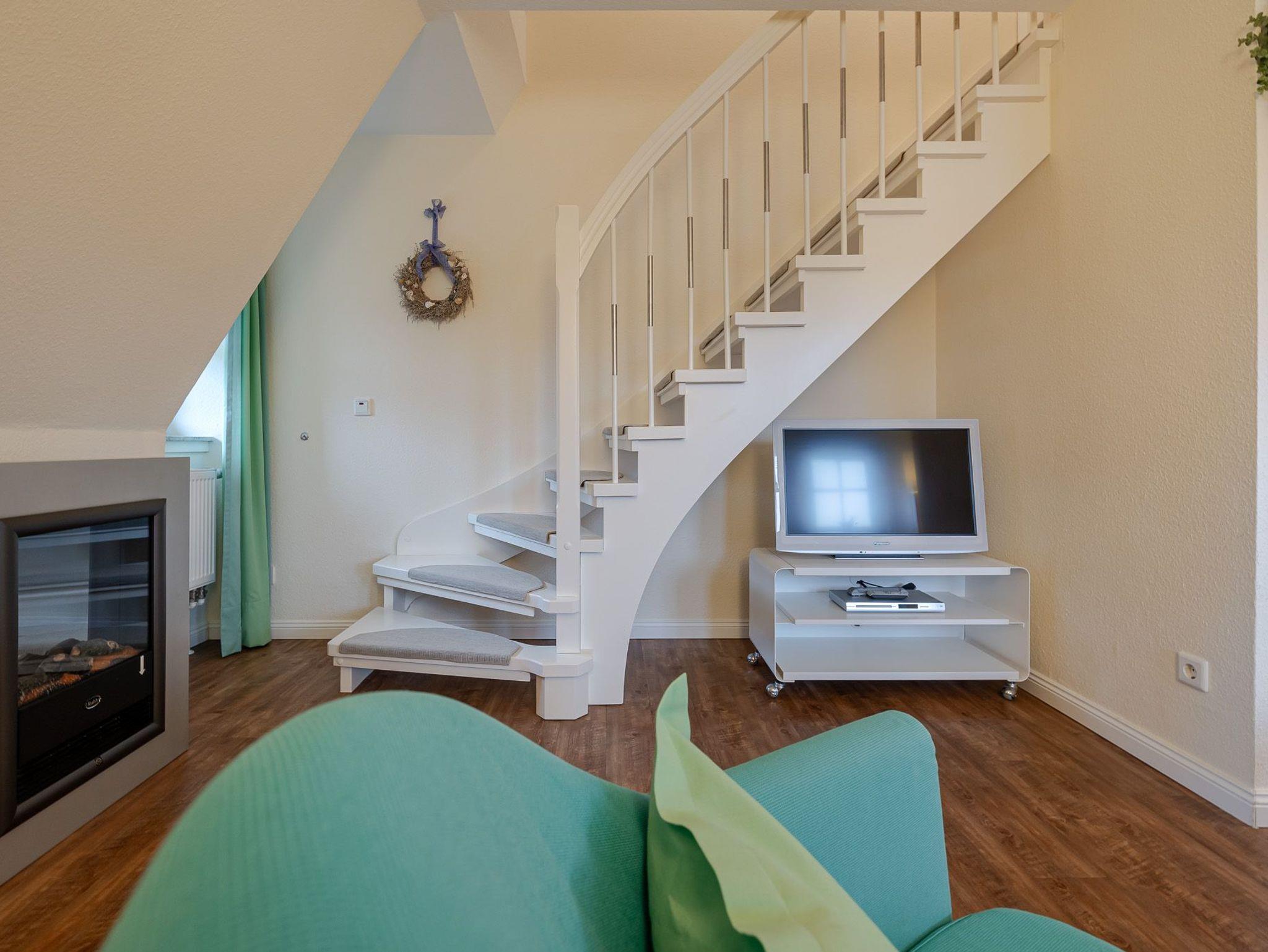 Wohnzimmer mit einer angeschlossenen offenen Küche ? zahlreiche Sitzgelegenheiten laden zu entspannten Stunden zu jeder Tageszeit ein. Es gibt weiterhin ein Schlafzimmer mit Doppelbett und ein Duschbad. Im oberen Stockwerk befinden sich ein weiterer Schlafraum sowie